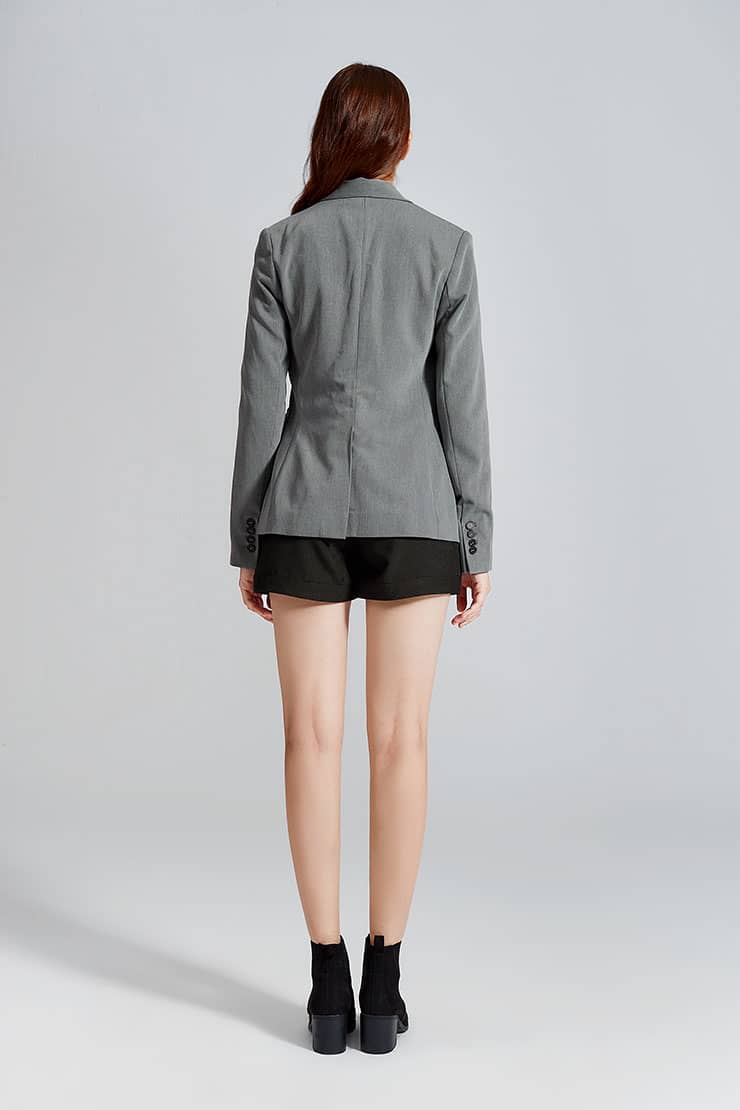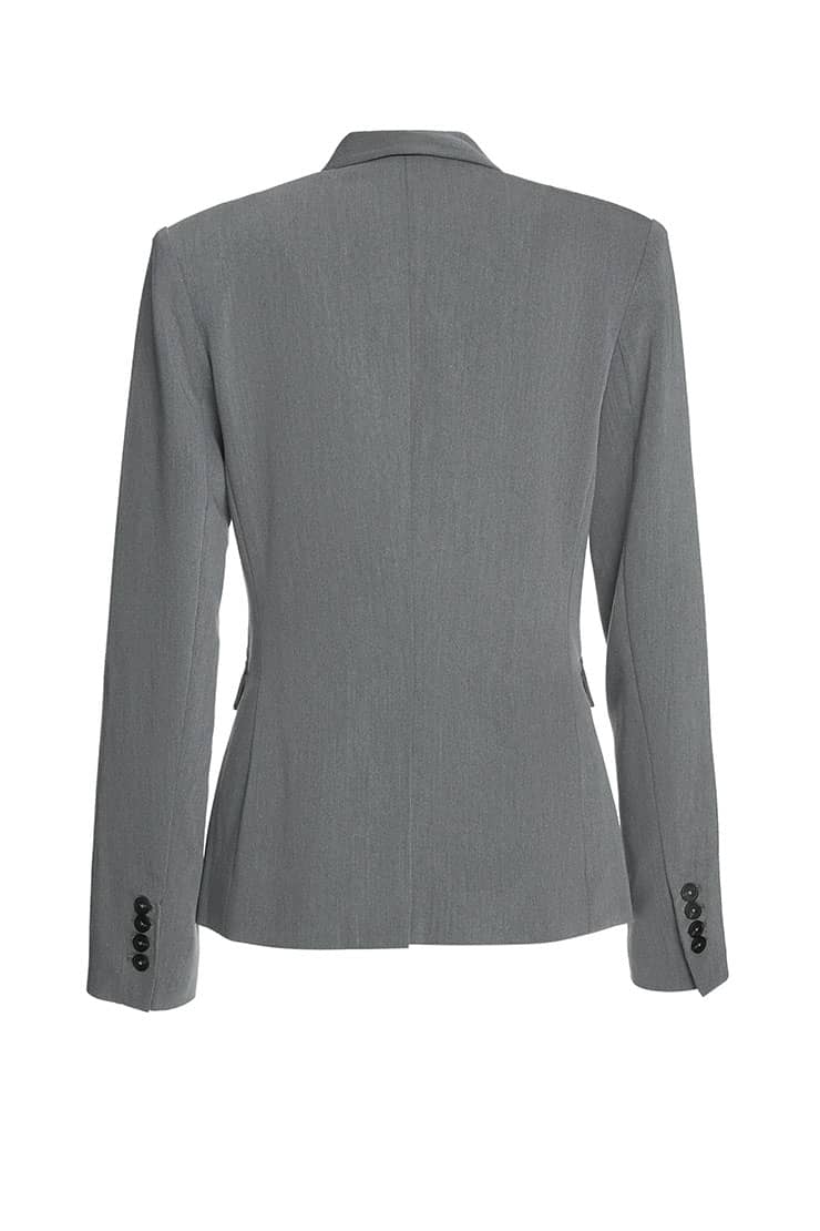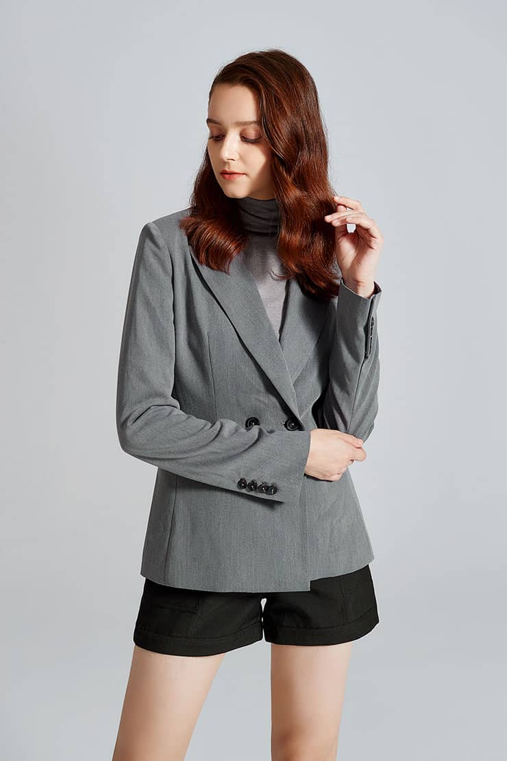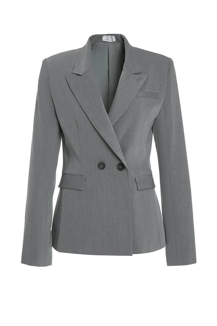 翻驳领,两粒双排扣门襟,镶嵌袋盖一字袋,四粒饰扣西装长袖,三开身腰省自然收腰,垫肩塑形,平直下摆,合体收腰西装外套廓形,细节简约个性;易打理的混纺面料,穿着舒适有型。