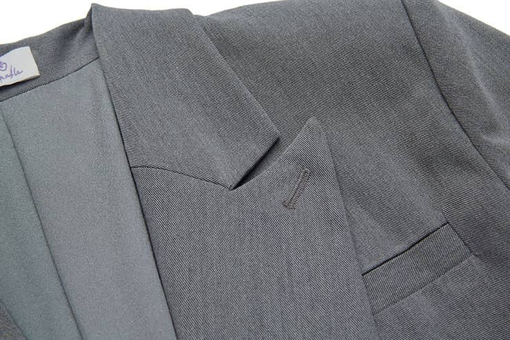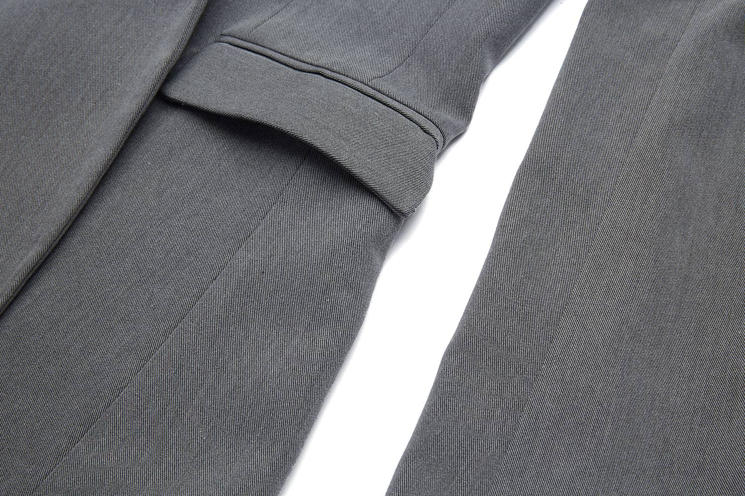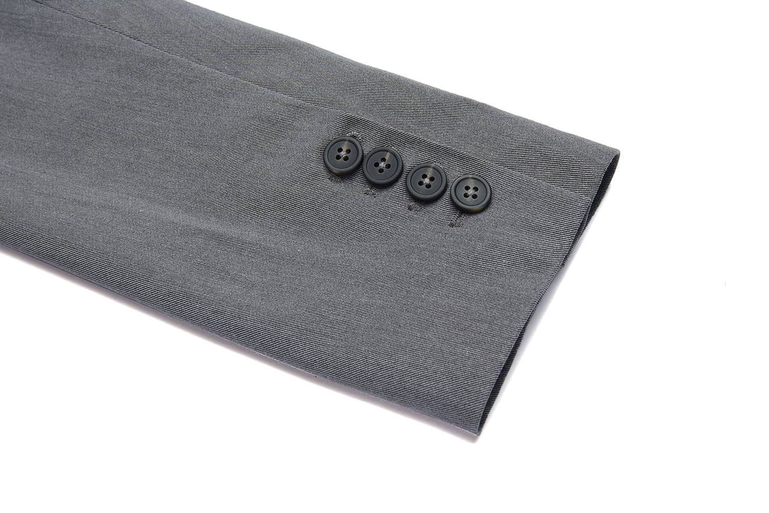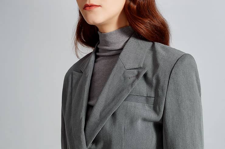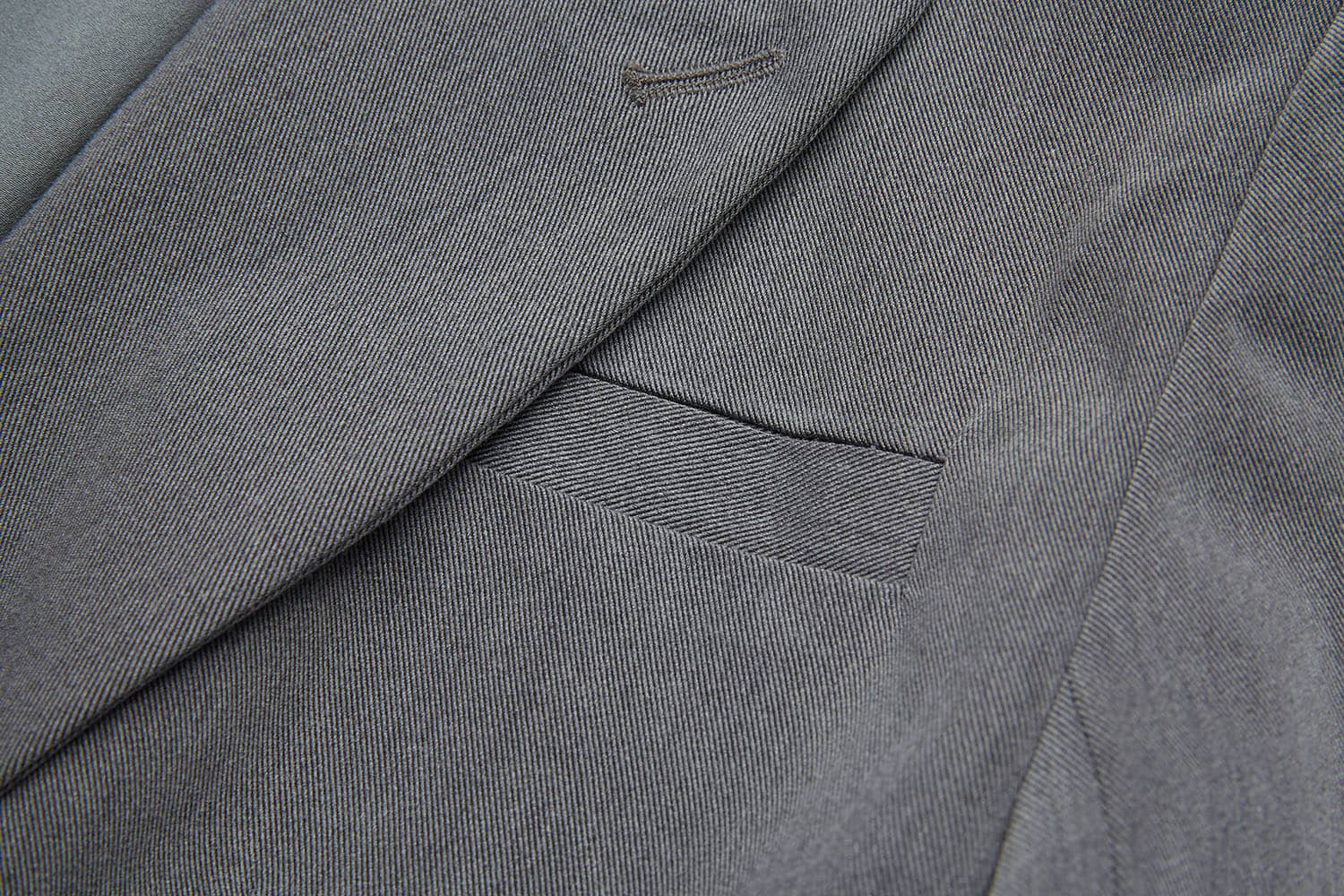 翻驳领,两粒双排扣门襟,镶嵌袋盖一字袋,四粒饰扣西装长袖,三开身腰省自然收腰,垫肩塑形,平直下摆,合体收腰西装外套廓形,细节简约个性;易打理的混纺面料,穿着舒适有型。