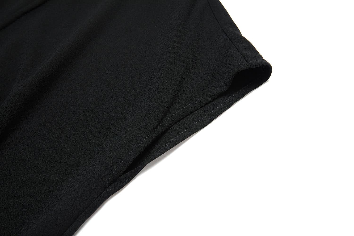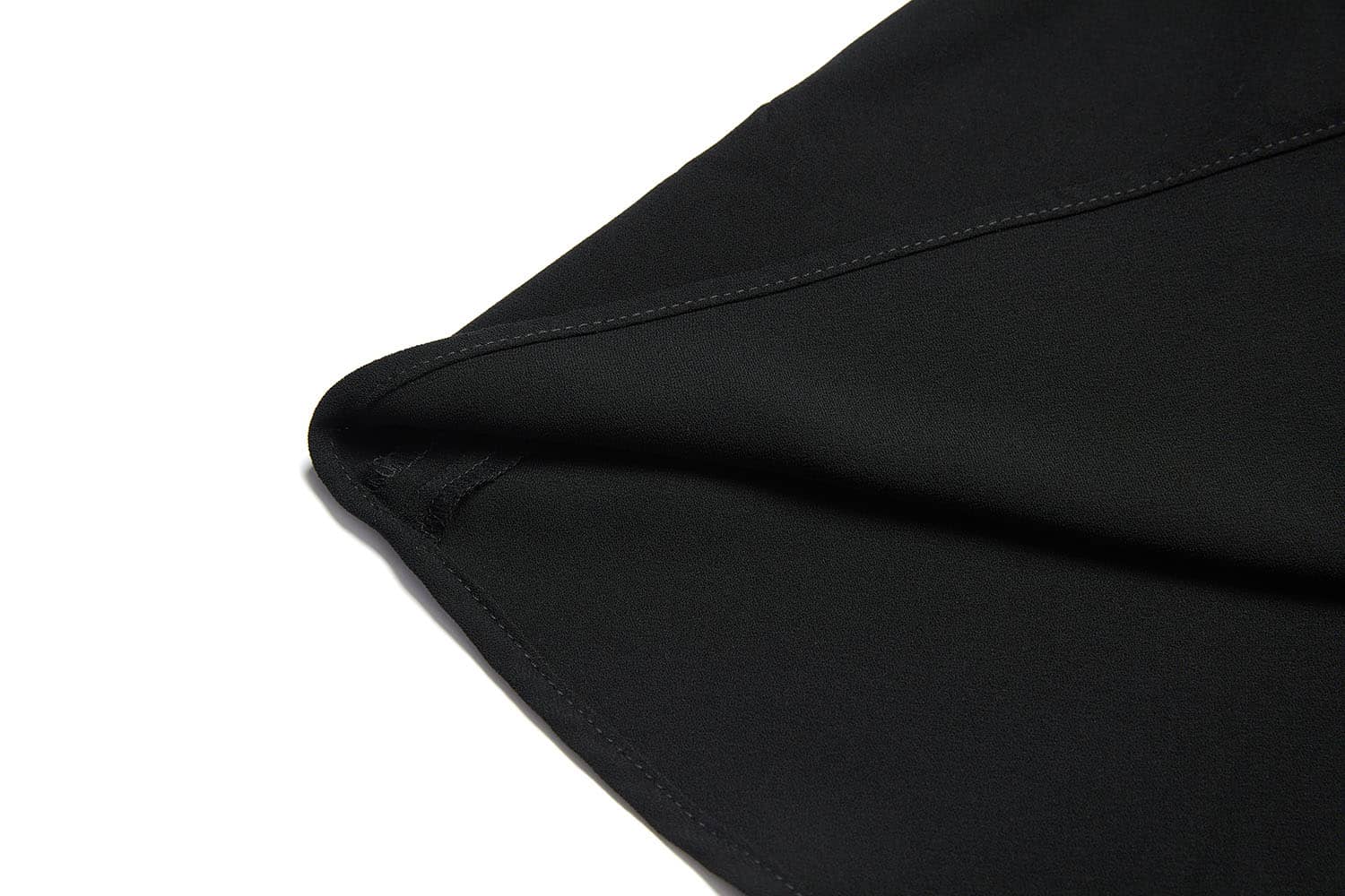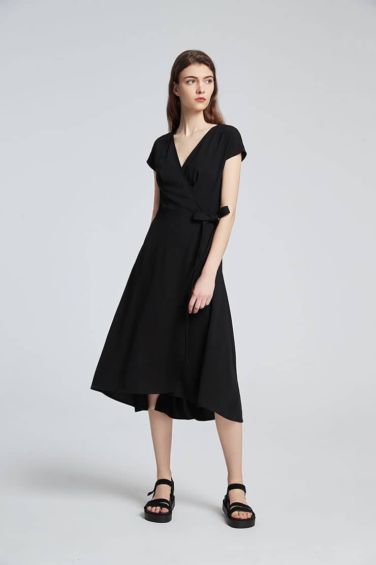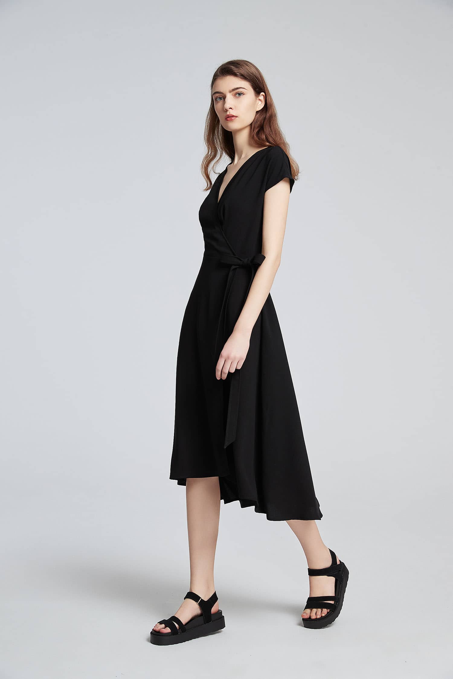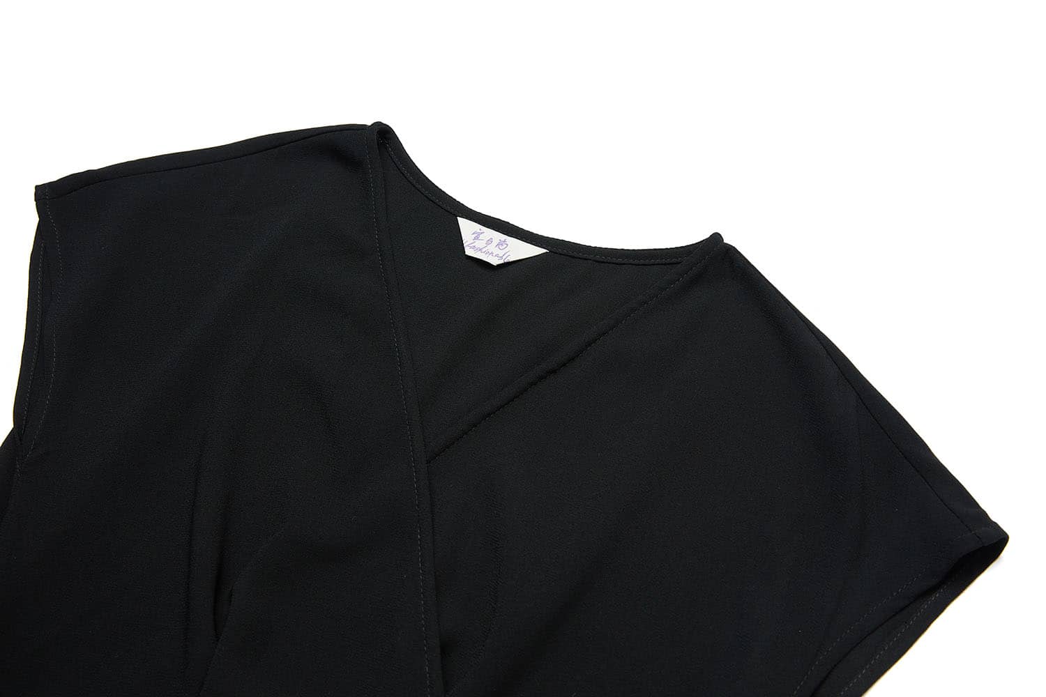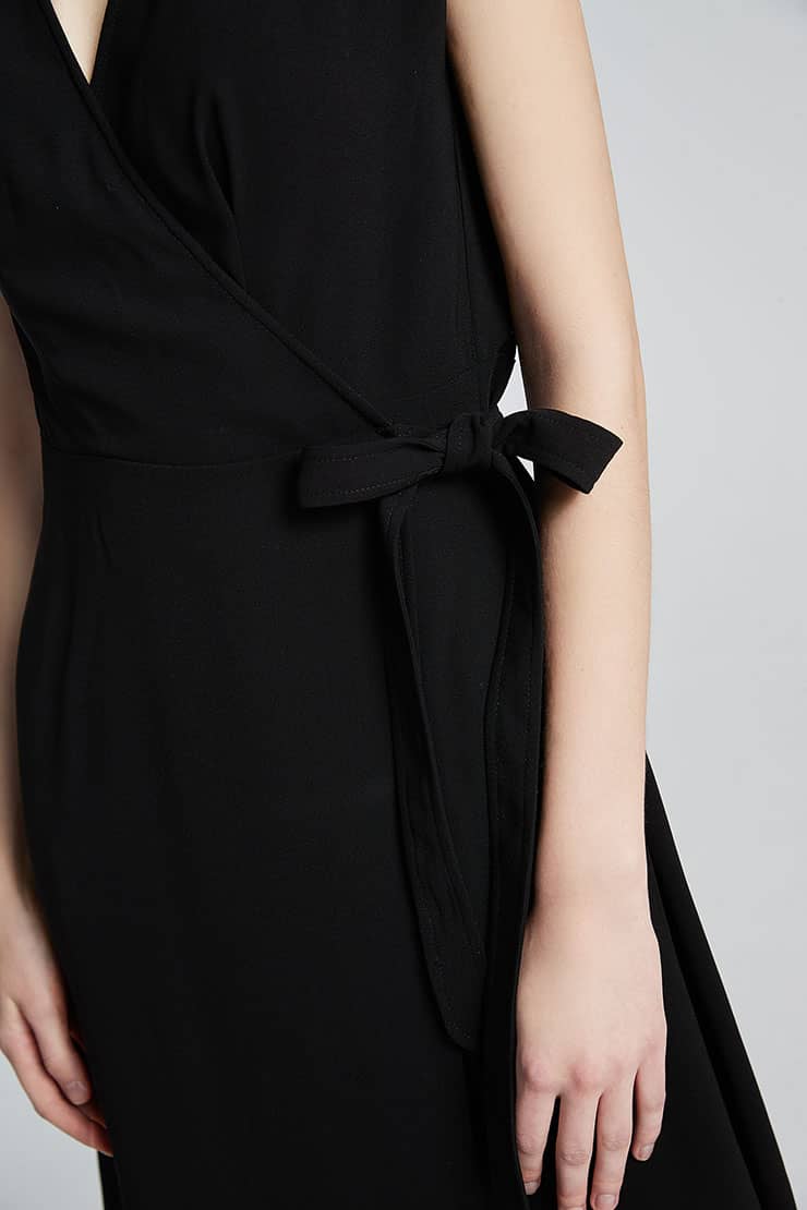 叠交式V领,落肩无袖,褶裥包裹门襟收腰;腰间绑带,廓形立体;聚酯纤维面料,抗皱好打理。