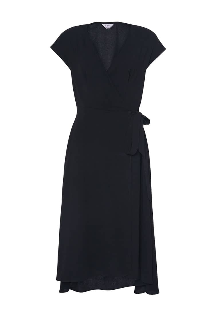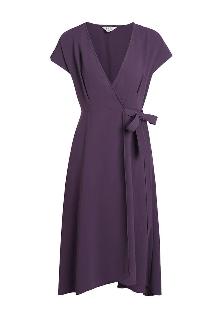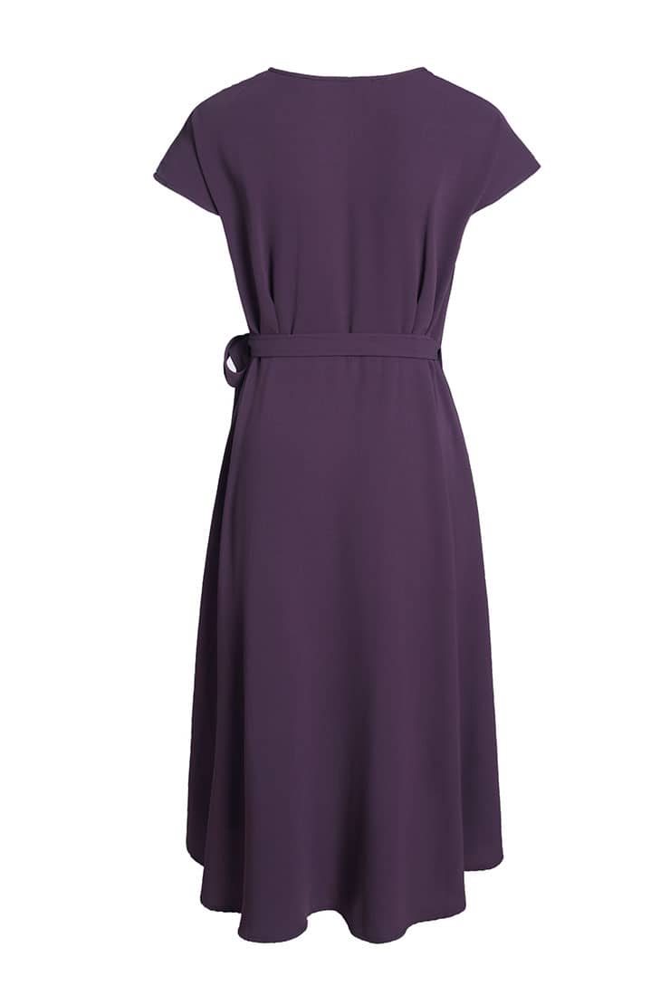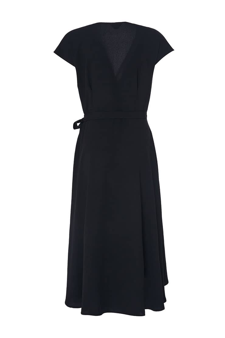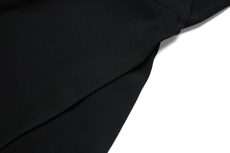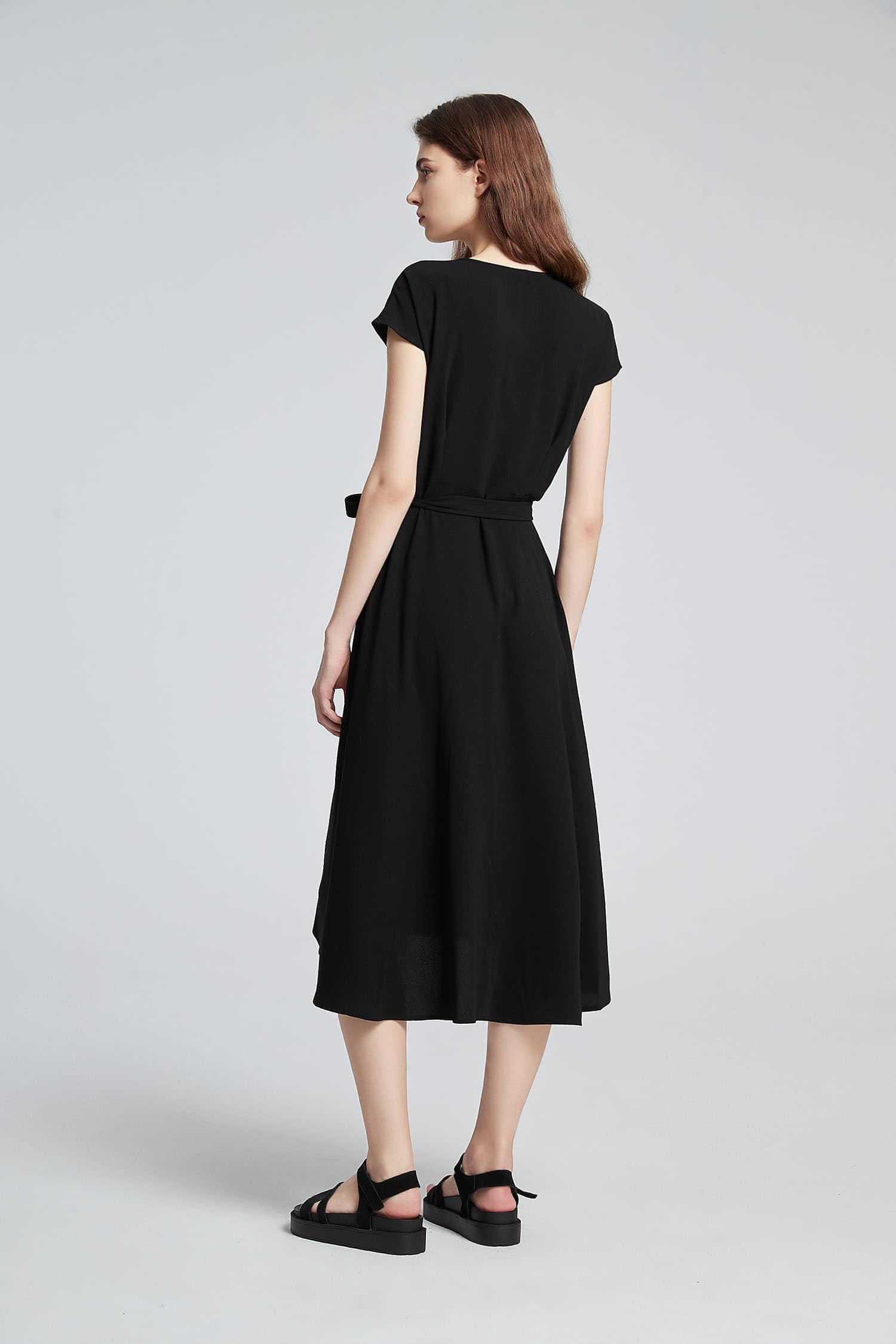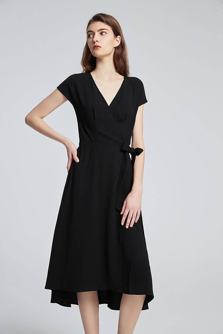叠交式V领,落肩无袖,褶裥包裹门襟收腰;腰间绑带,廓形立体;聚酯纤维面料,抗皱好打理。