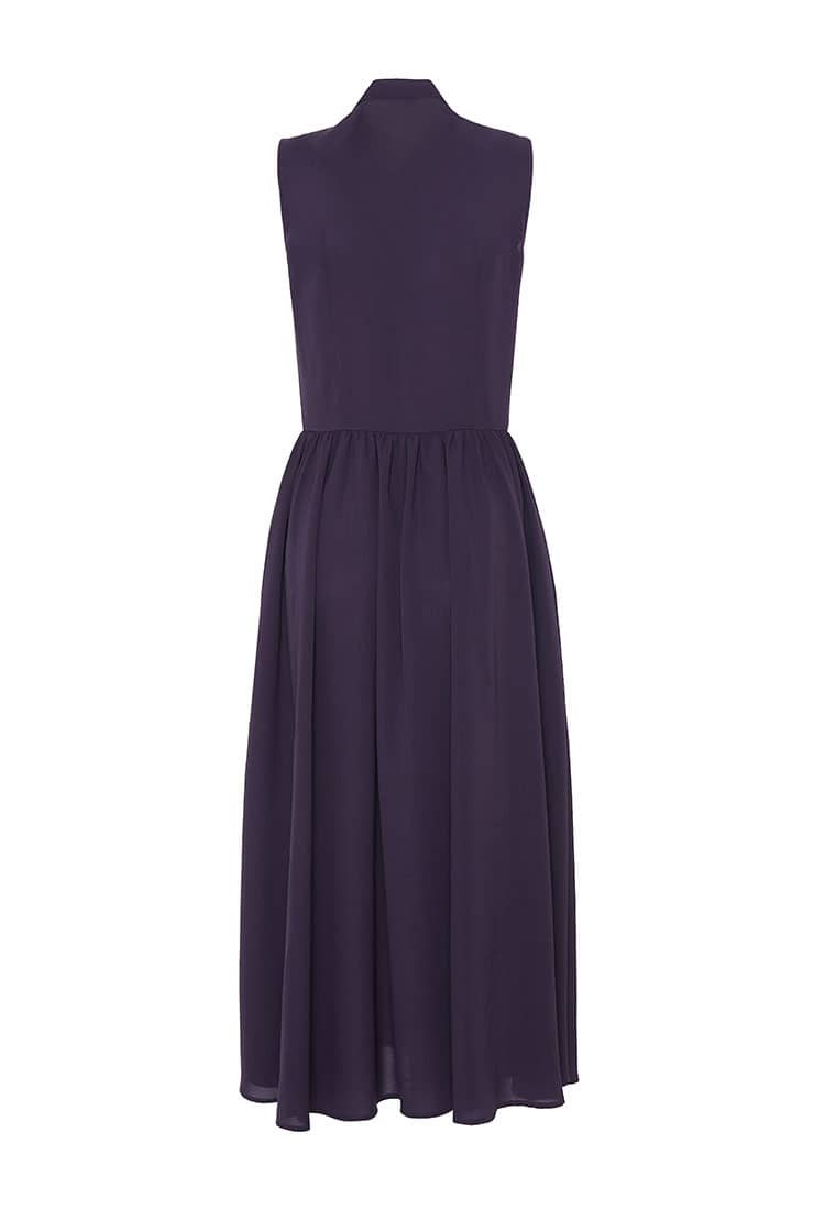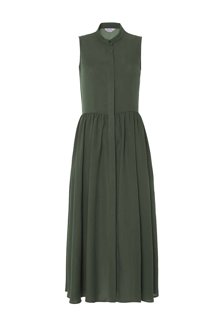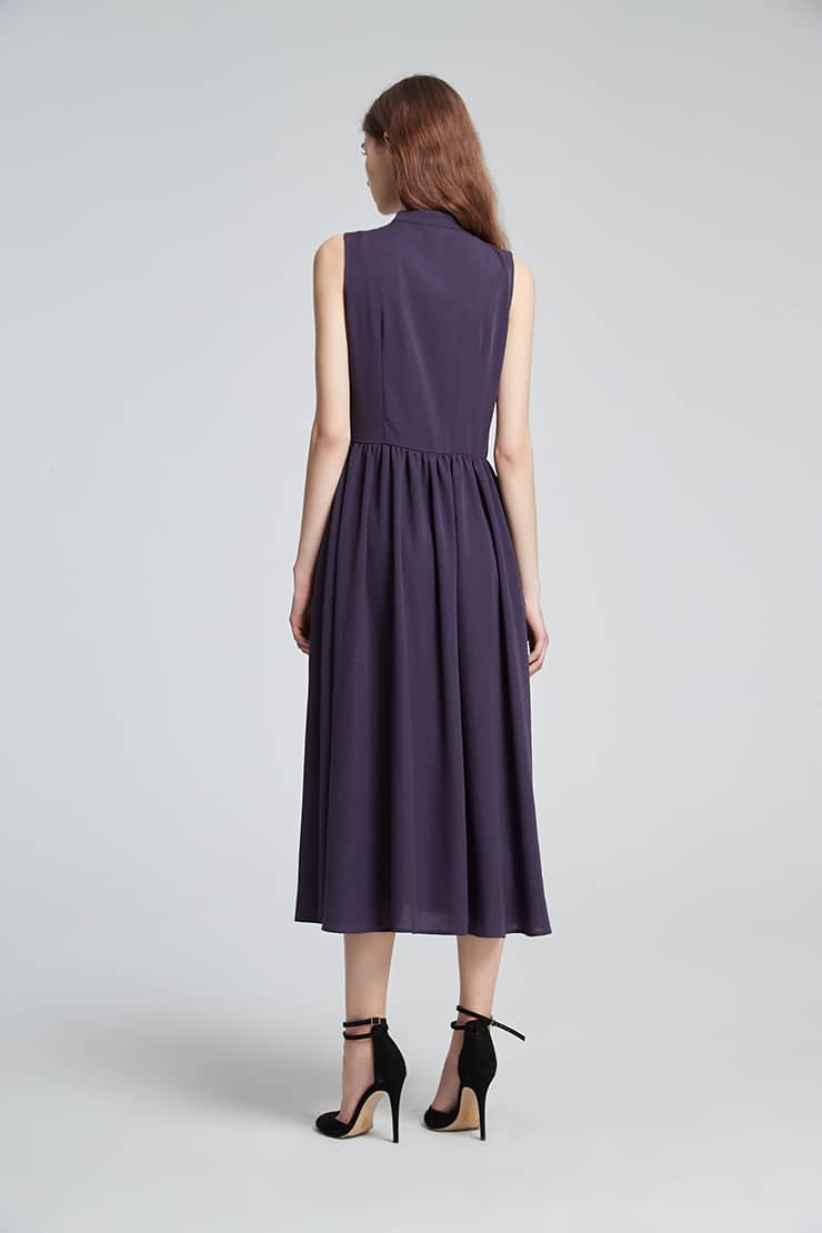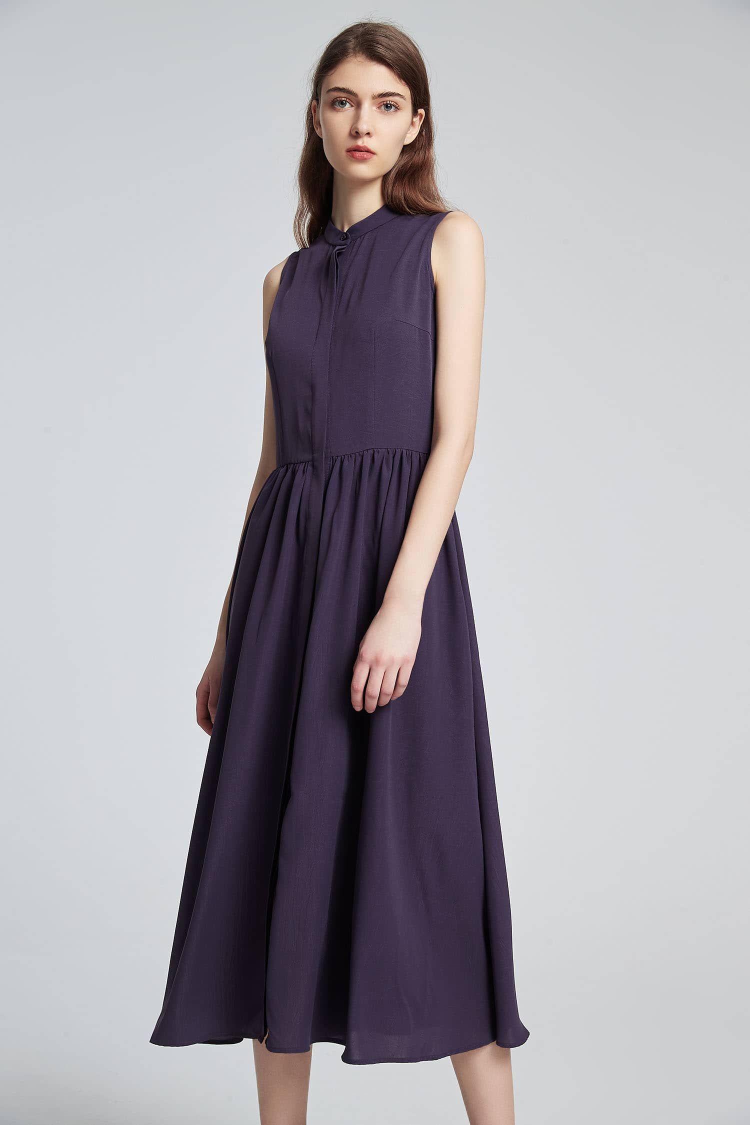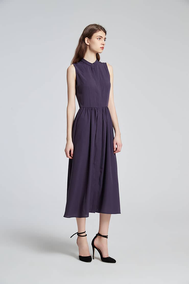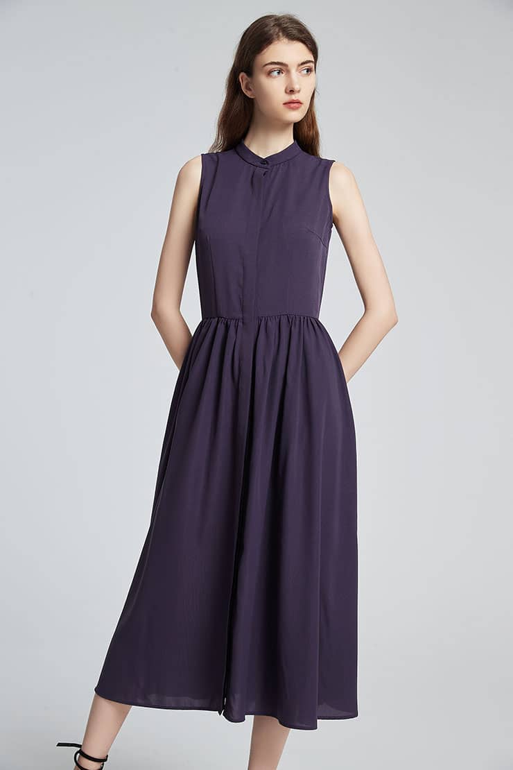 小立领,无袖,随性的褶裥收腰,过膝裙长,宽松的裙摆,款式干练简洁;光滑舒爽的聚酯纤维面料,富有悬垂性,穿着舒适。