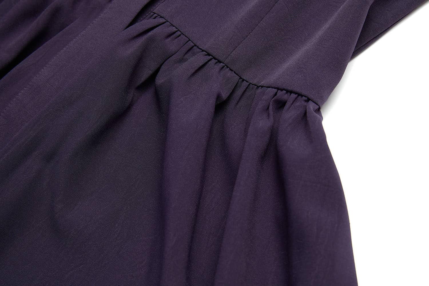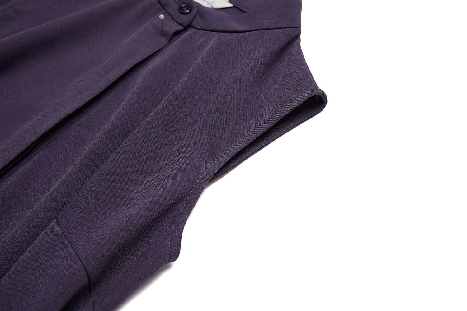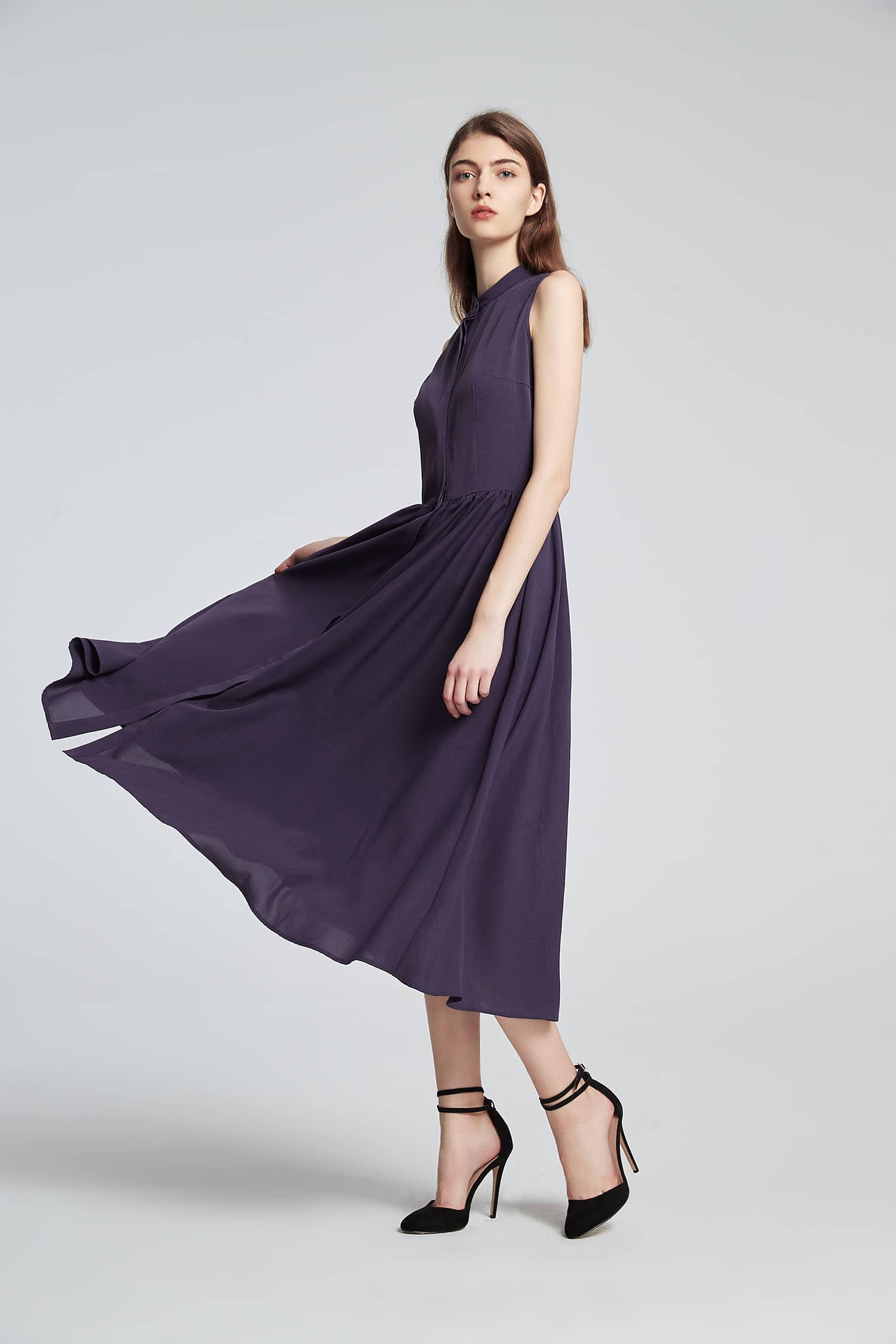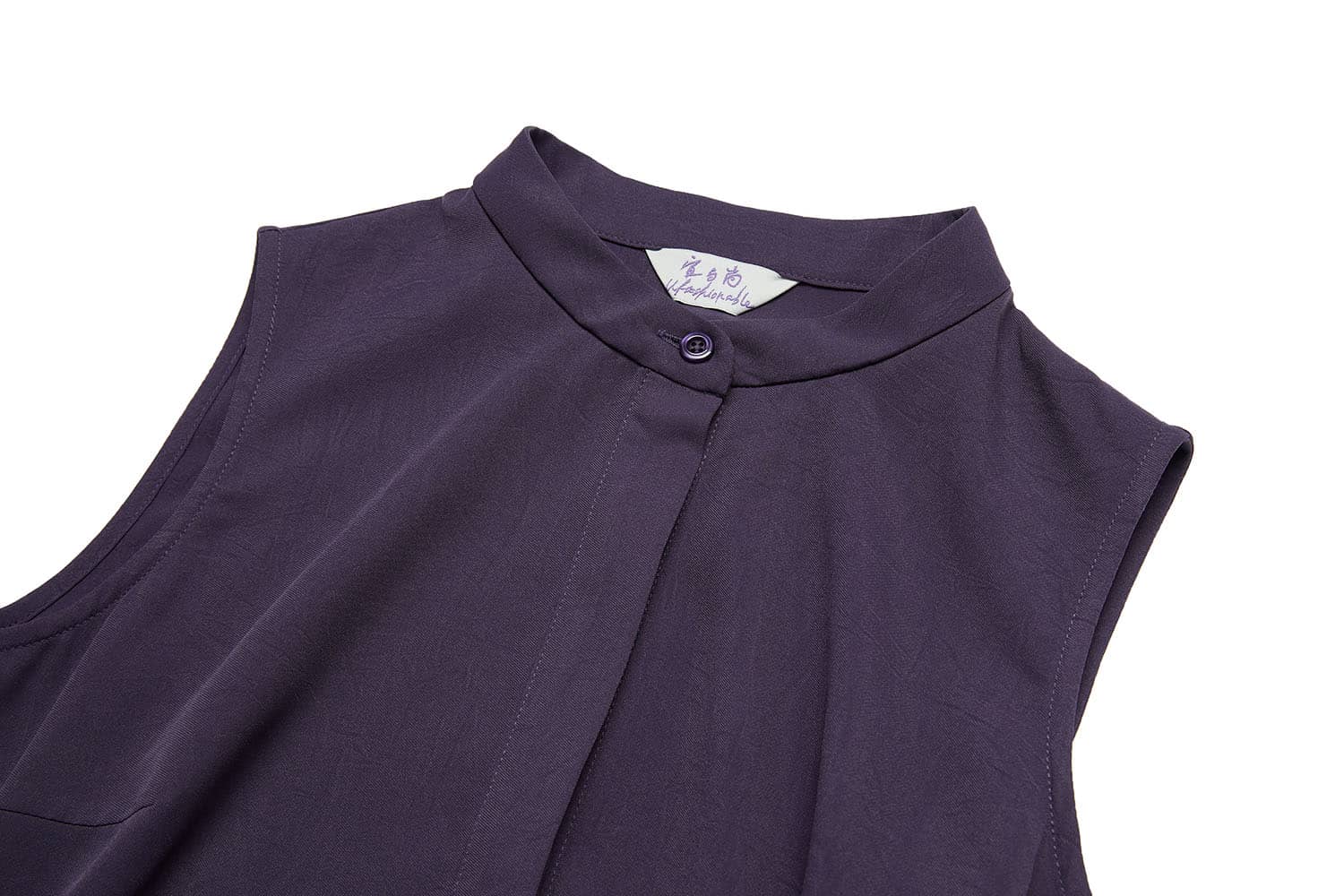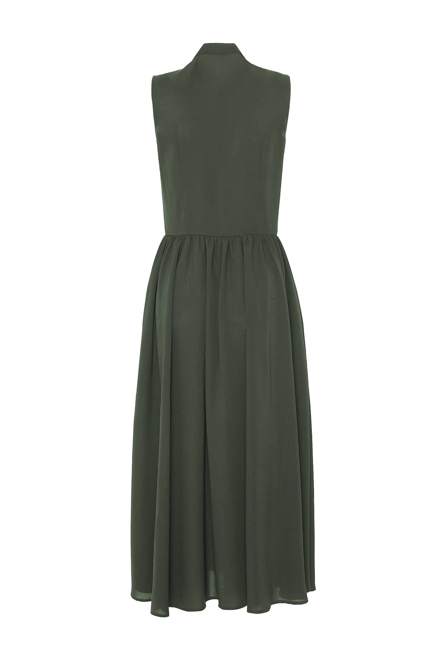 小立领,无袖,随性的褶裥收腰,过膝裙长,宽松的裙摆,款式干练简洁;光滑舒爽的聚酯纤维面料,富有悬垂性,穿着舒适。