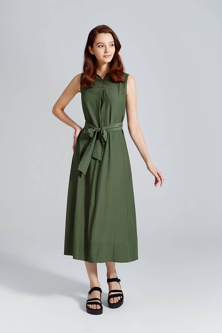 褶裥V嘴船领,简约无袖,侧缝工字褶内设手插袋;过膝及小腿中裙长,宽松A型廓形,本布腰带蝴蝶结束腰,时尚写意;柔软的化纤面料,手感细腻,具有良好的悬垂性,穿着舒适。