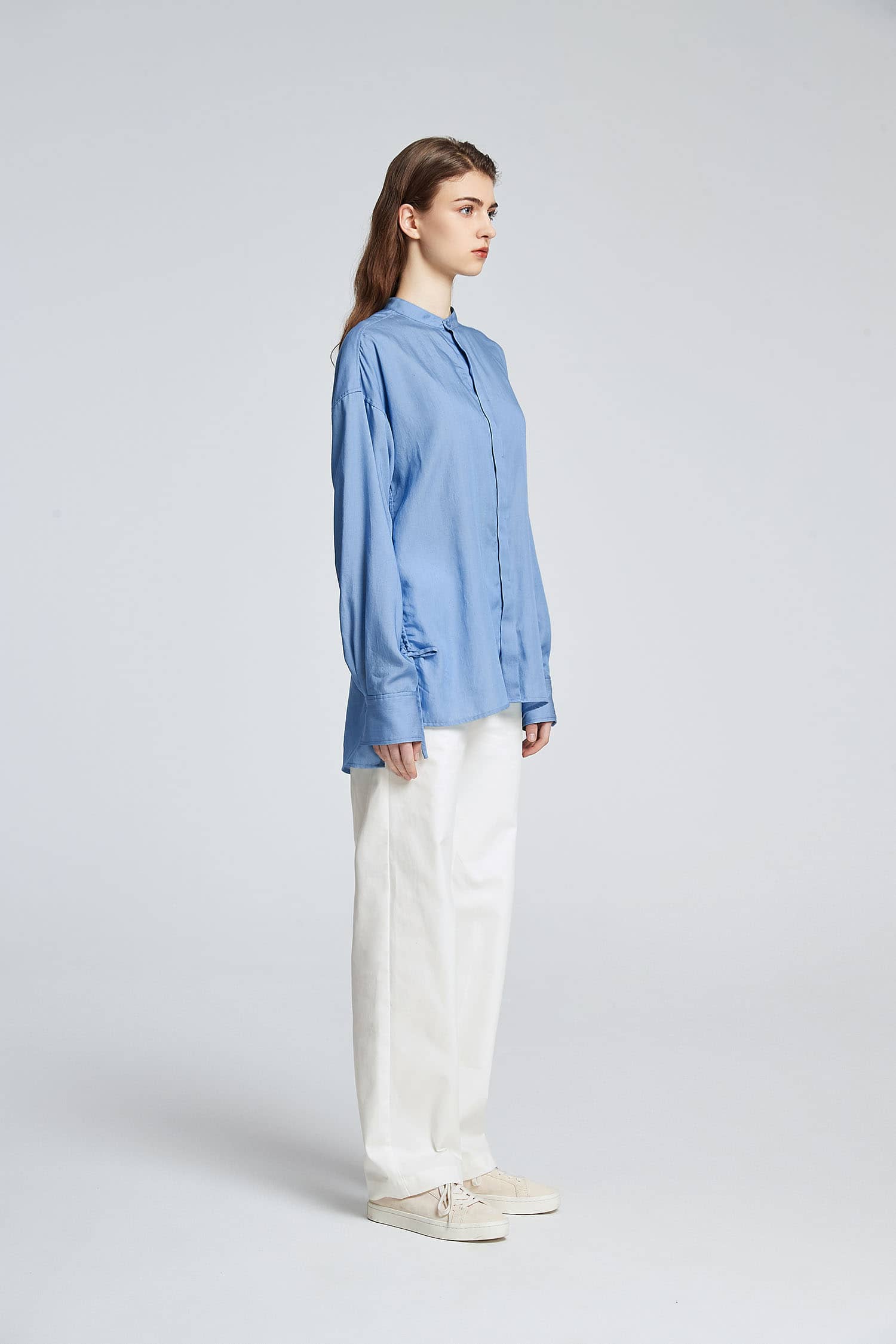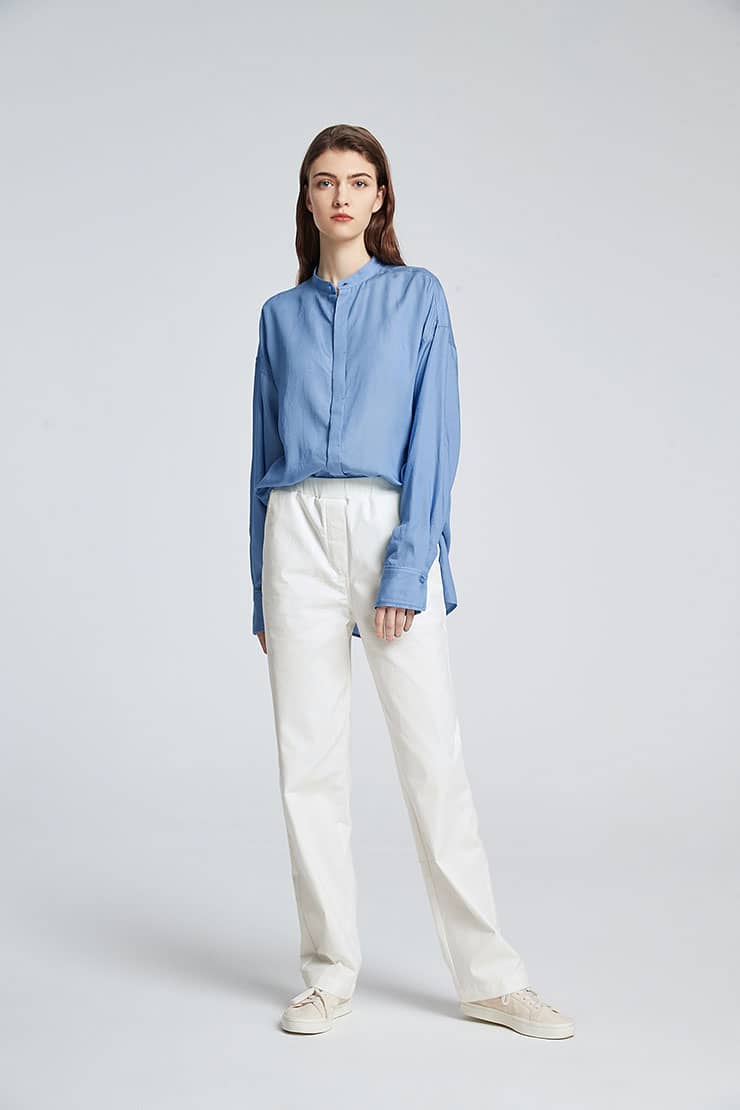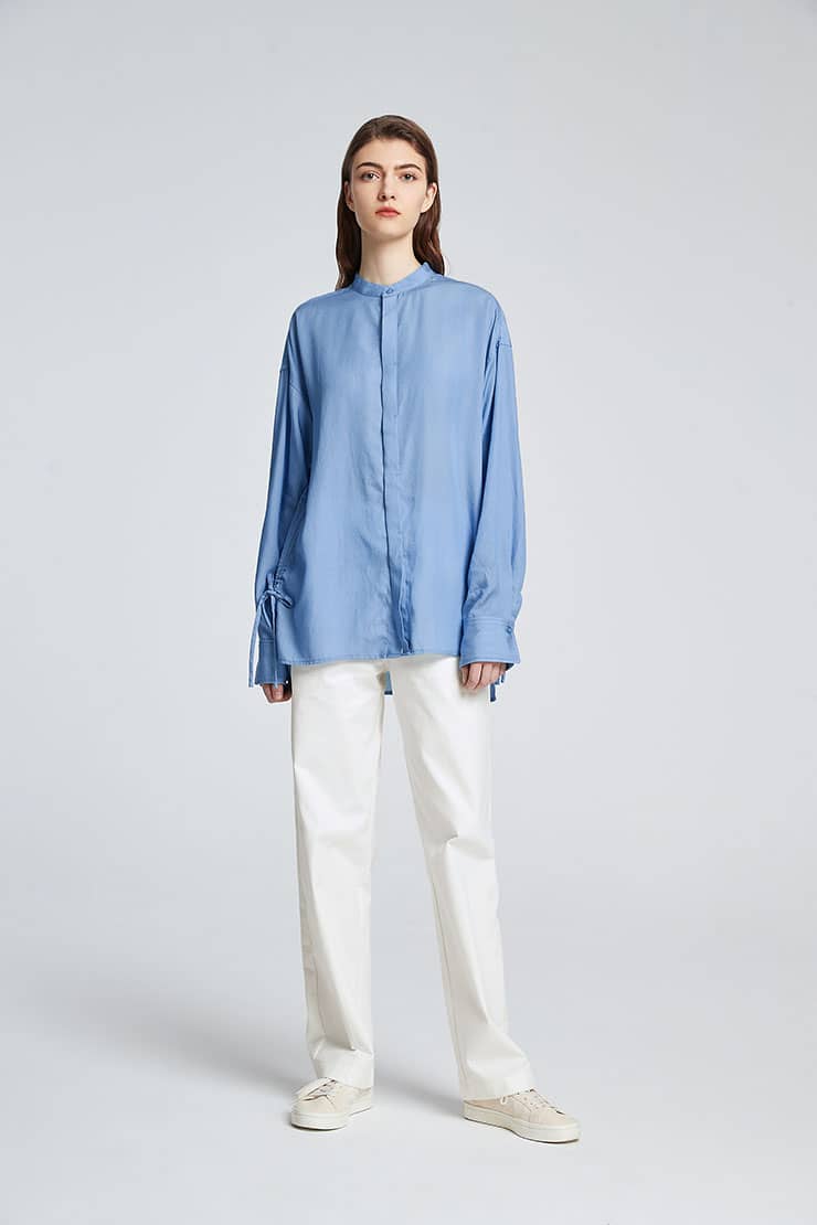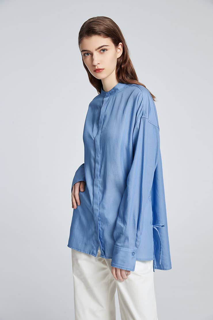 小立领,个性打枣暗门襟,落肩长袖,平直下摆,前短后长,两侧抽绳设计;纯棉衬衫面料,亲肤透气,穿着舒适。