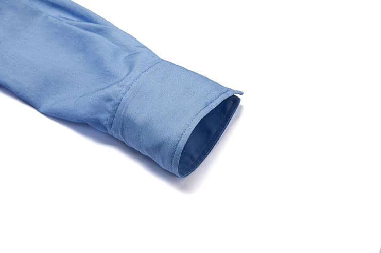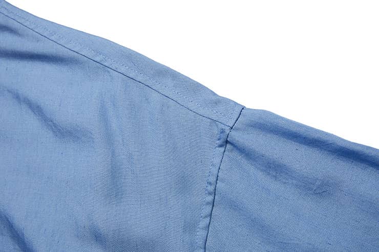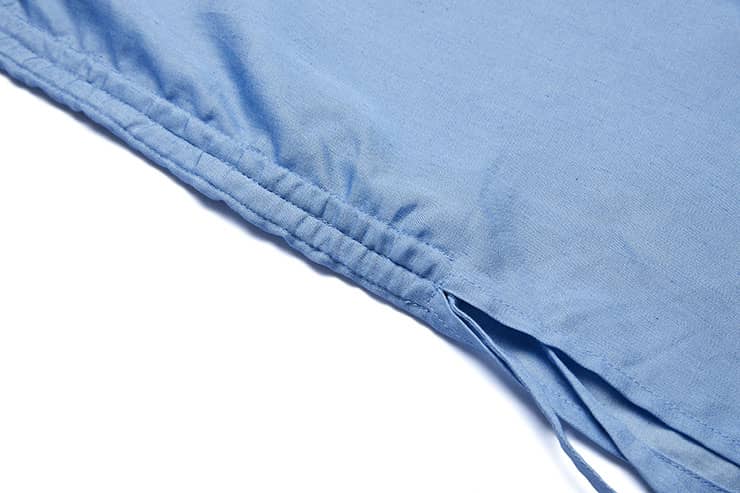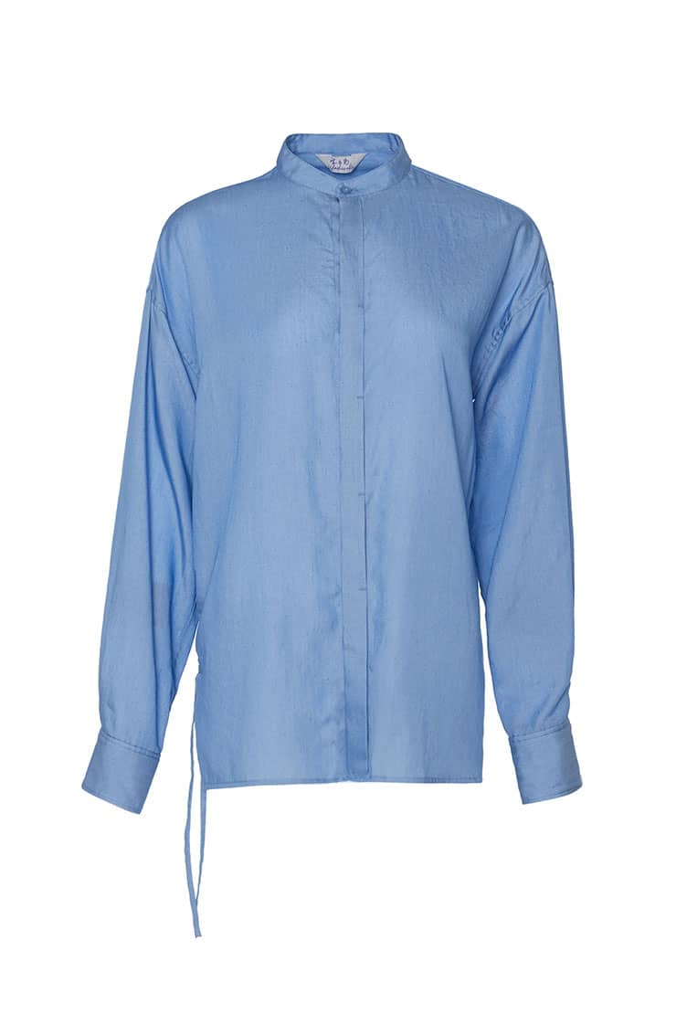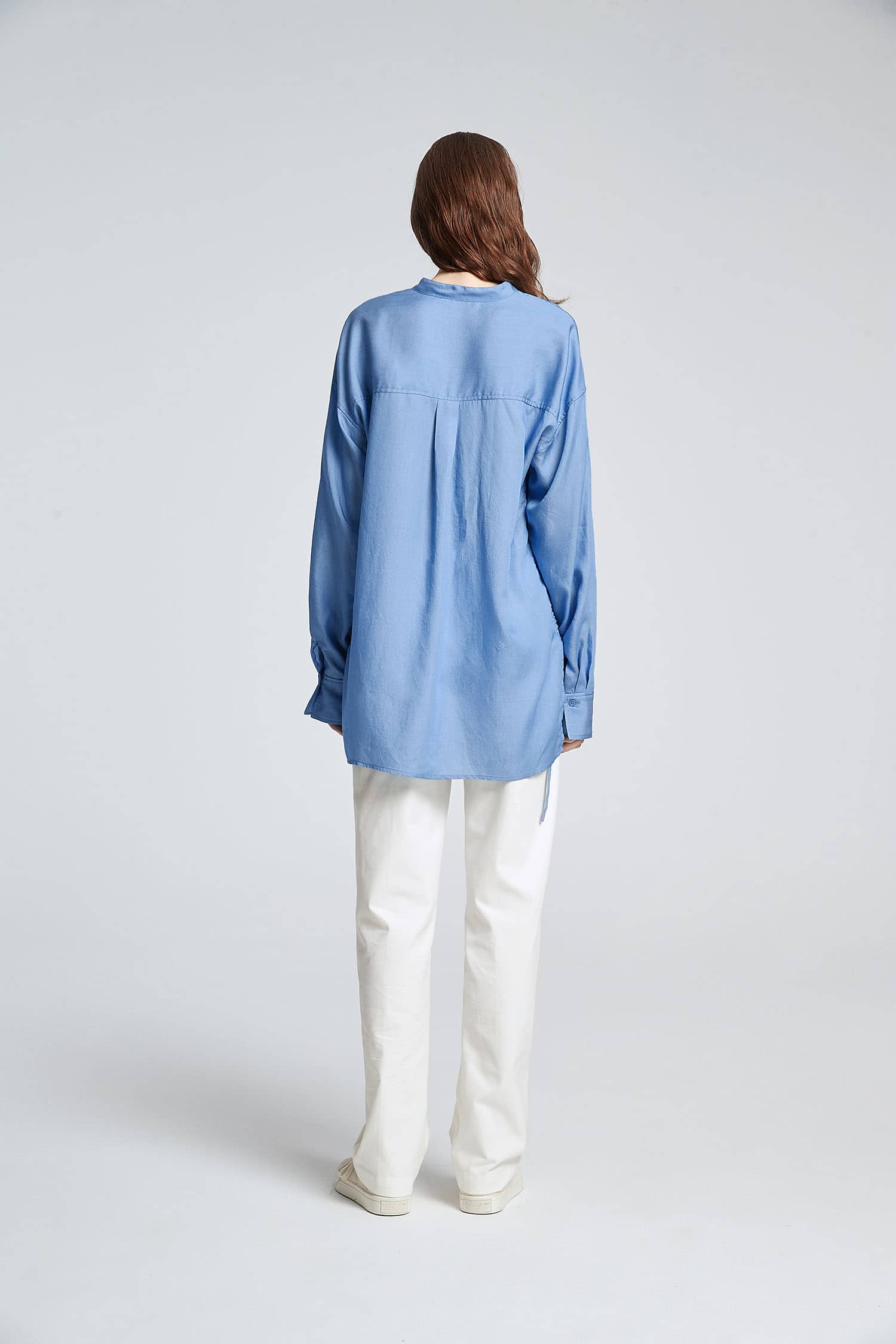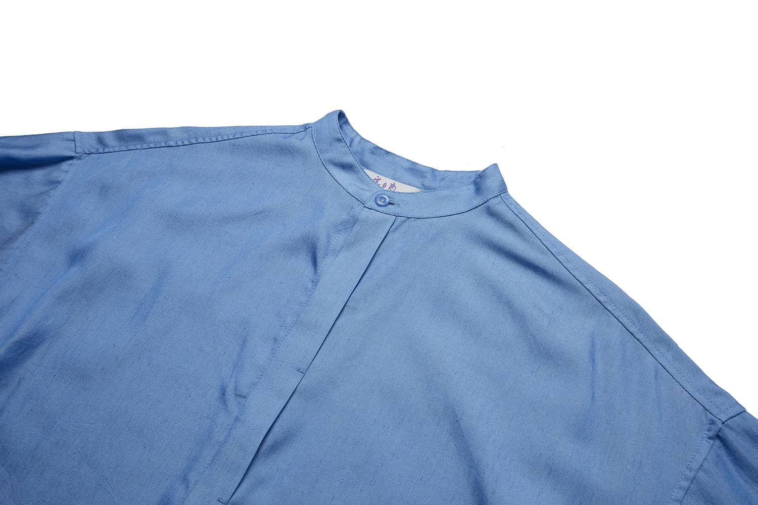 小立领,个性打枣暗门襟,落肩长袖,平直下摆,前短后长,两侧抽绳设计;纯棉衬衫面料,亲肤透气,穿着舒适。