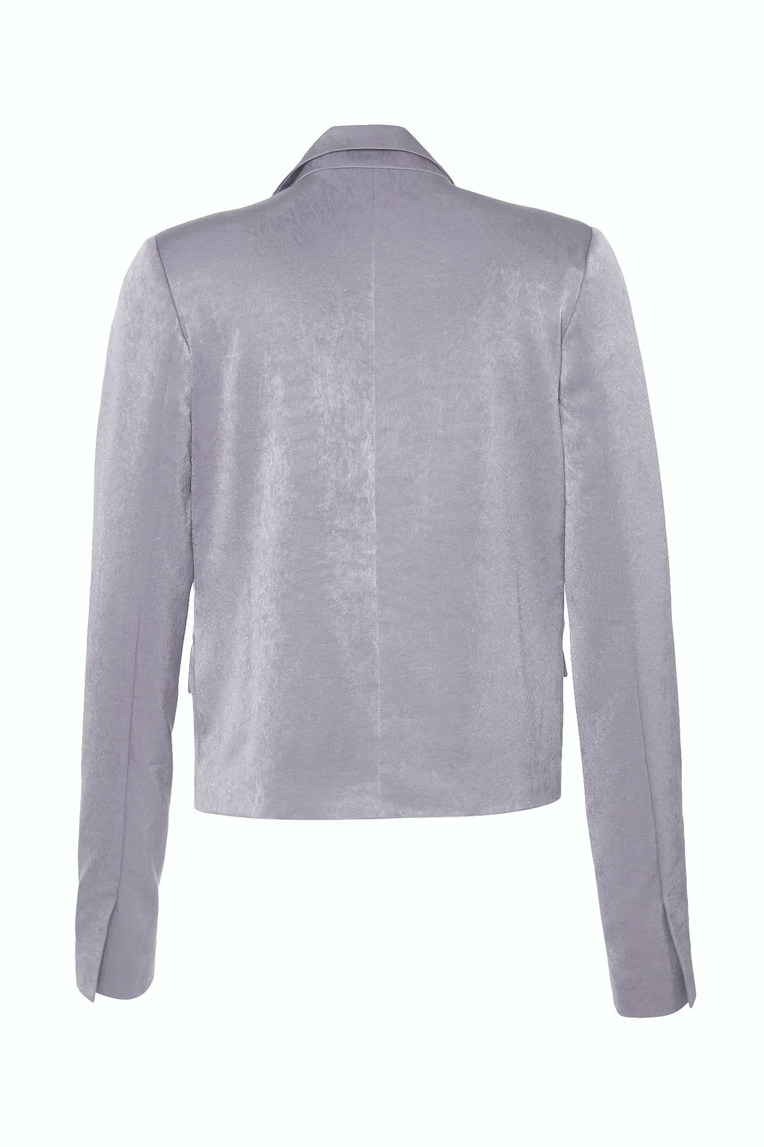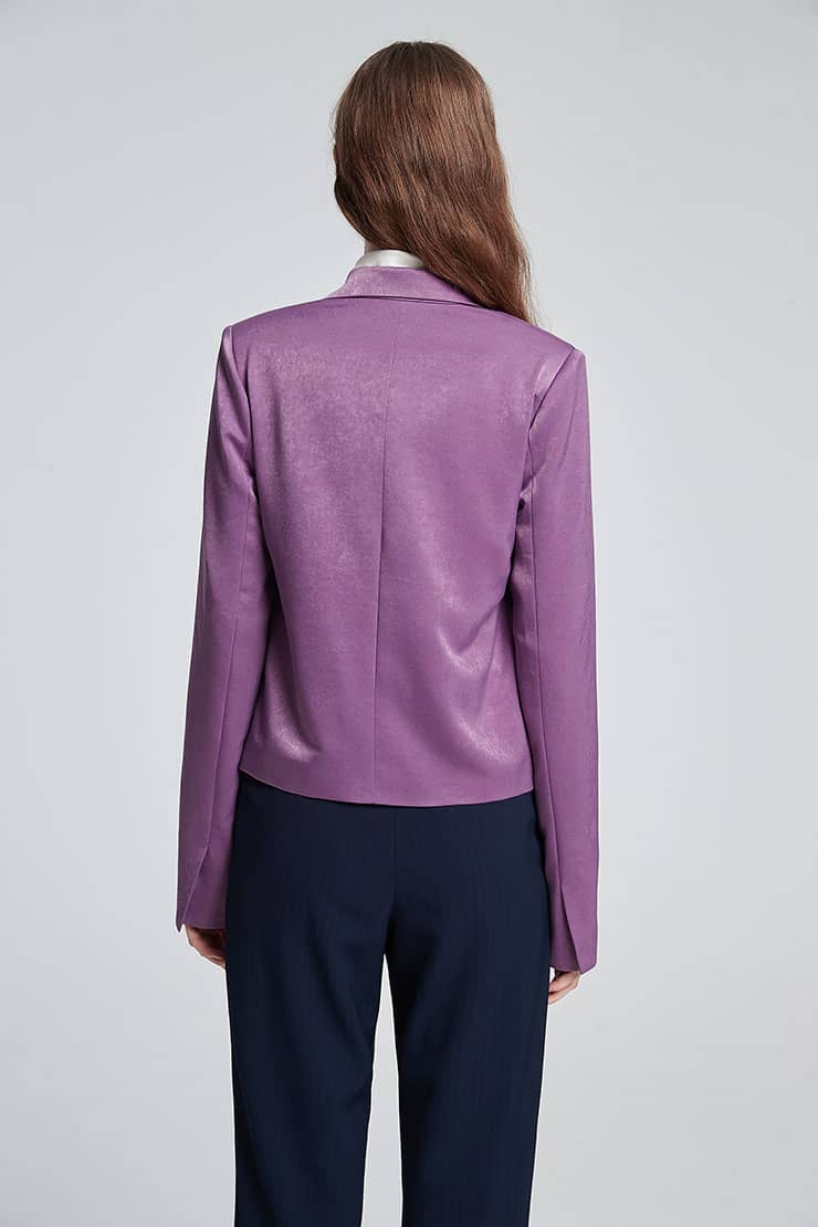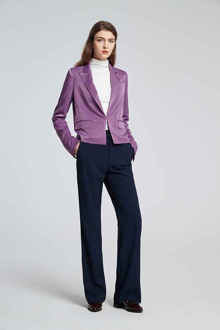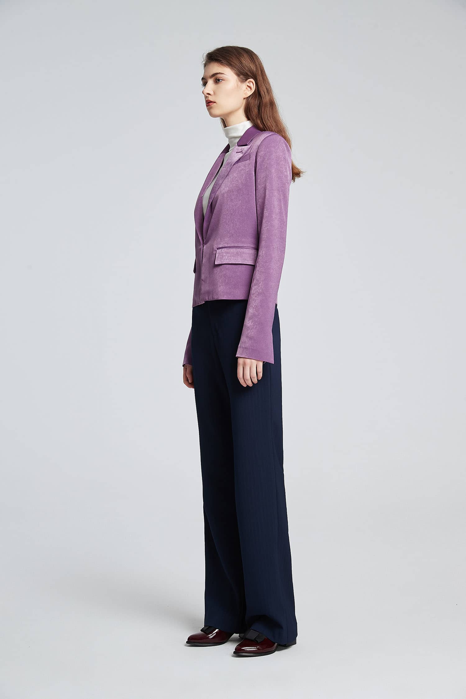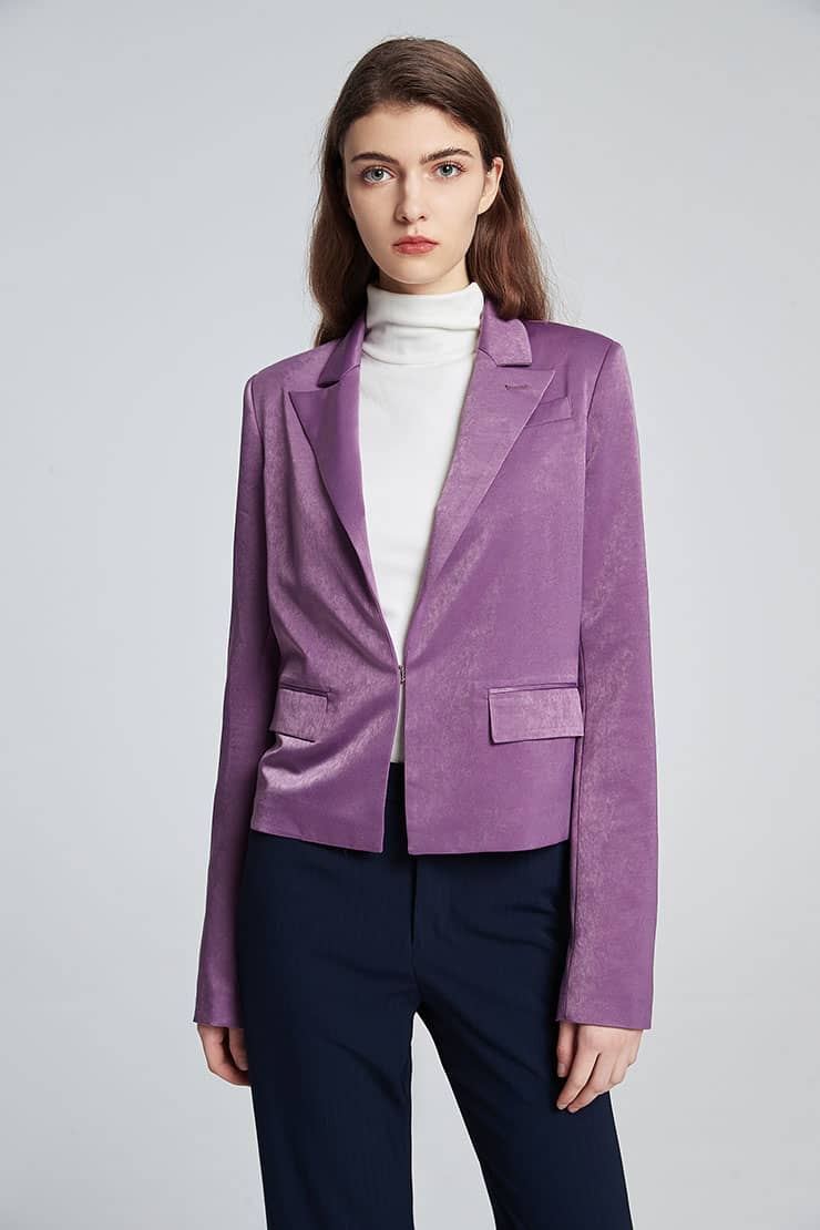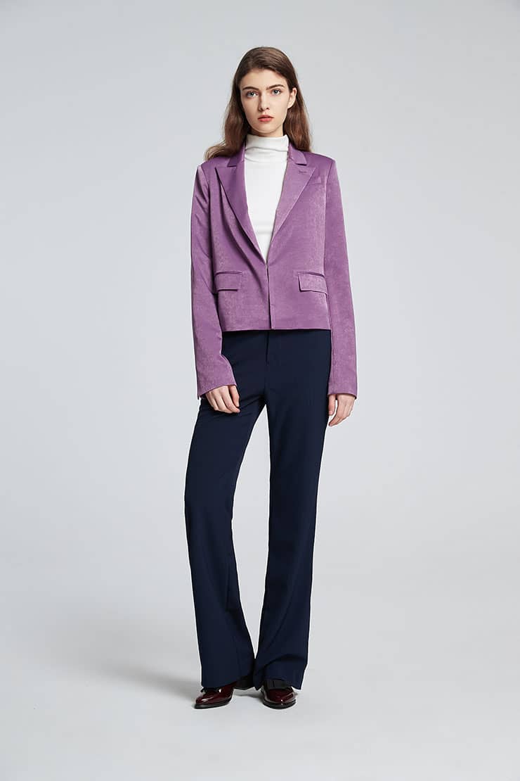 经典戗驳领,呈V字领型,内置垫肩,翻盖口袋设计,实用美观;合体的短款剪裁;前中门襟有隐形勾扣,丰富衣身经细节,兼具实用性