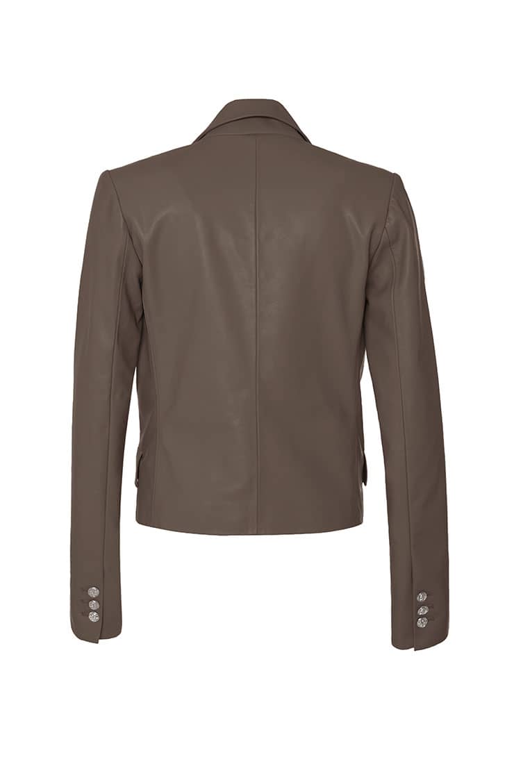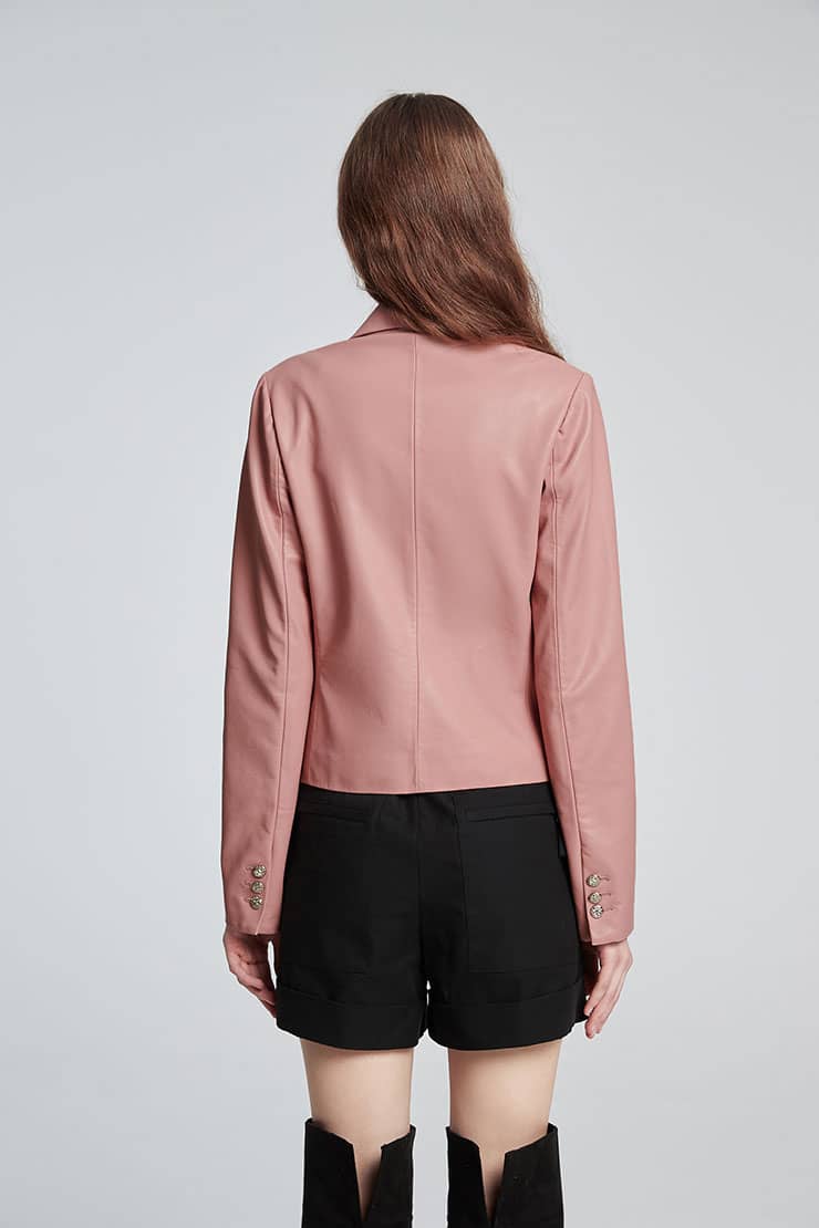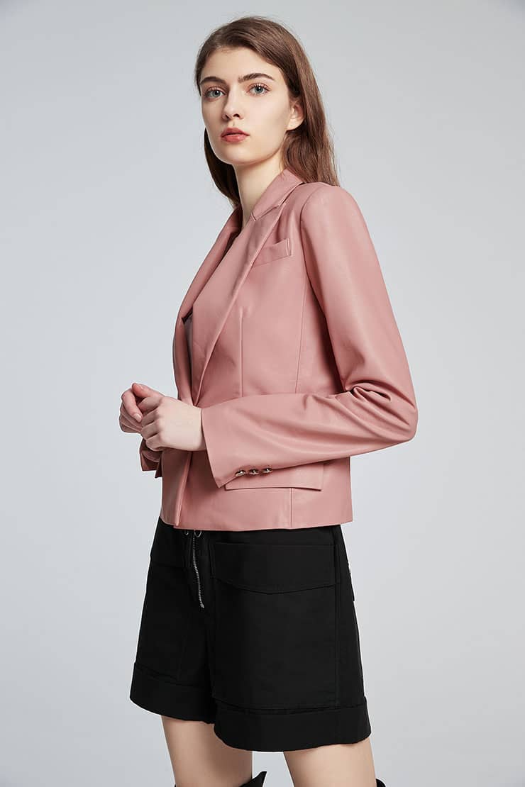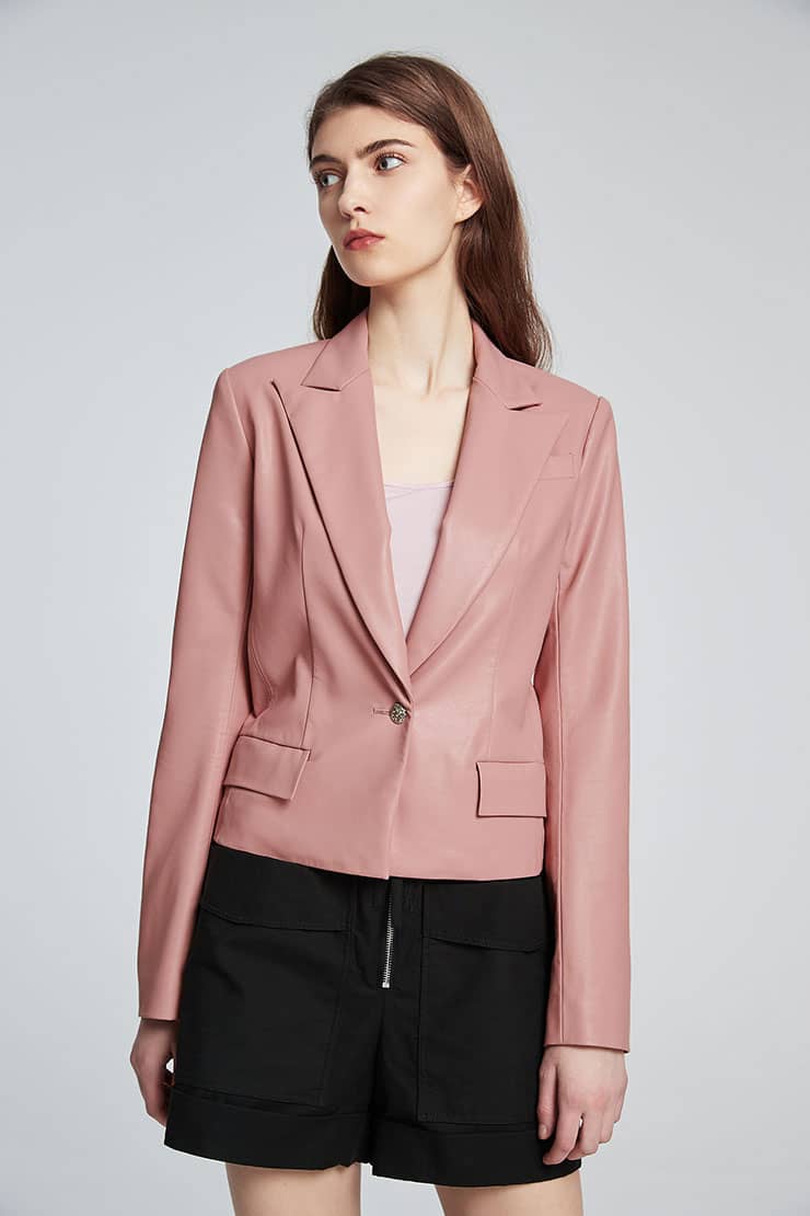 戗驳领,内置垫肩,一字口袋,西装长袖,门襟雕花金扣点缀;利落短款版型,细腻的荔枝纹皮面,低调奢华。