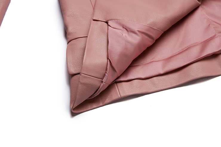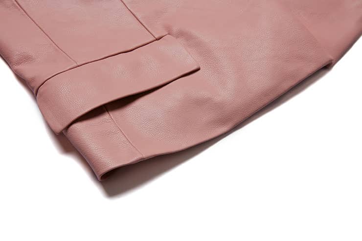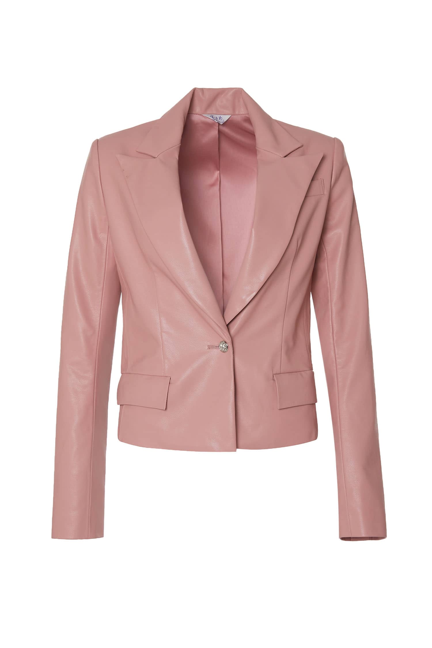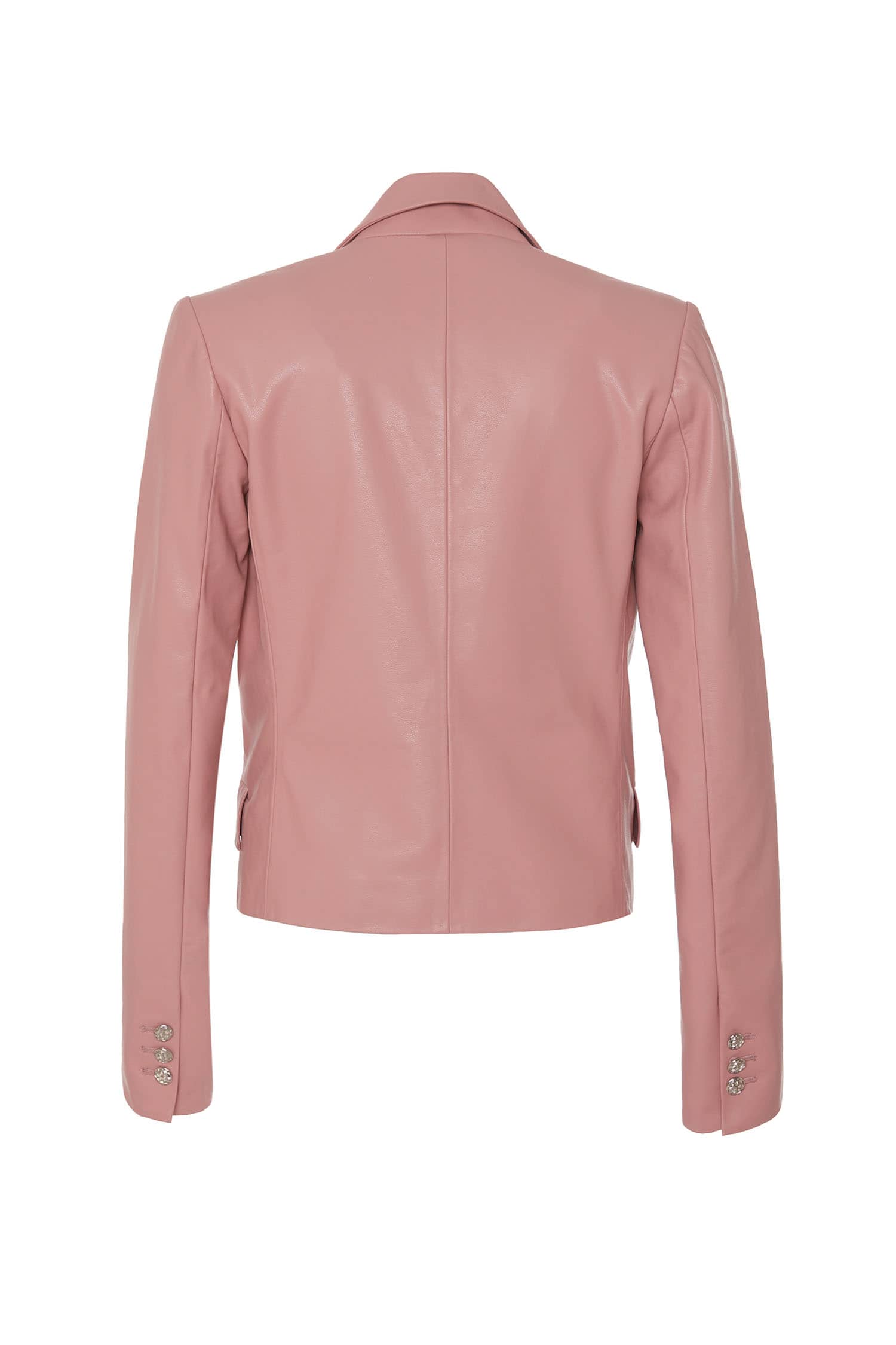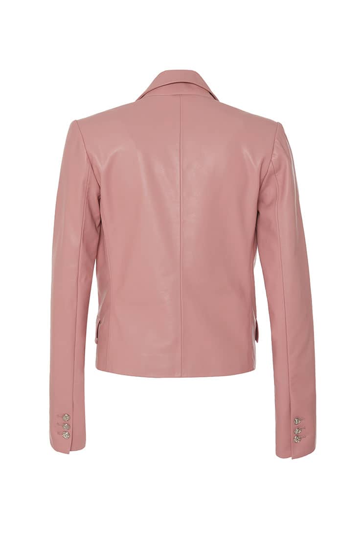 戗驳领,内置垫肩,一字口袋,西装长袖,门襟雕花金扣点缀;利落短款版型,细腻的荔枝纹皮面,低调奢华。