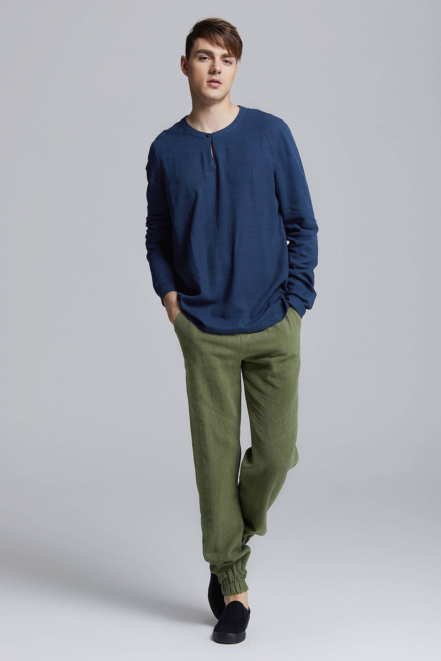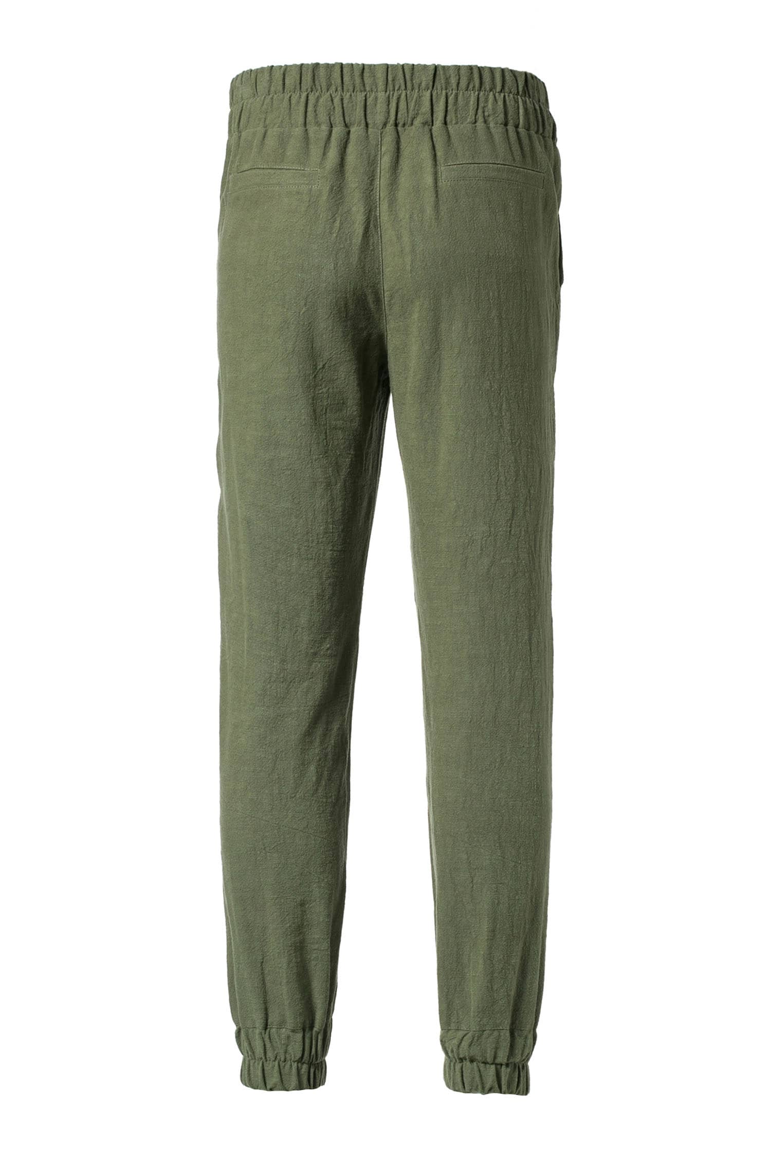 简约松紧腰头设计,人性化的侧口袋剪裁,裤脚松紧束口,不易变形,锥形裤版型剪裁,修饰腿部轮廓;天然的纯苎麻面料,透气舒爽,质朴清新,干爽不粘腻。