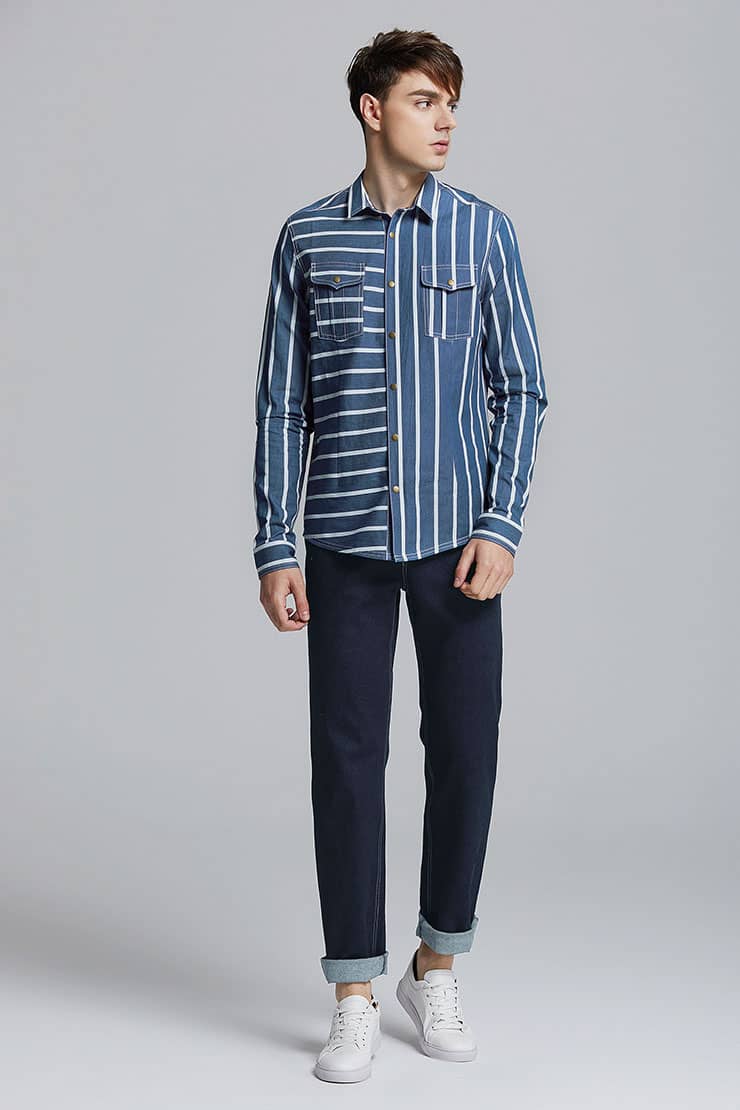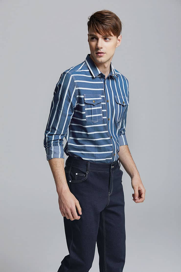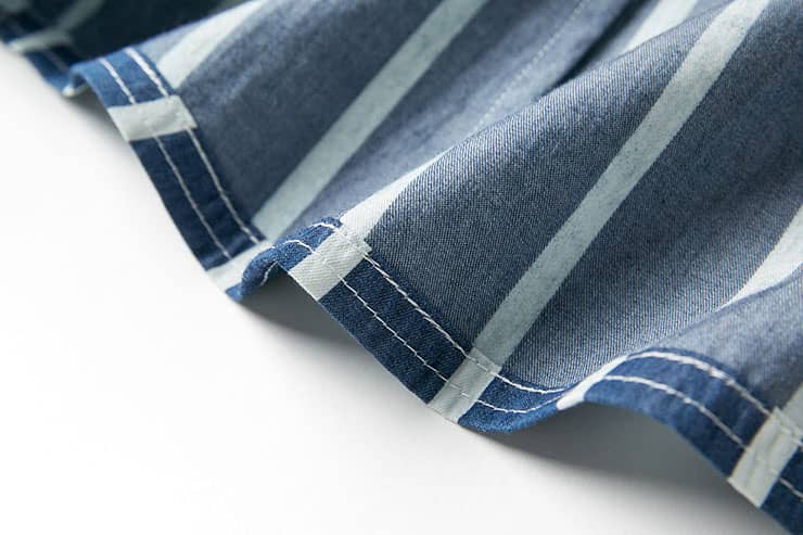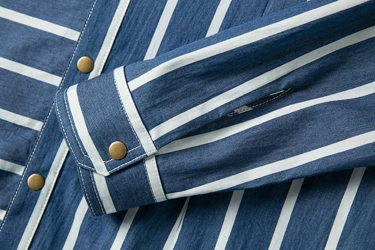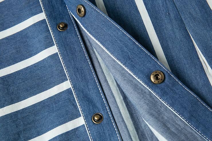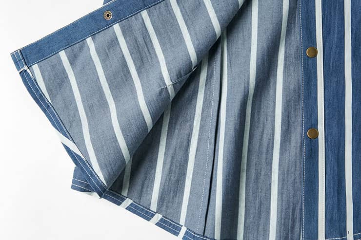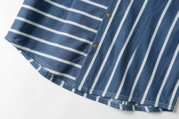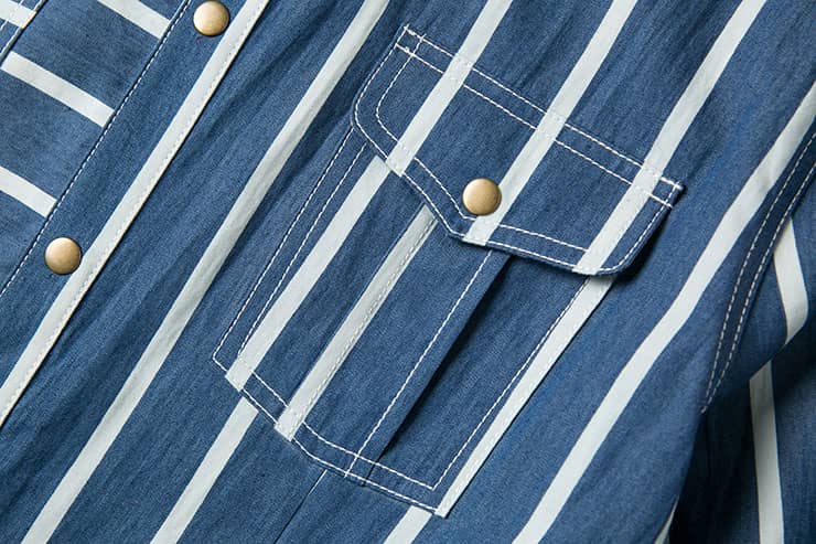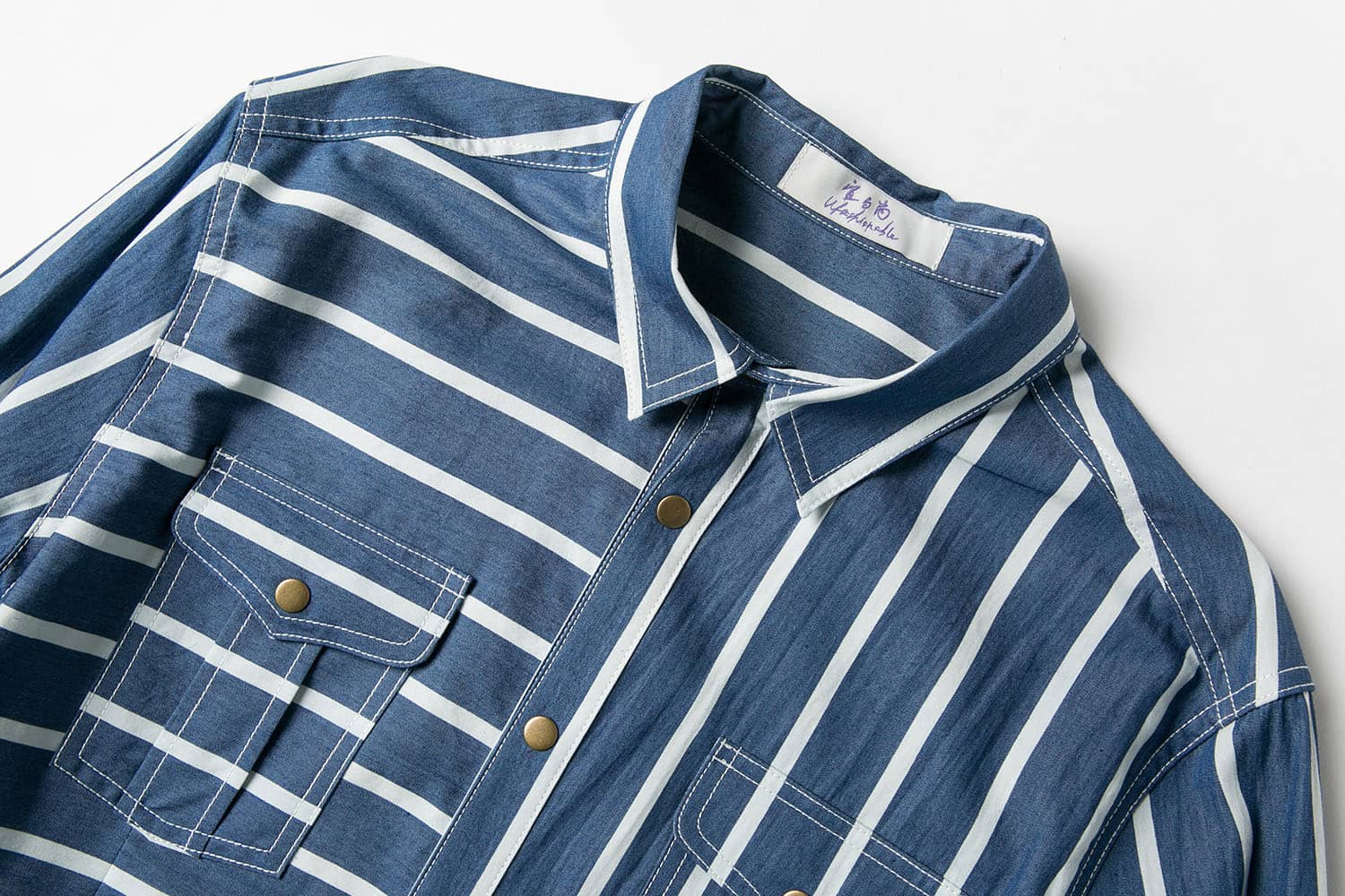 衣身条纹左右两边采取纵向横向排列,打破了沉闷感,精致的树脂扣点缀,改良的军装口袋设计,优质的纯棉条纹面料,质感舒适,吸汗透气,易清洗。
