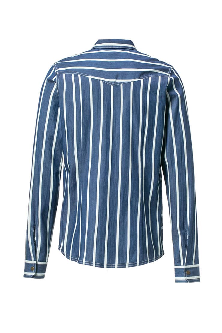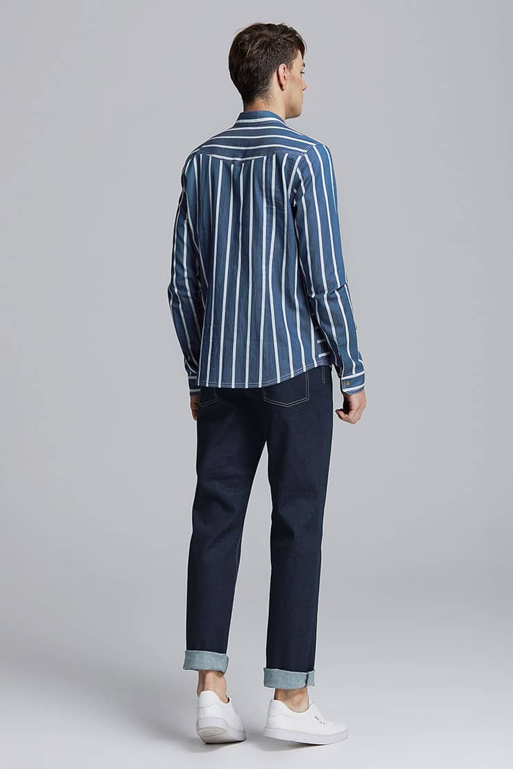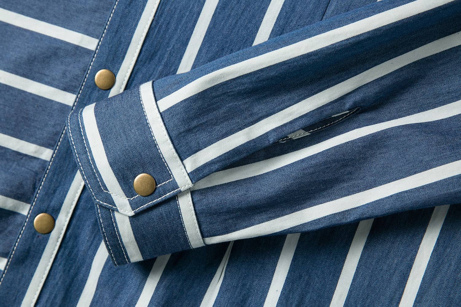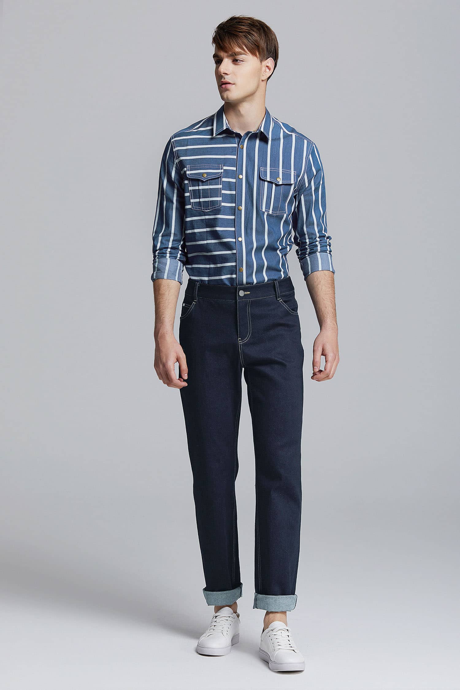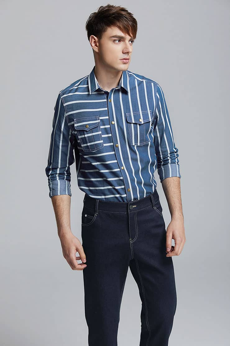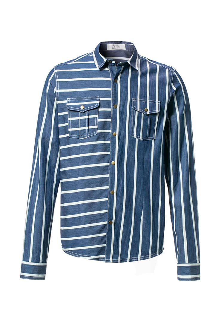 衣身条纹左右两边采取纵向横向排列,打破了沉闷感,精致的树脂扣点缀,改良的军装口袋设计,优质的纯棉条纹面料,质感舒适,吸汗透气,易清洗。