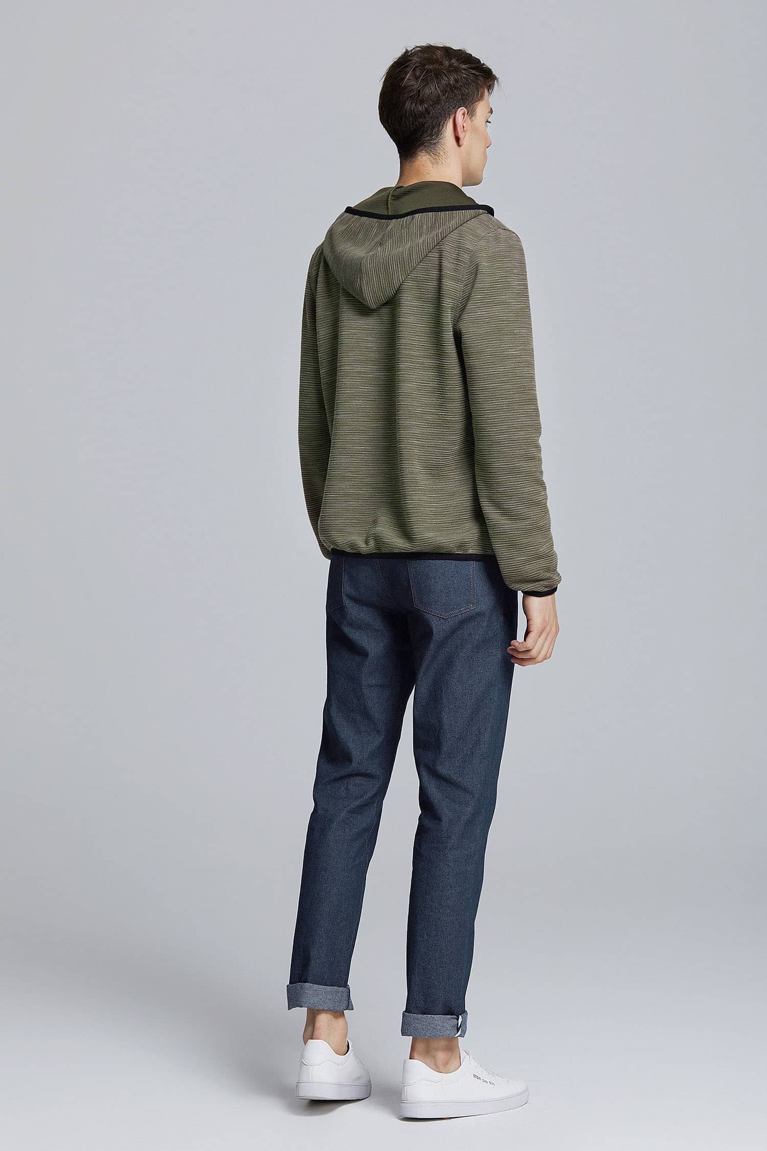 特色连帽开衫设计,隐形的侧口袋,下摆袖口撞色捆边,增加视觉效果提升美感;采用定制面料,复古的杂色纹路,柔韧细致,穿着舒适自在。