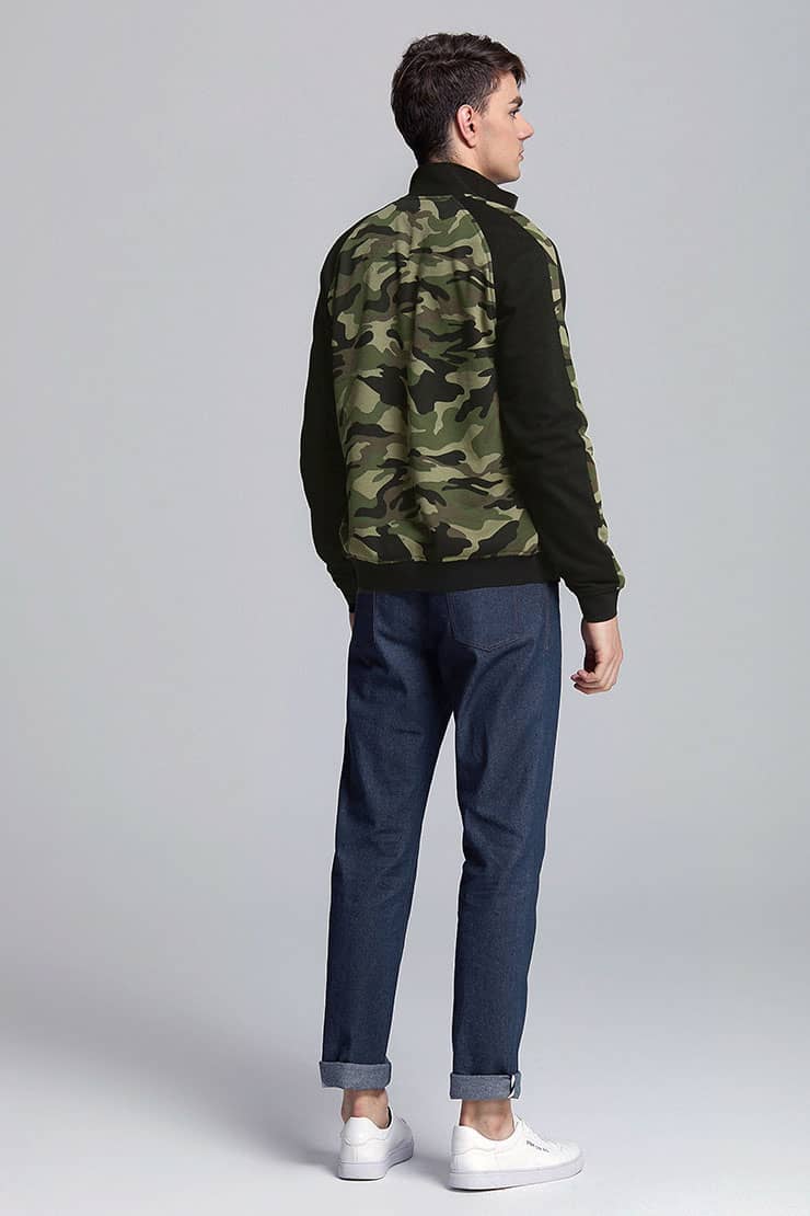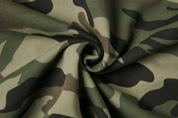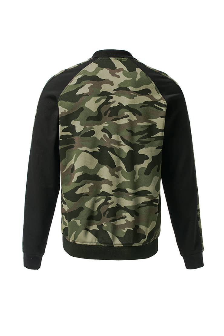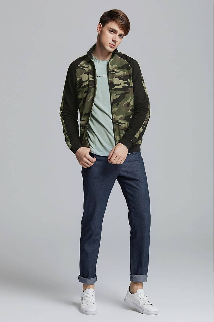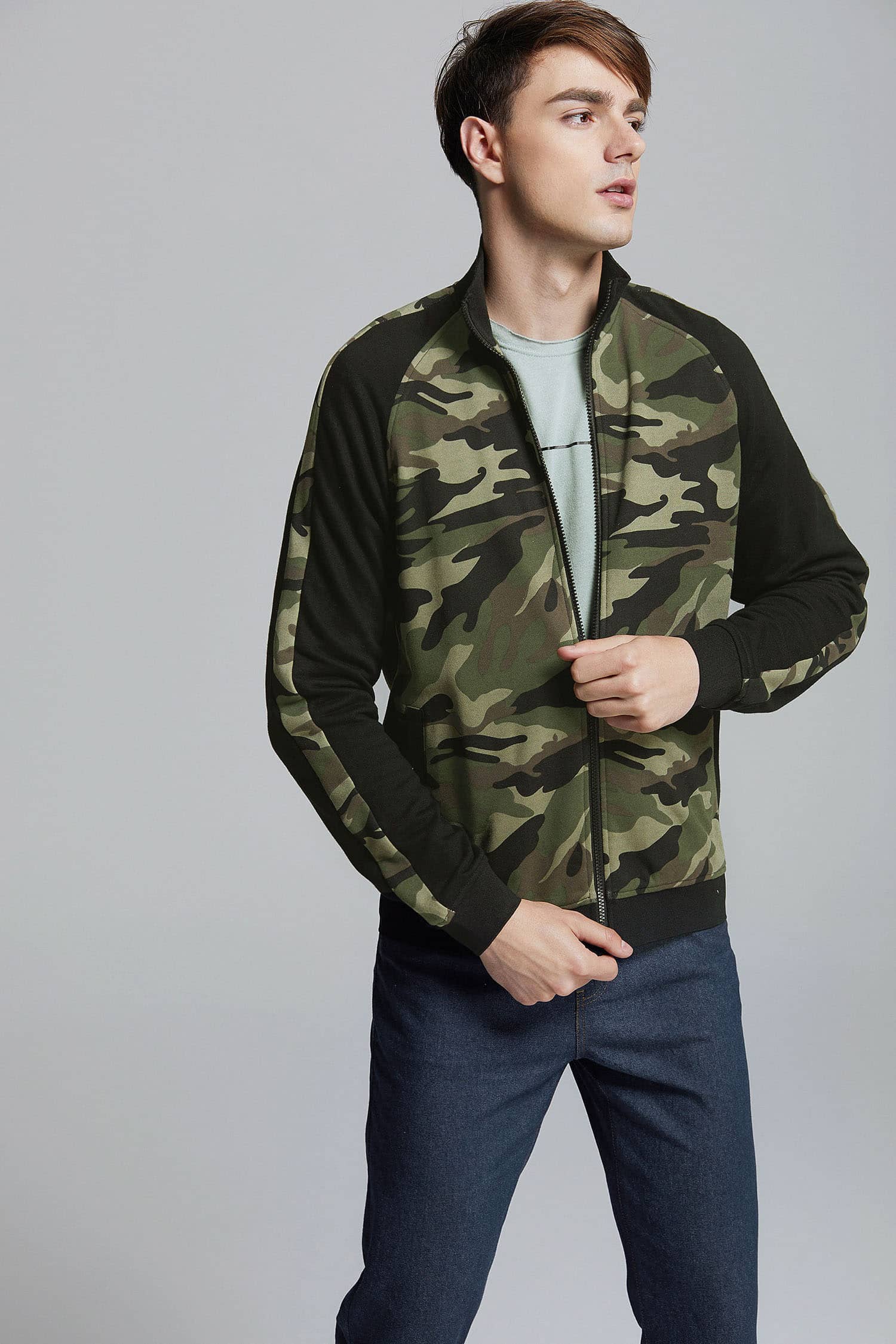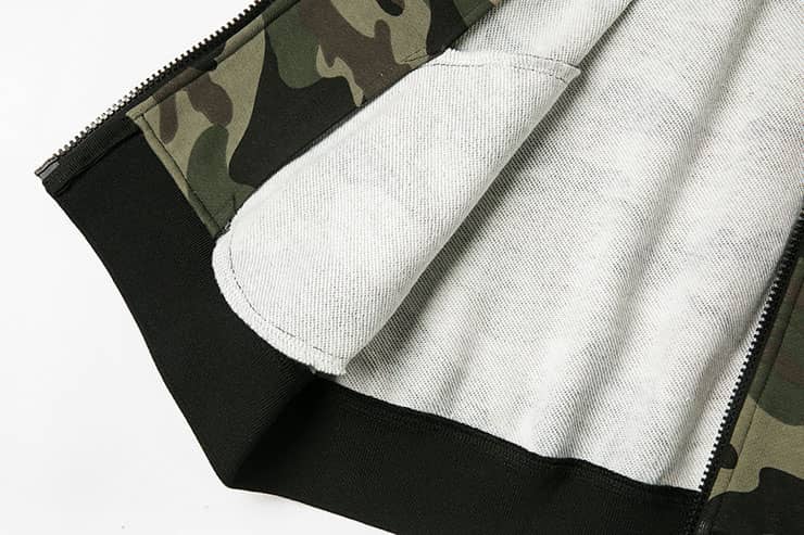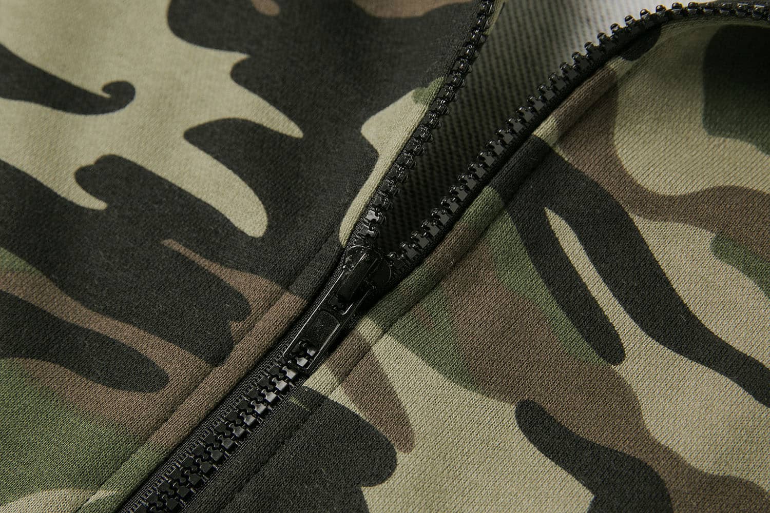 螺纹立领剪裁,门襟有品质拉链,落肩袖拼接设计,下摆和袖口罗纹束口,棉质迷彩印花卫衣面料,软硬适中,穿着舒适。