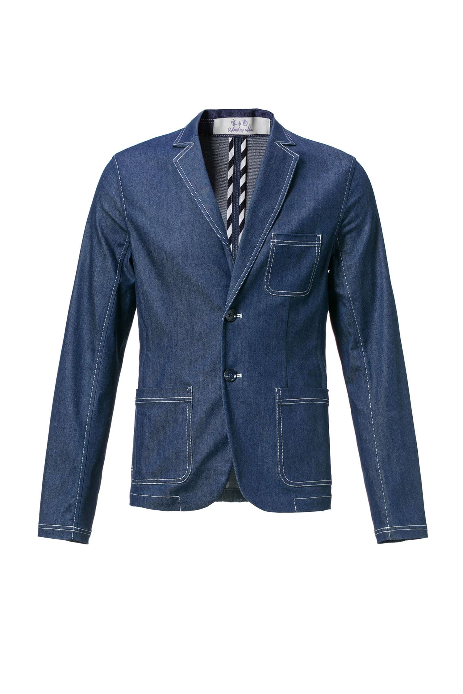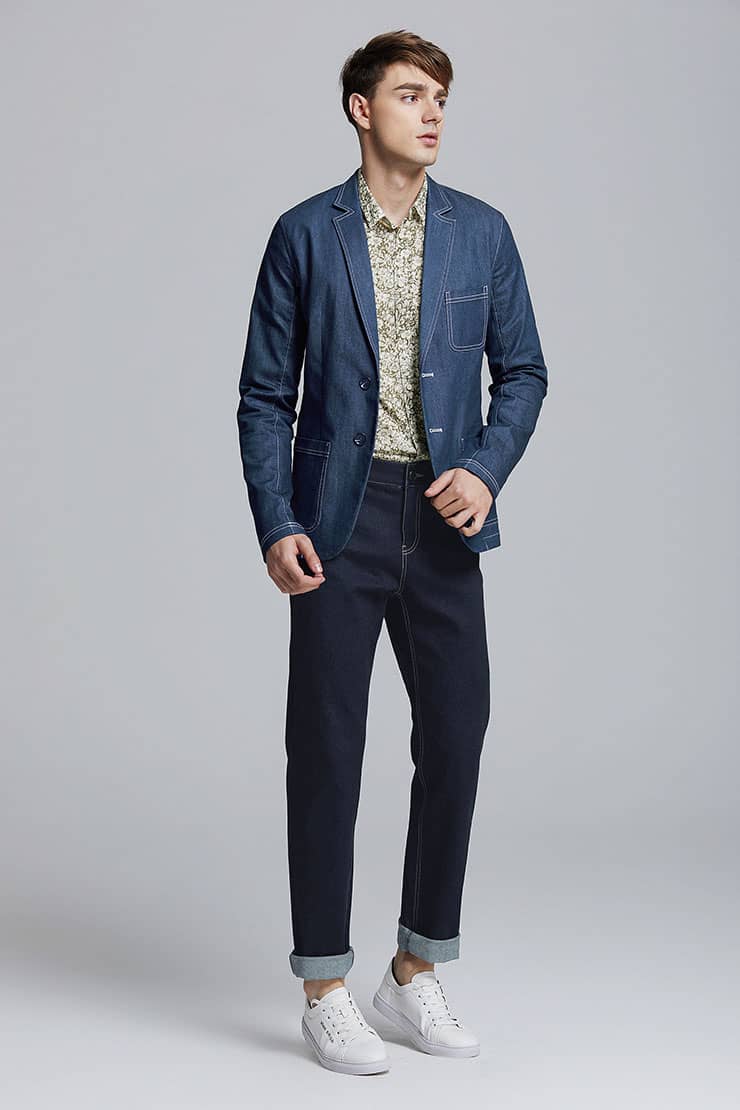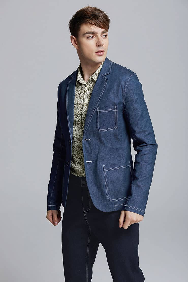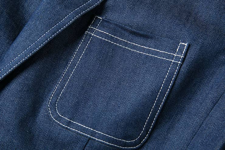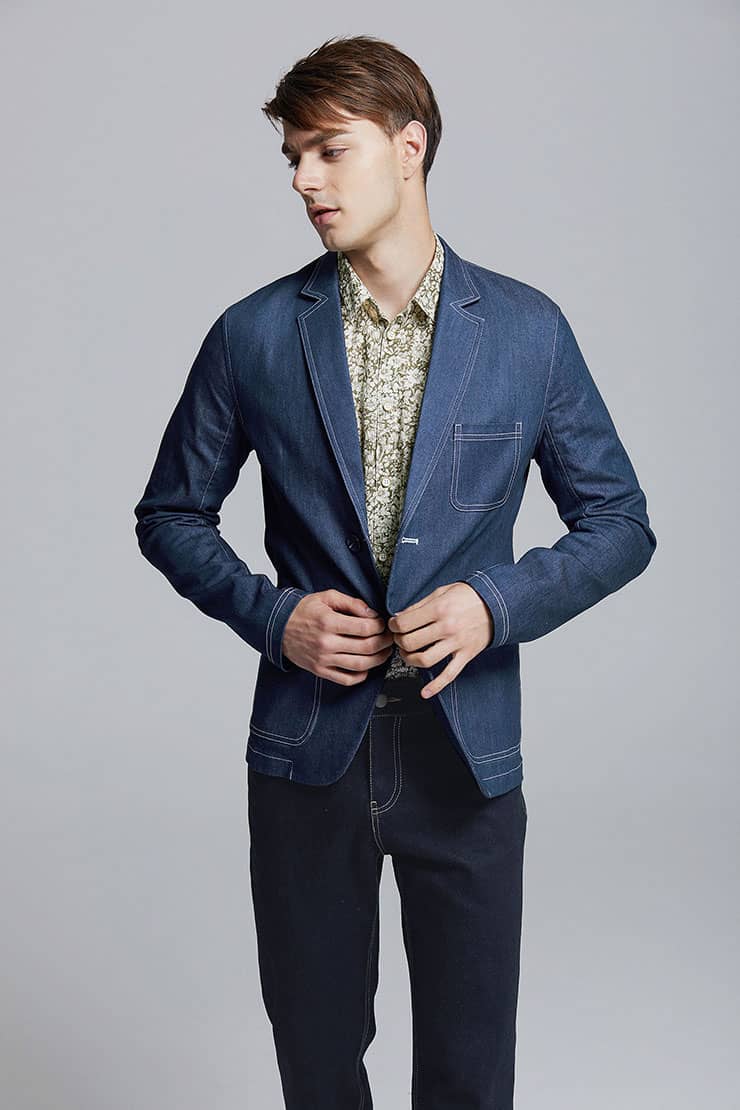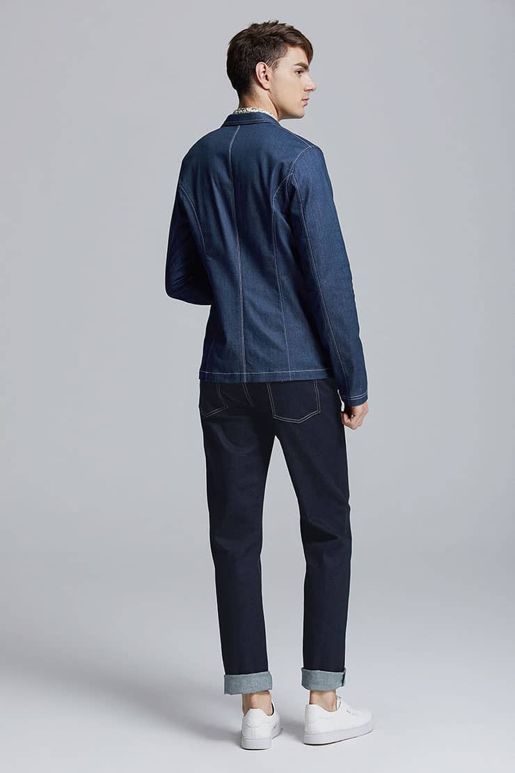 经典的枪驳领剪裁,立体贴袋设计,简约修身的西服版型,整件明线双线车缝,棉质牛仔牛料,天然亲肤,具有良好的吸湿透气性。