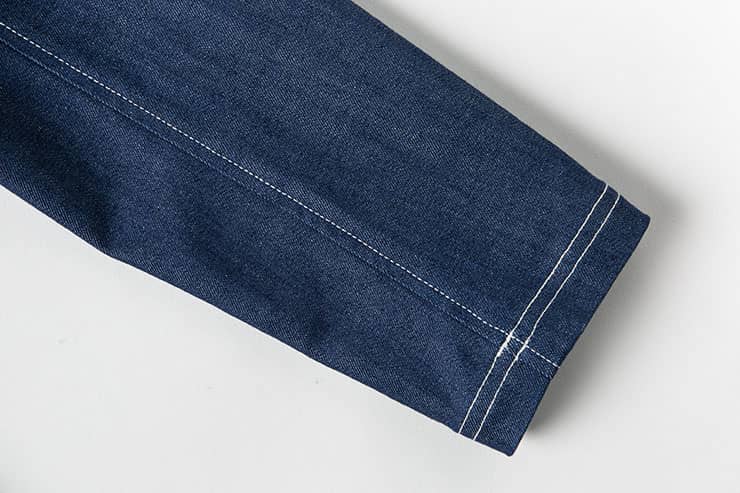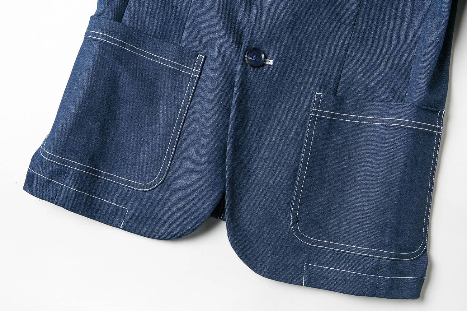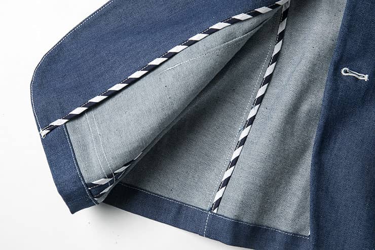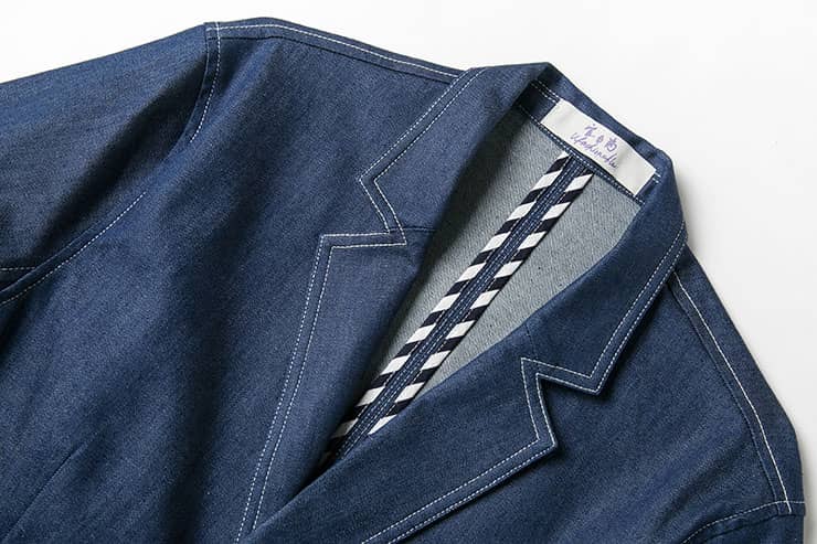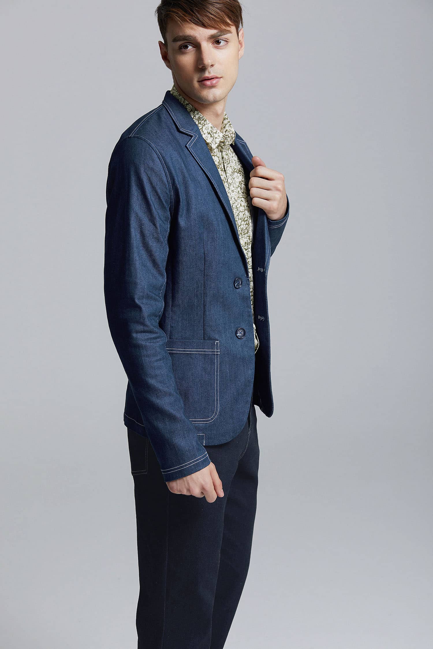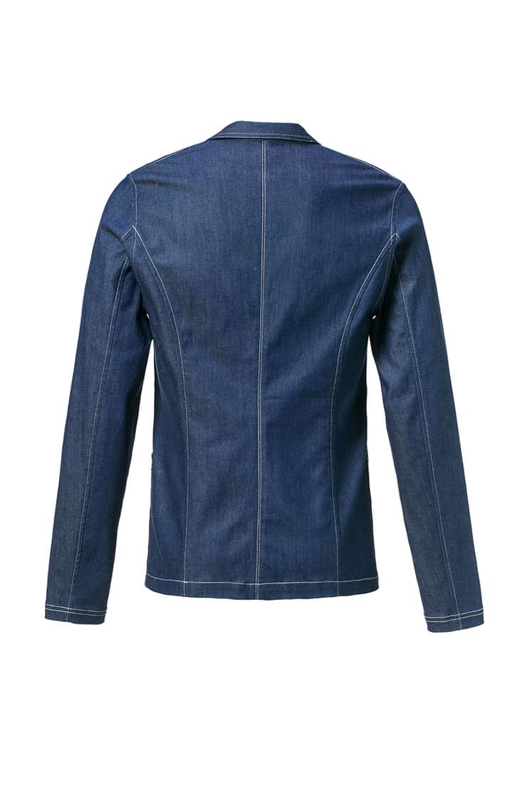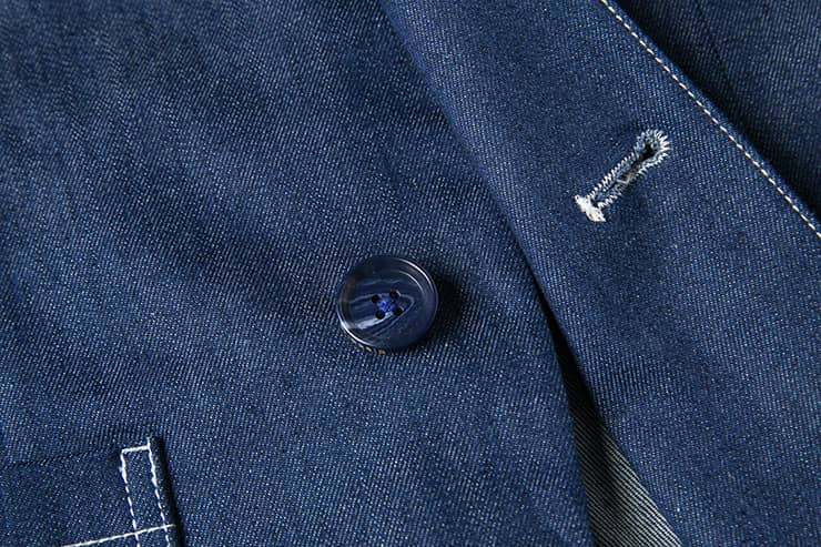 经典的枪驳领剪裁,立体贴袋设计,简约修身的西服版型,整件明线双线车缝,棉质牛仔牛料,天然亲肤,具有良好的吸湿透气性。