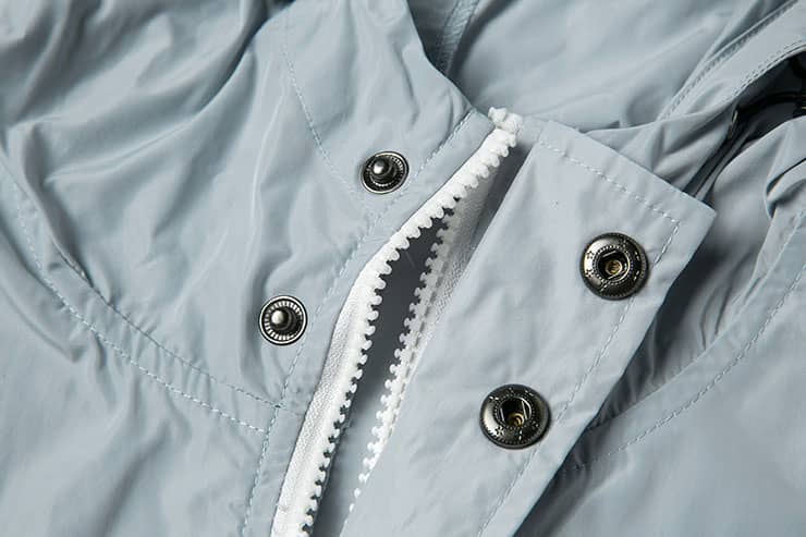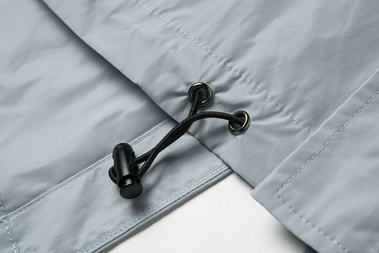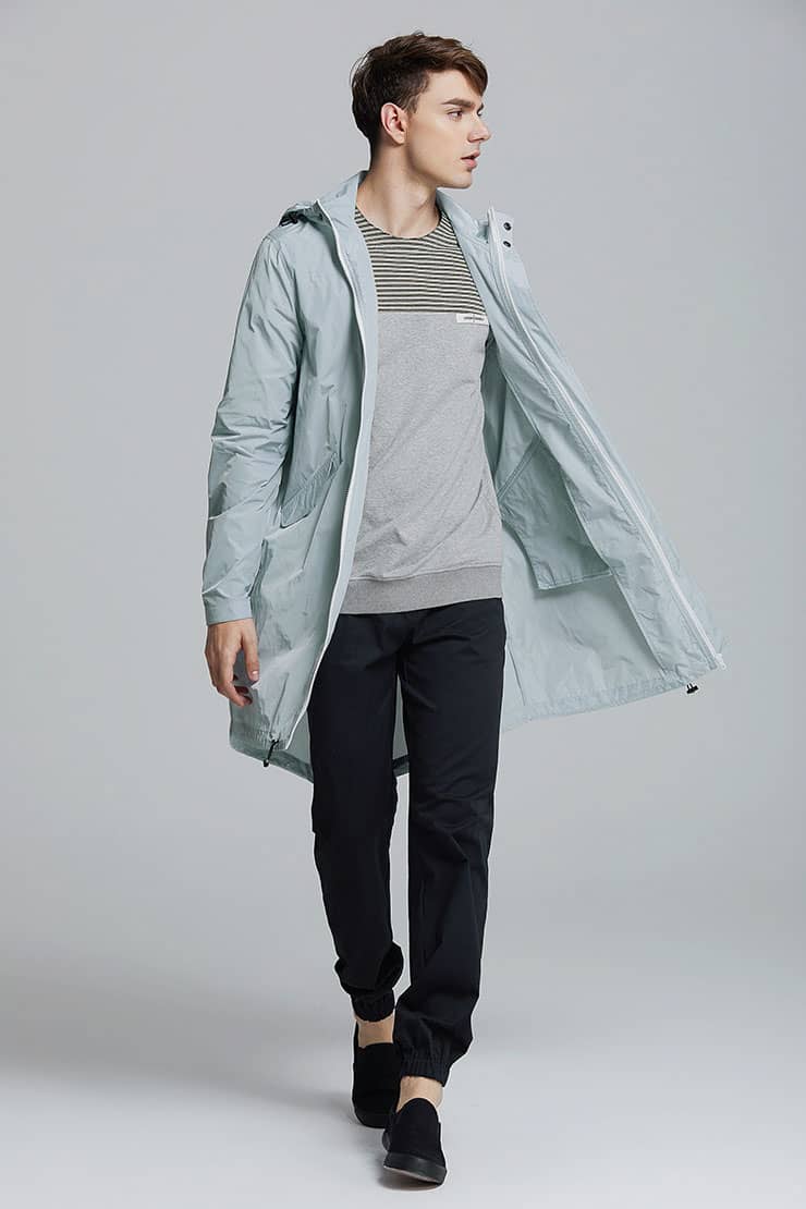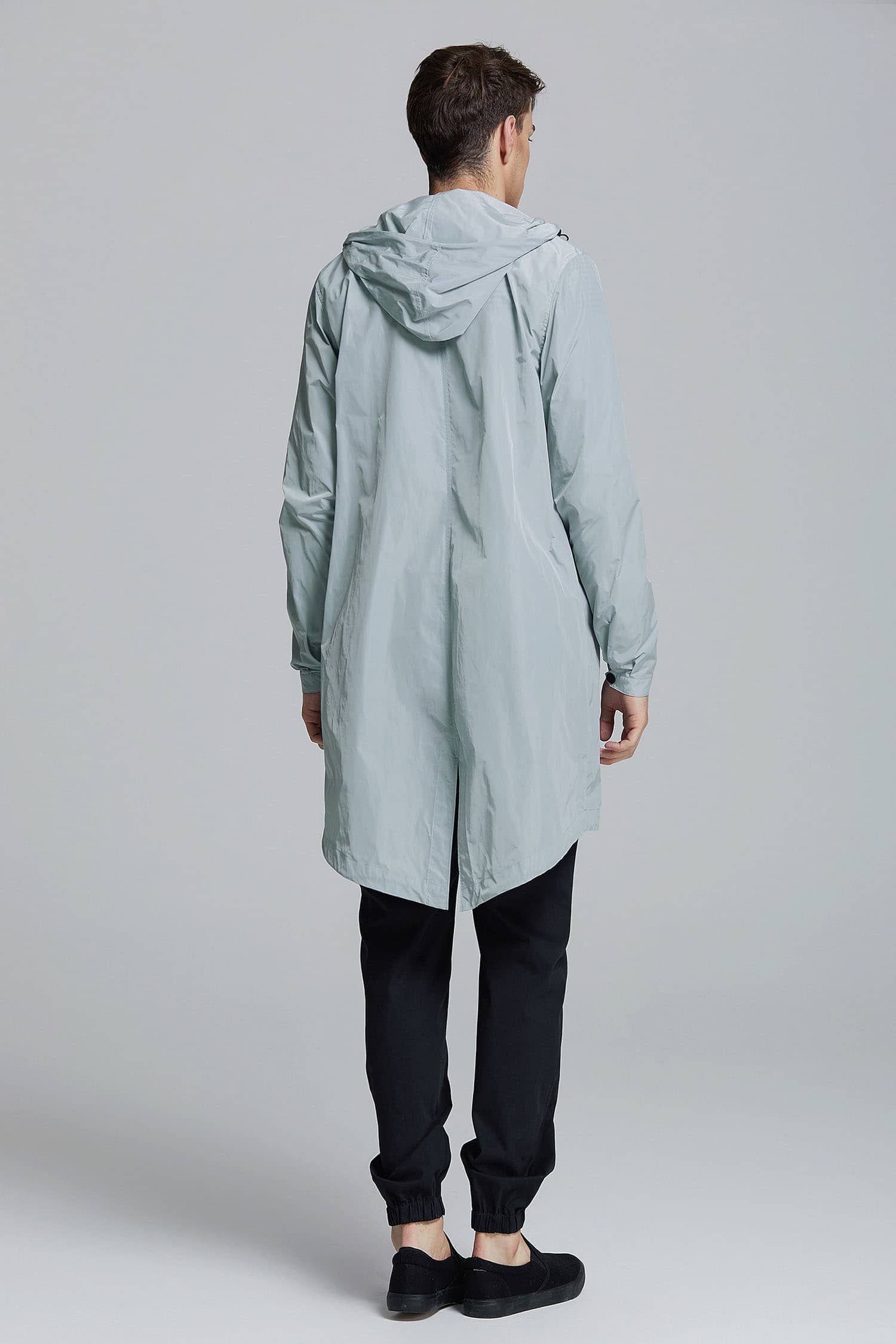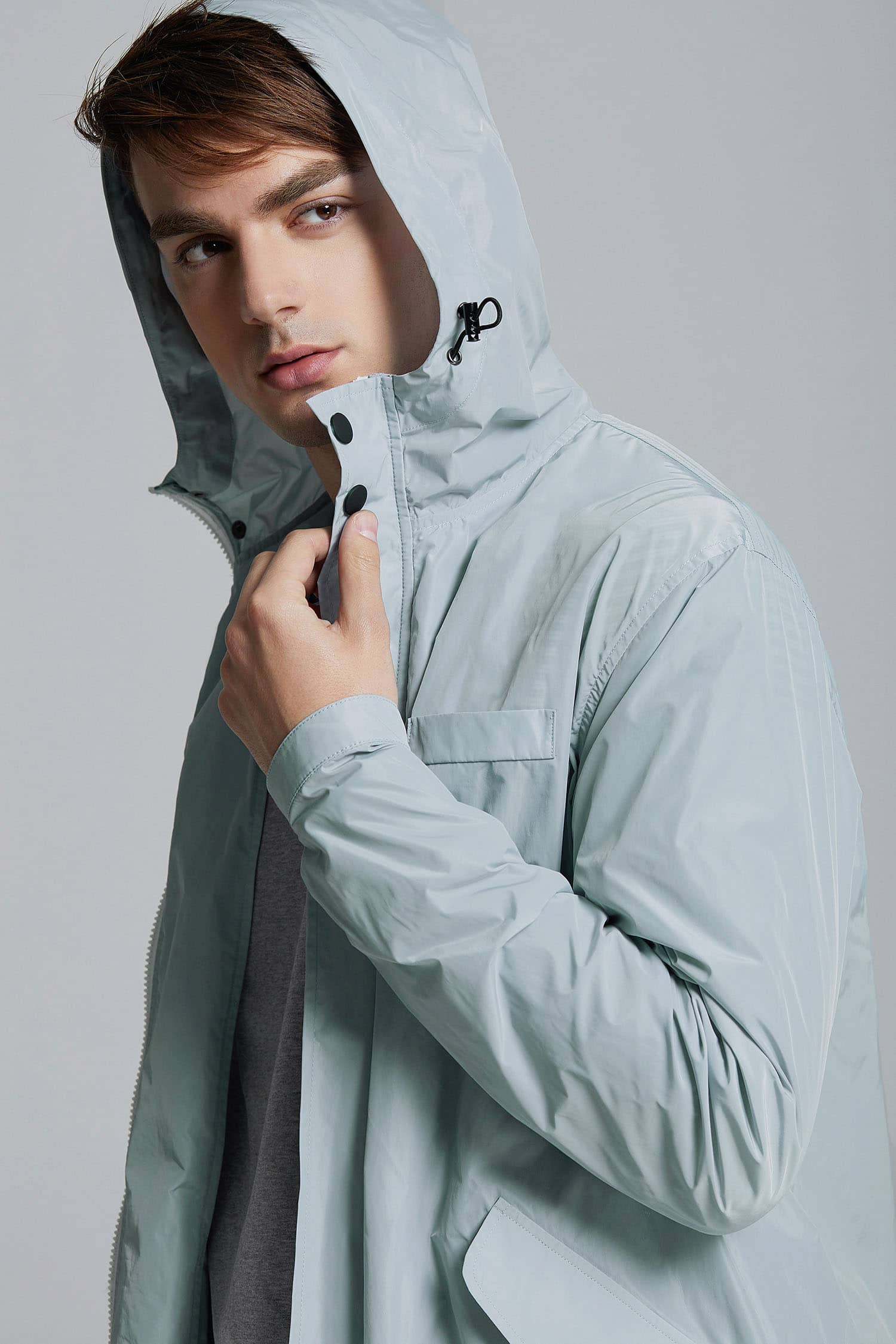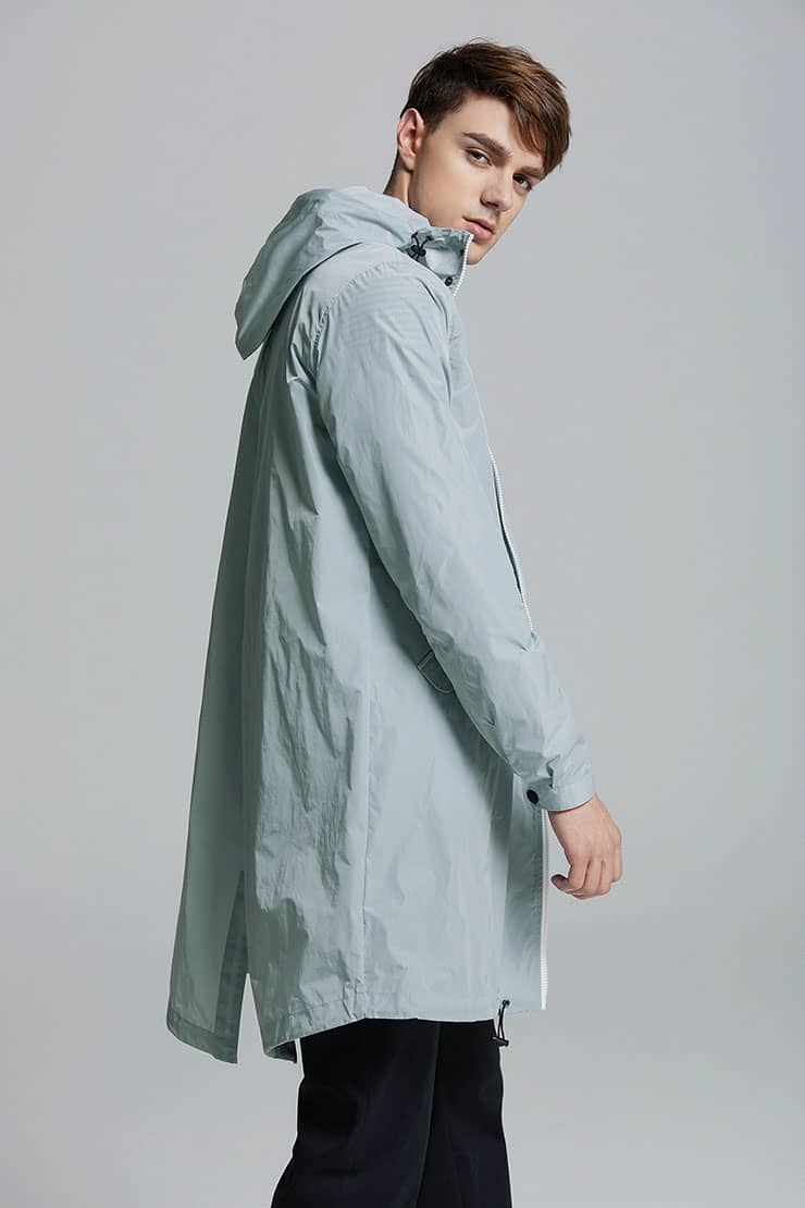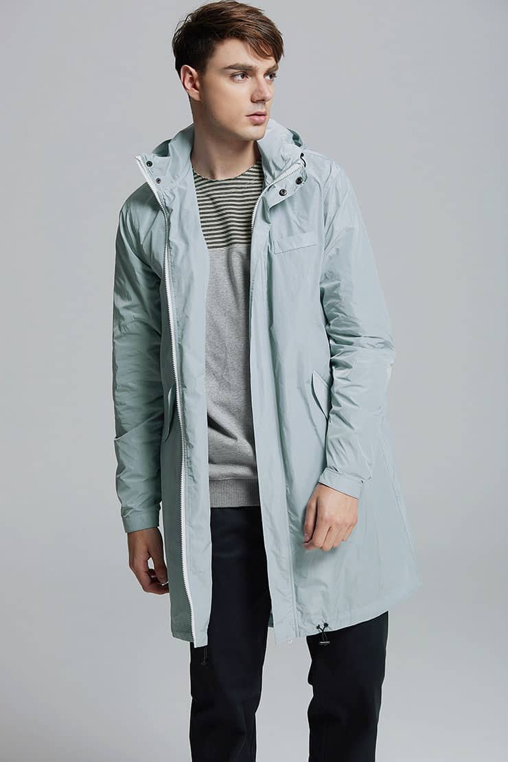 时尚连帽设计,门襟品质拉链,帽檐和下摆有抽绳设计,贴身大翻盖口袋,优质的风衣面料,柔韧有质感且不易皱。