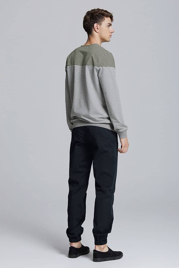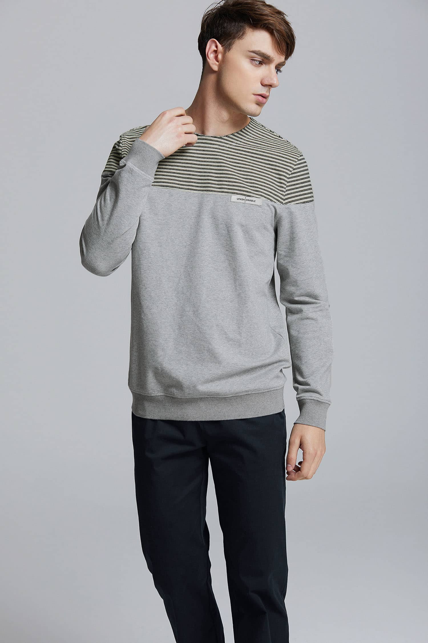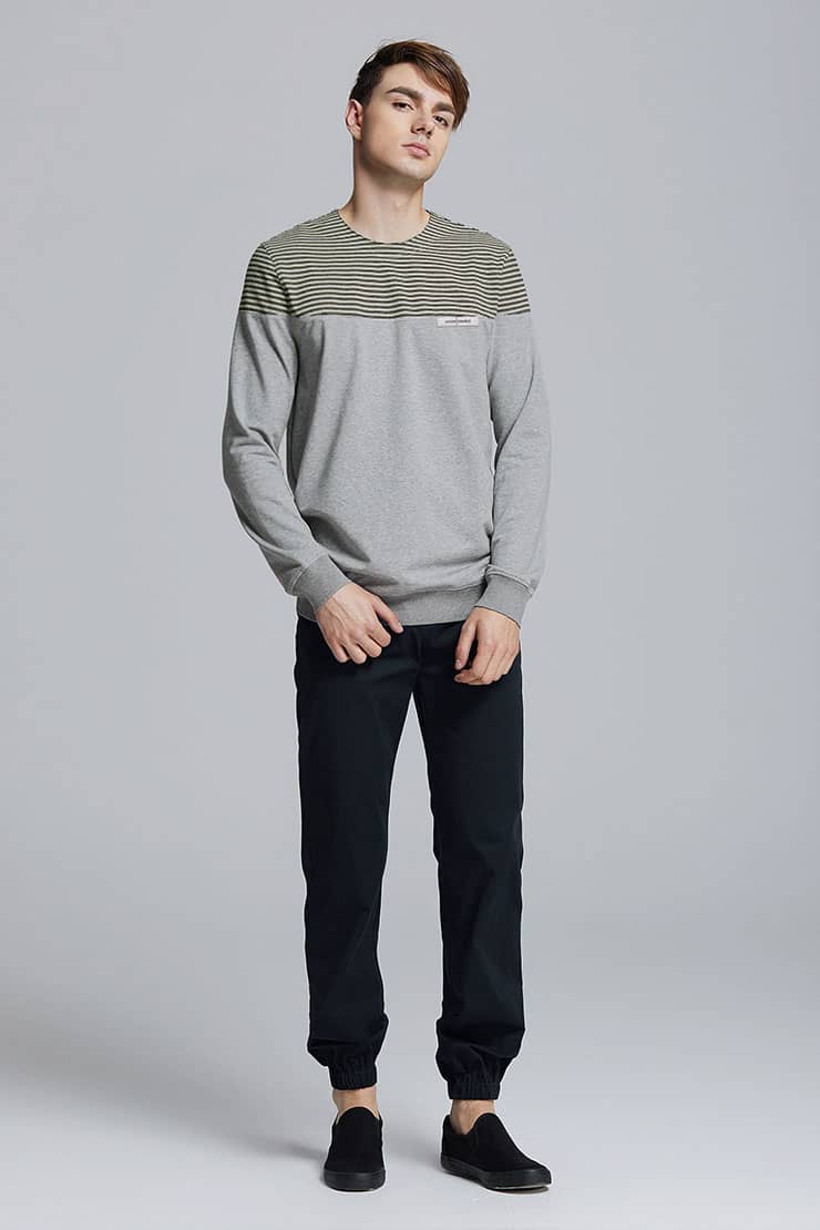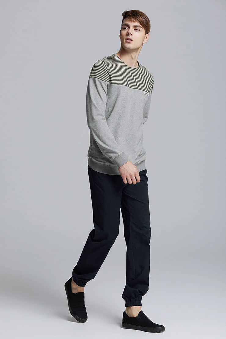 简约的圆领套头设计,撞色条纹拼接净色衣身,简约不失时尚;甄选优质的棉性面料,布面柔韧挺实,富有质感,吸湿透气。