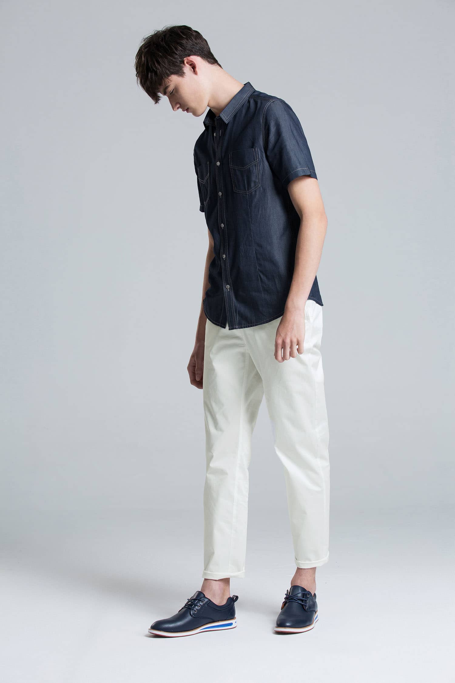 经典的翻领设计,门襟金属纽扣装饰,前幅贴袋几何车线点缀,突出视觉亮点;合体短袖剪裁,采用轻薄丹宁棉质牛仔,手感柔软,舒适透气。