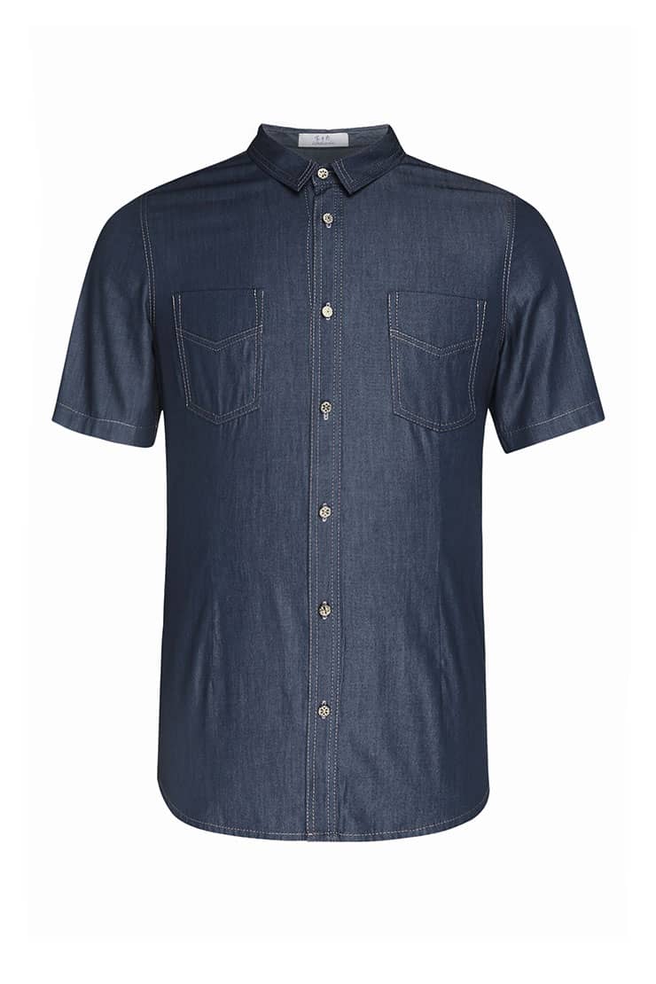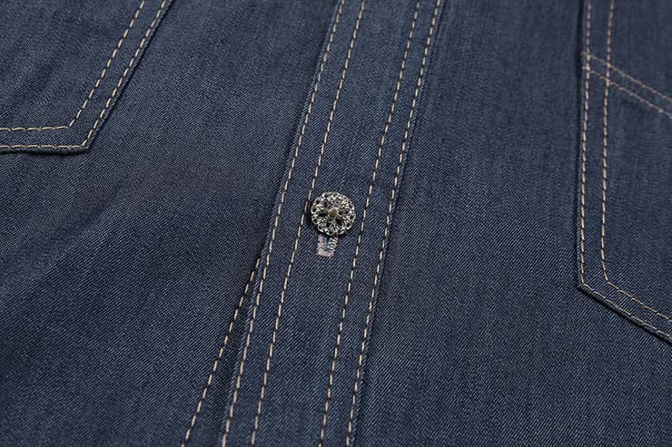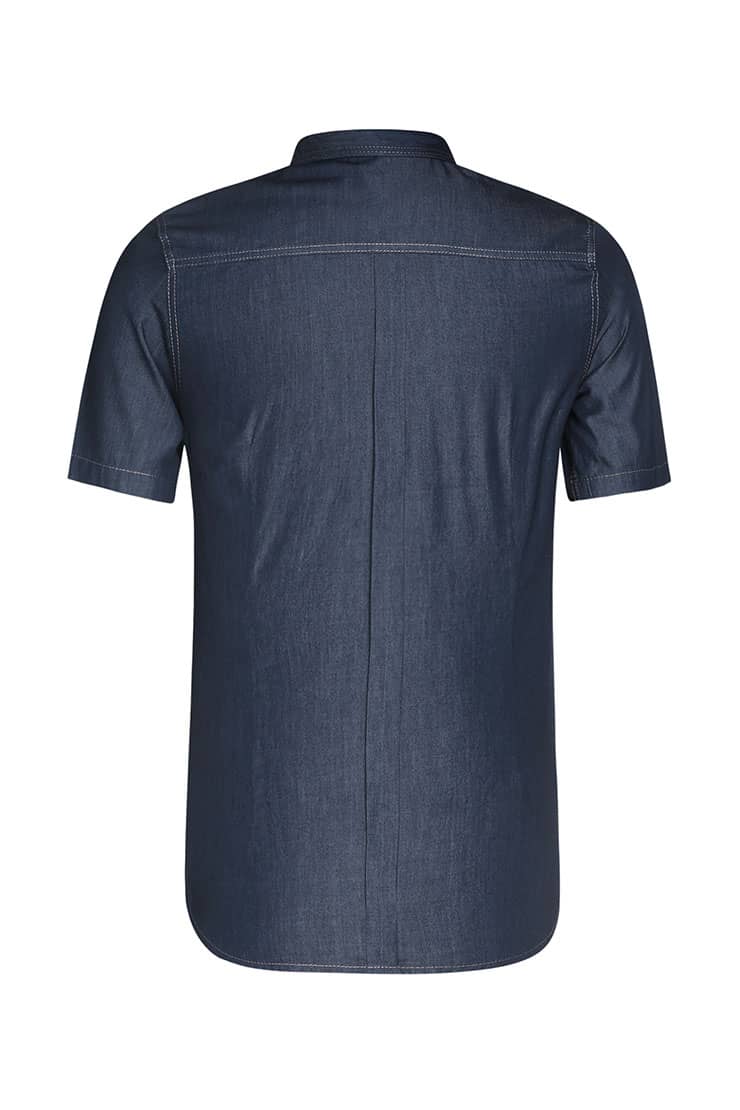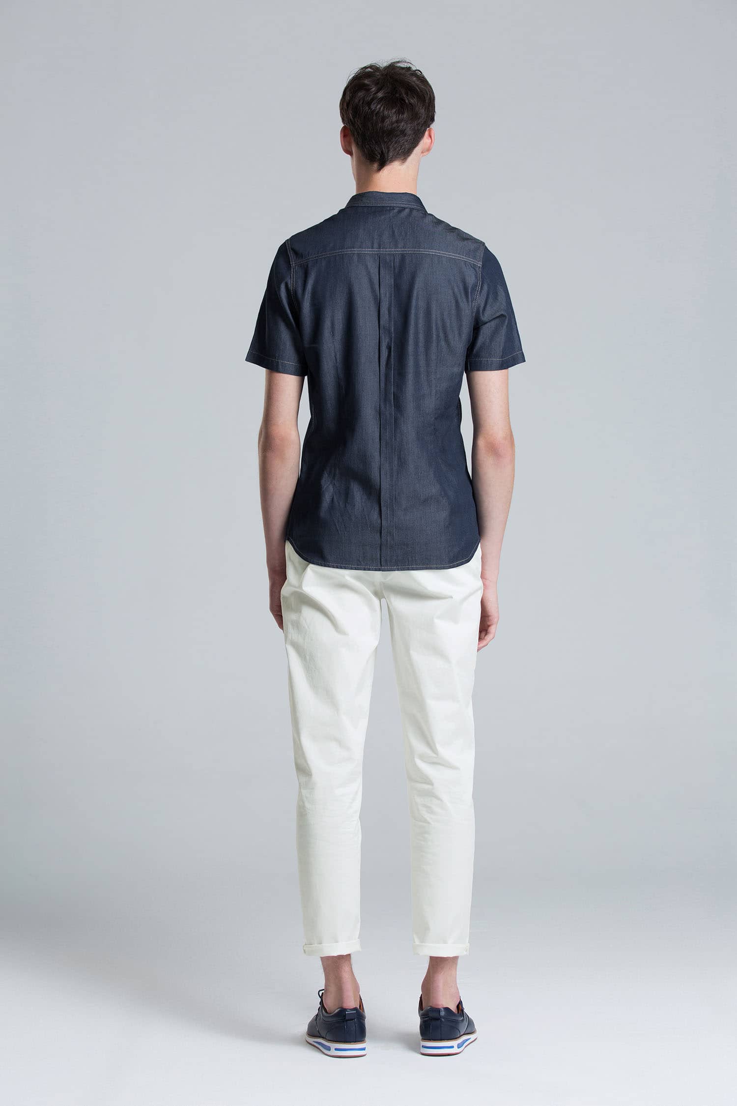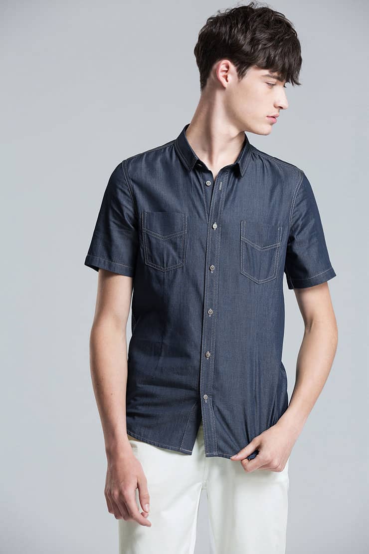 经典的翻领设计,门襟金属纽扣装饰,前幅贴袋几何车线点缀,突出视觉亮点;合体短袖剪裁,采用轻薄丹宁棉质牛仔,手感柔软,舒适透气。