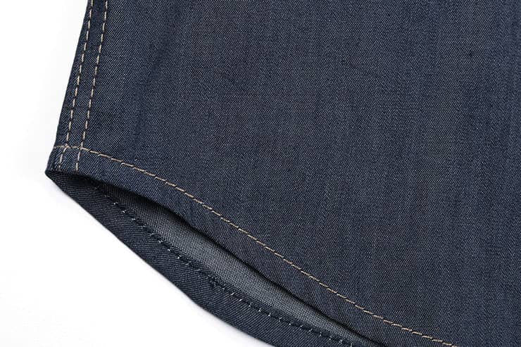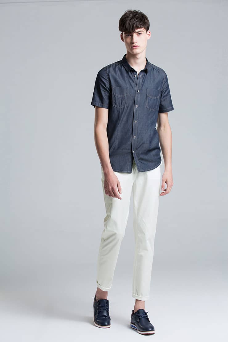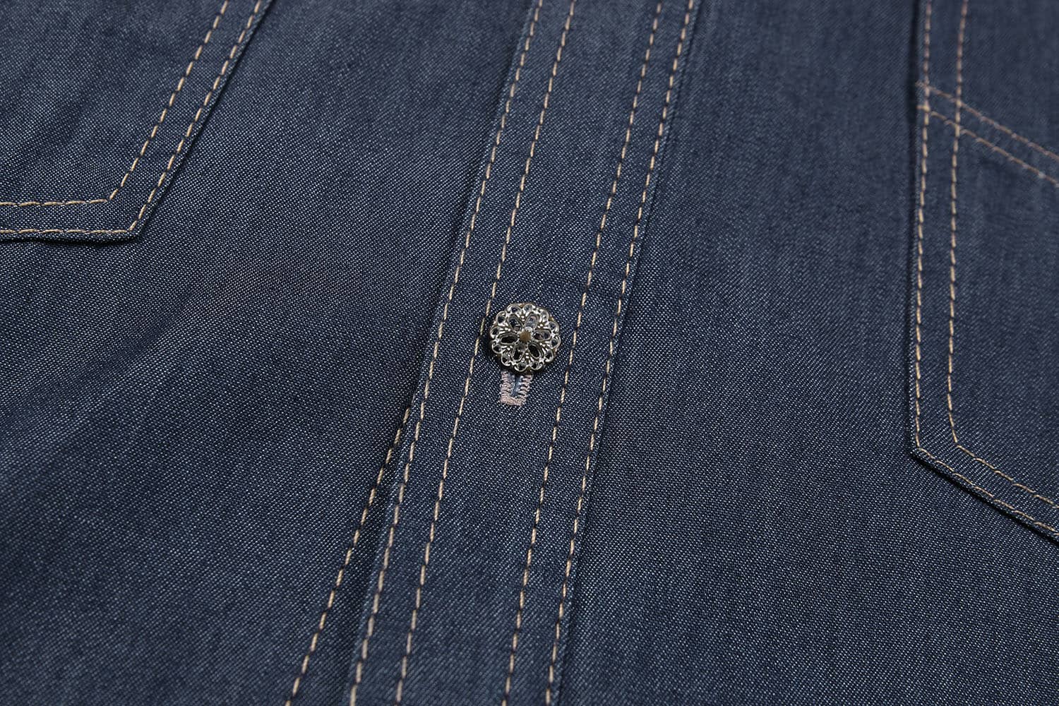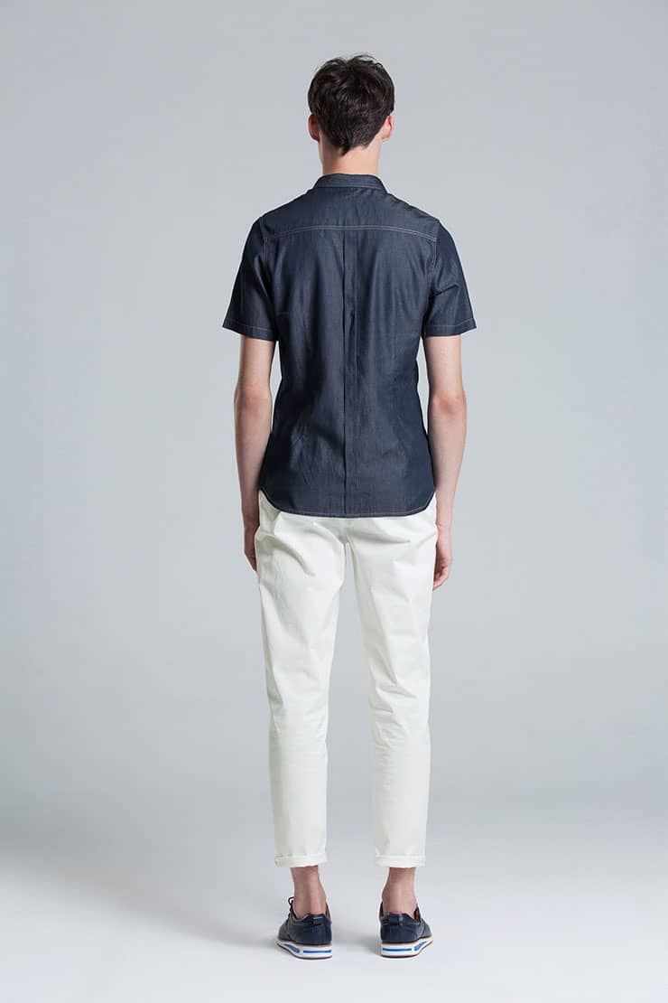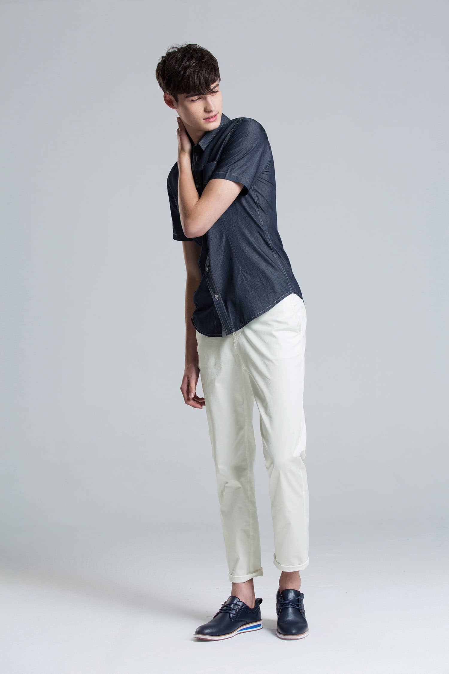 经典的翻领设计,门襟金属纽扣装饰,前幅贴袋几何车线点缀,突出视觉亮点;合体短袖剪裁,采用轻薄丹宁棉质牛仔,手感柔软,舒适透气。