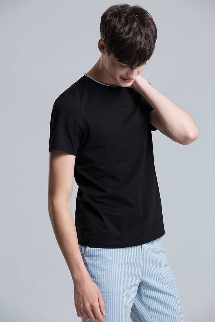 双色卷边圆领设计,合体版型剪裁,优选舒适纯棉面料,柔软亲肤,穿着吸湿透气。