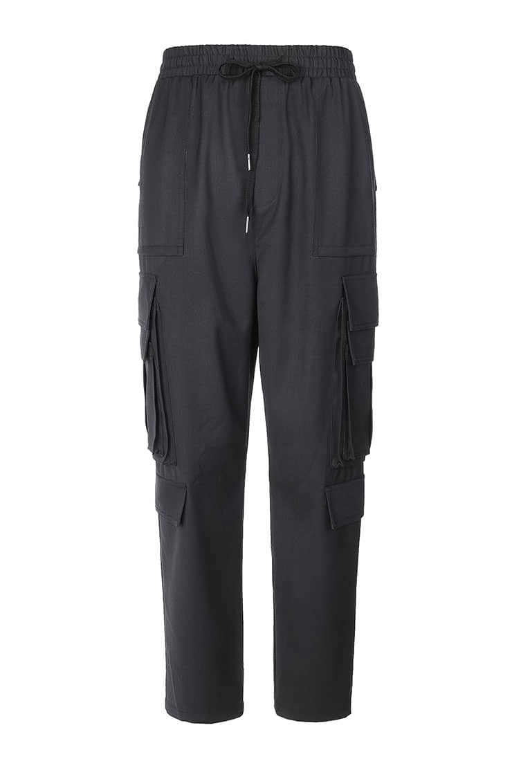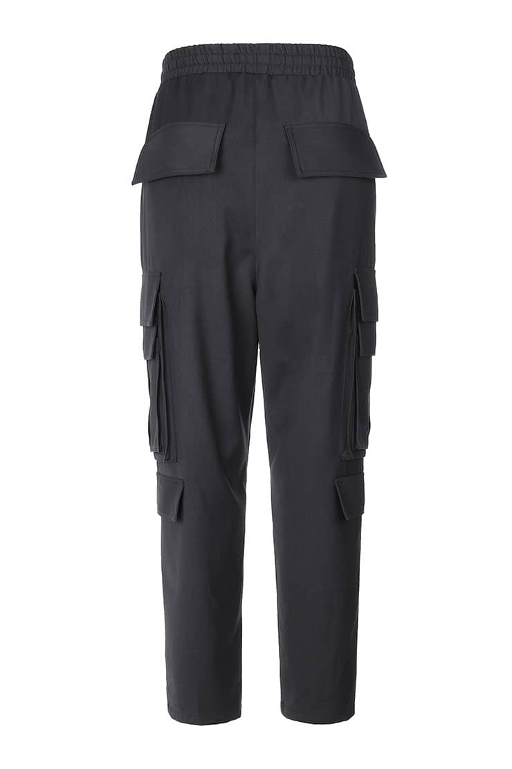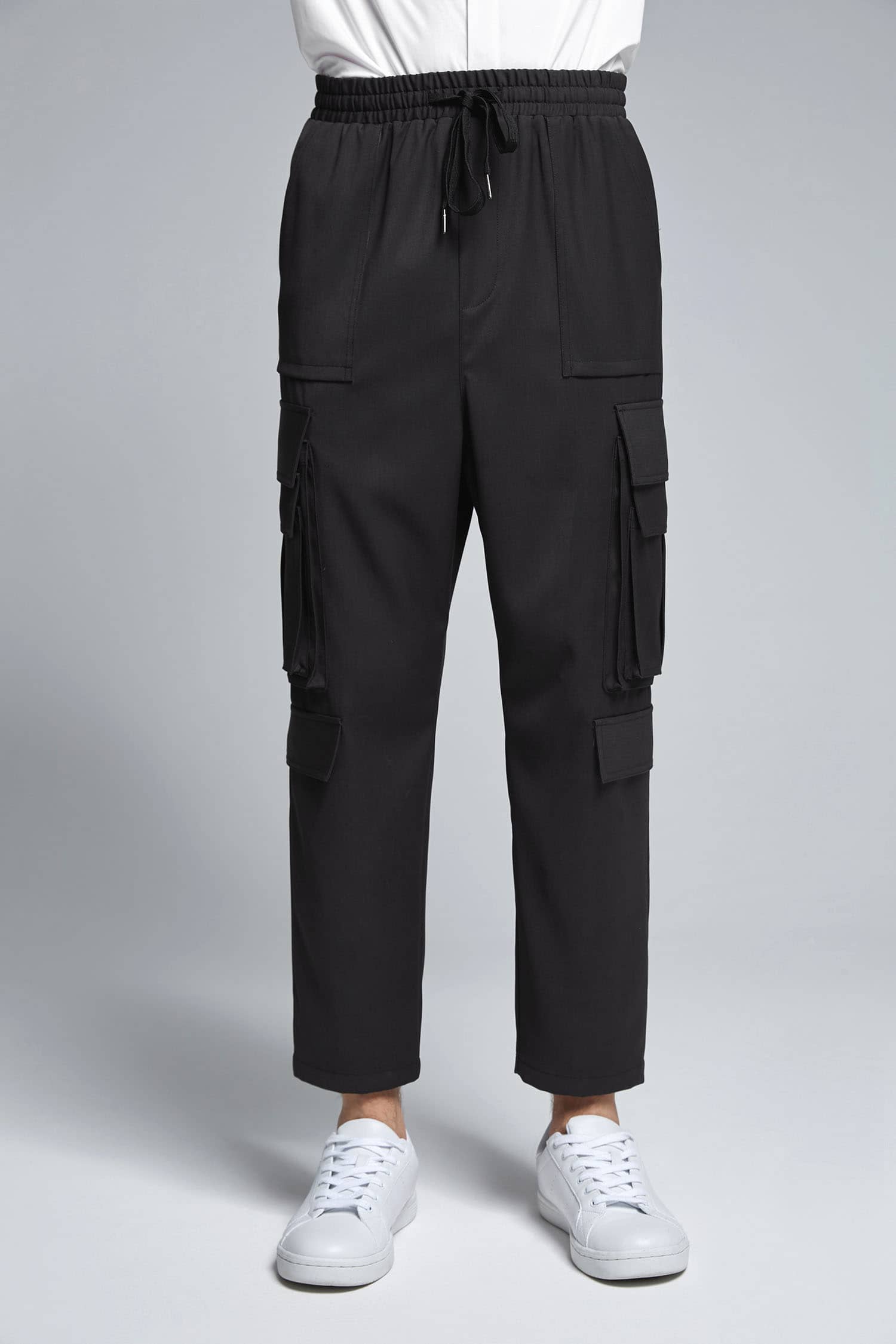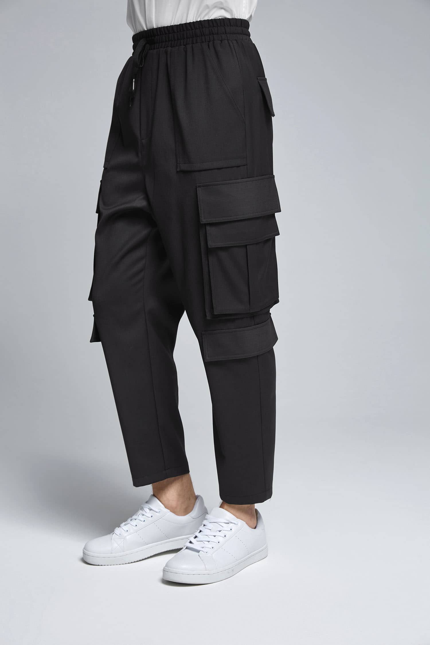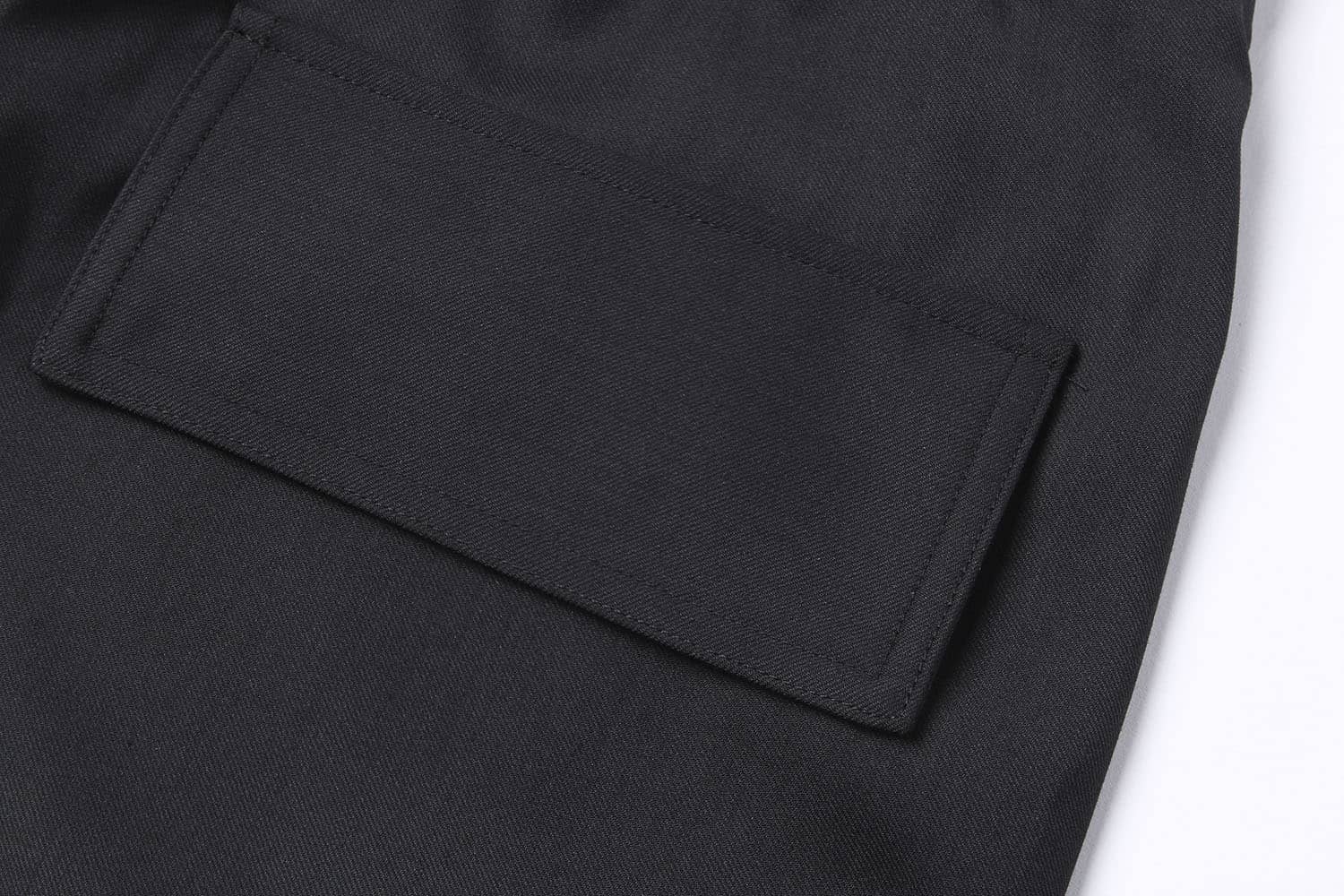 松紧腰头,腰头内抽绳,落裆,脚口微收,经典的萝卜裤型,前后幅侧幅设有个性工装大贴袋大袋盖,打破沉闷,装点您的独特气质。