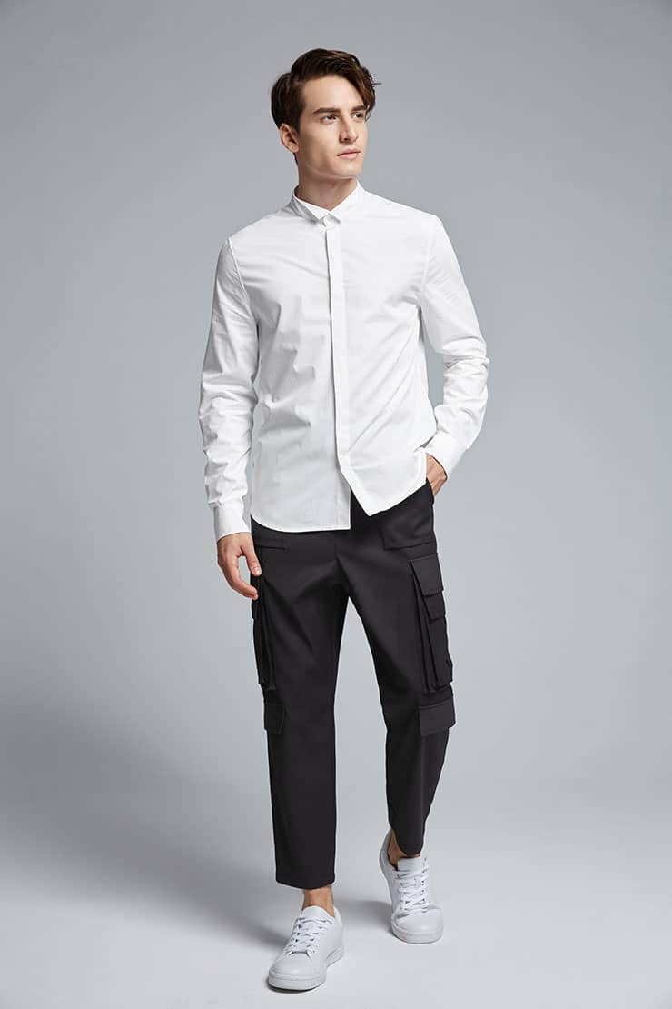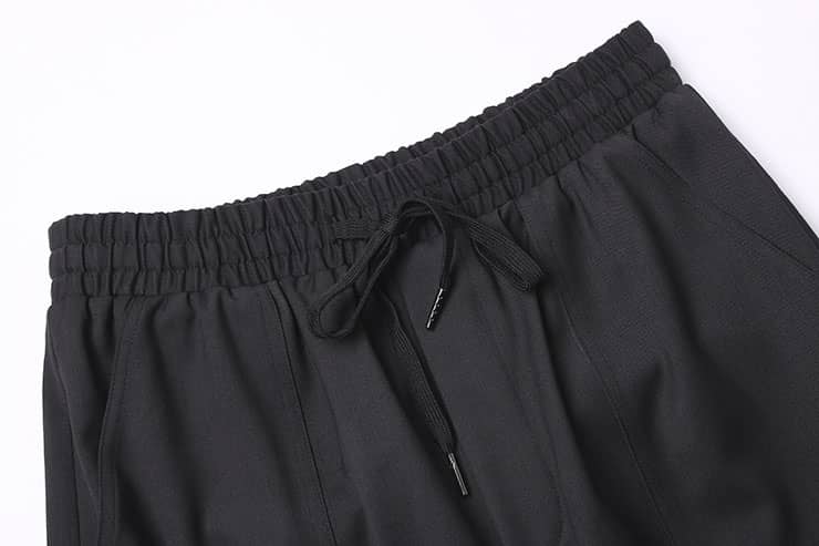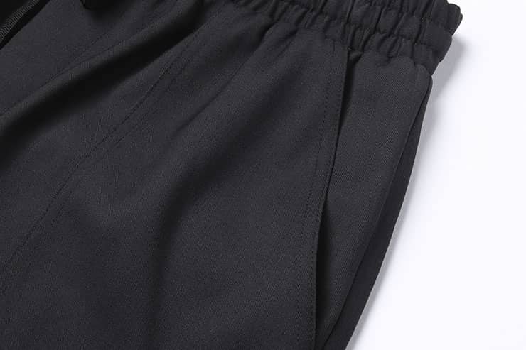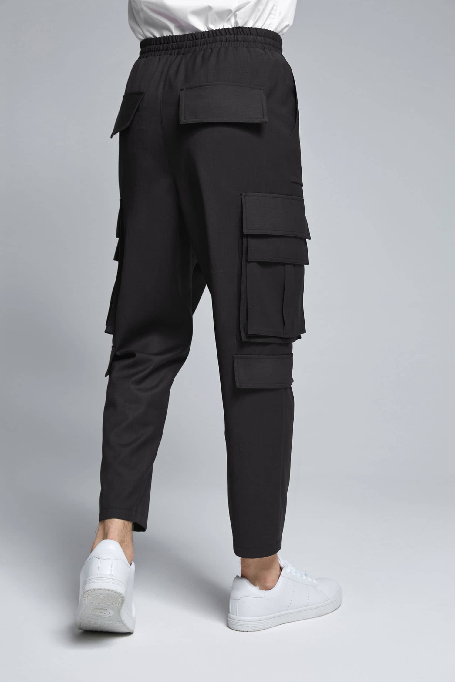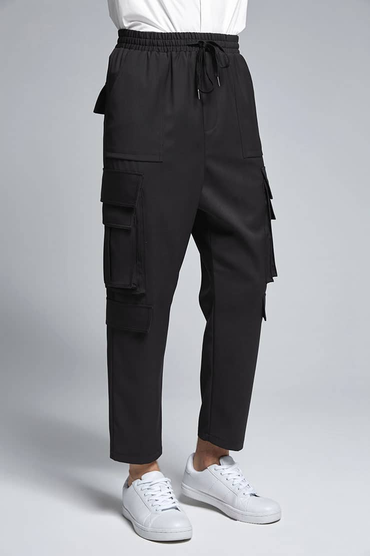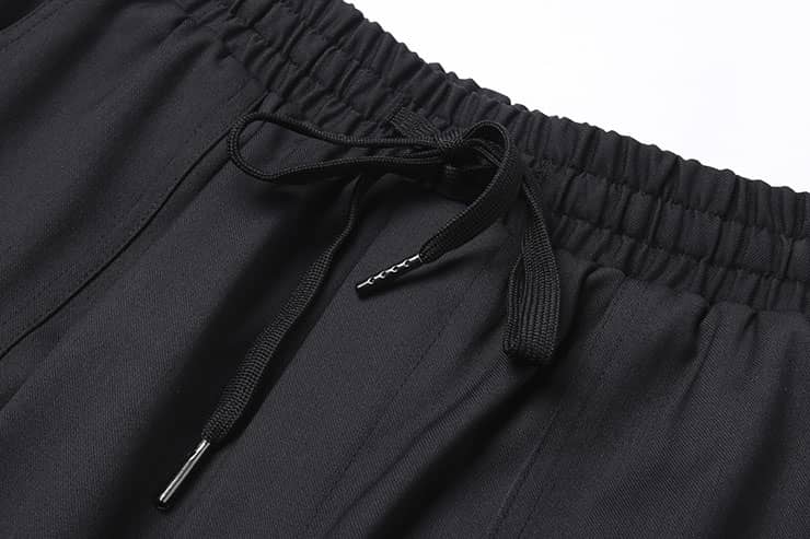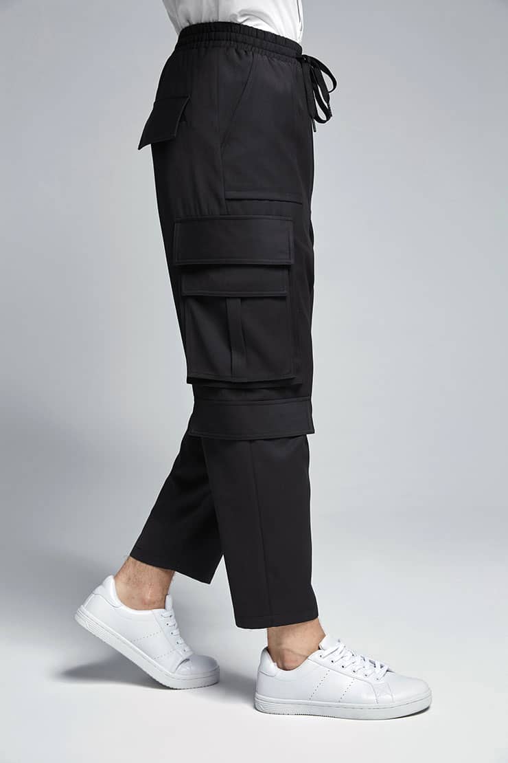 松紧腰头,腰头内抽绳,落裆,脚口微收,经典的萝卜裤型,前后幅侧幅设有个性工装大贴袋大袋盖,打破沉闷,装点您的独特气质。