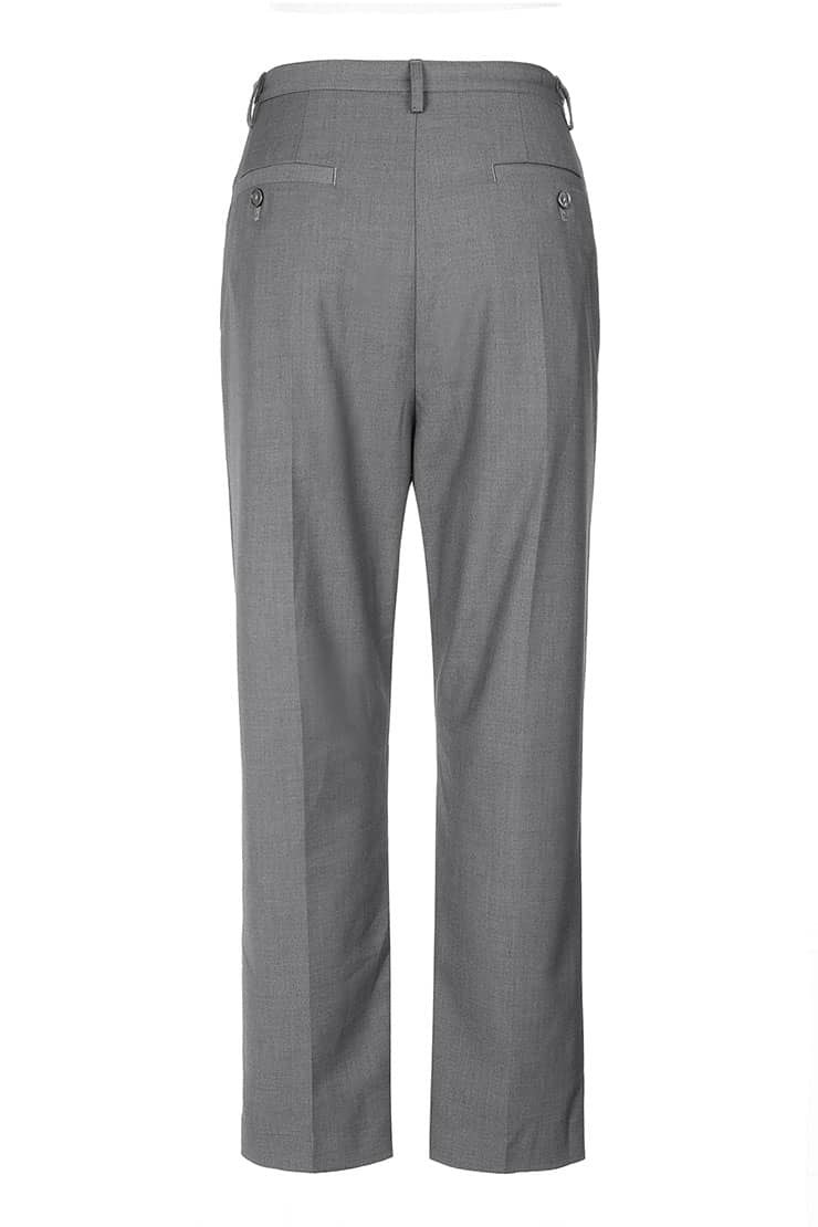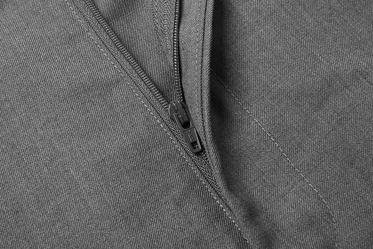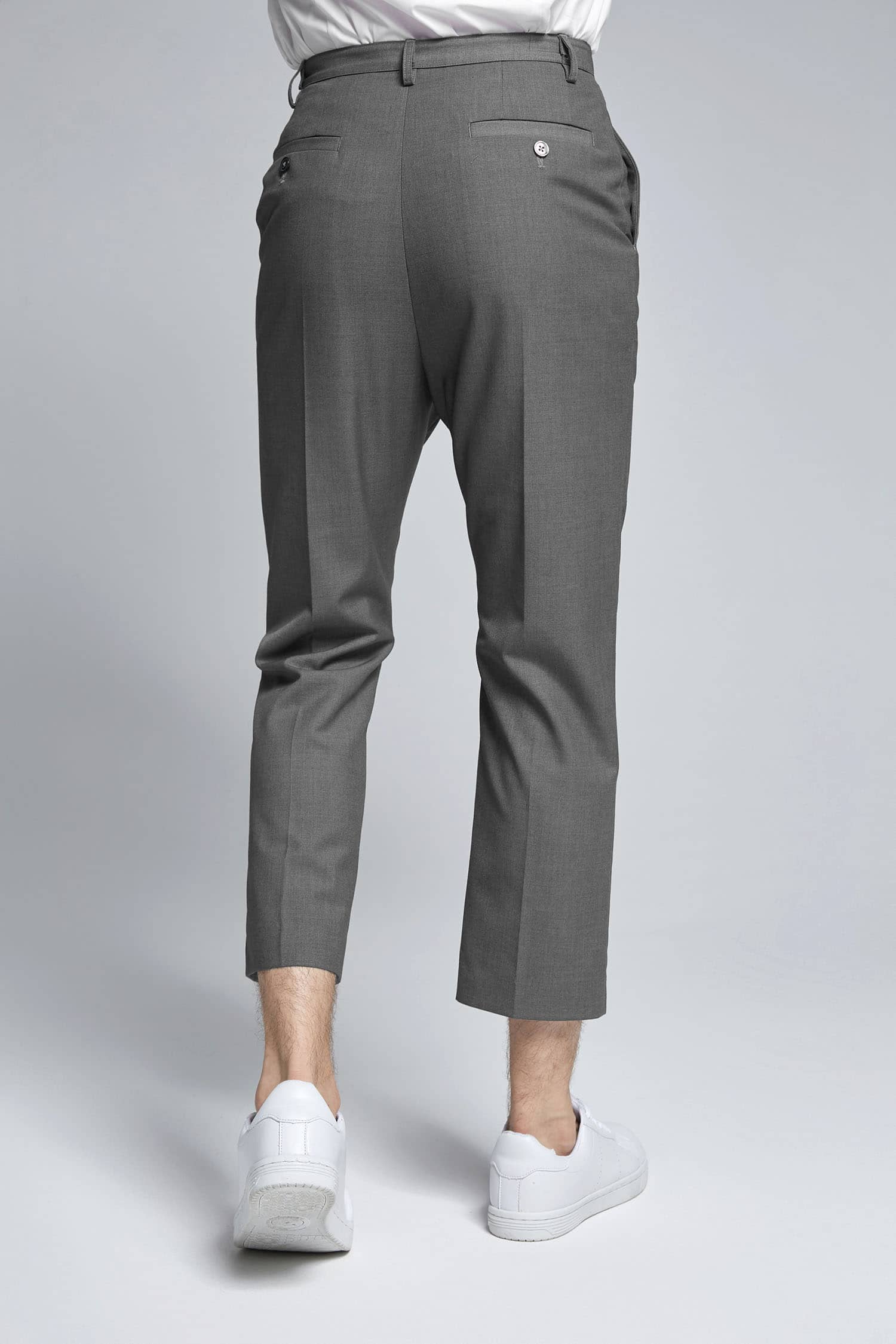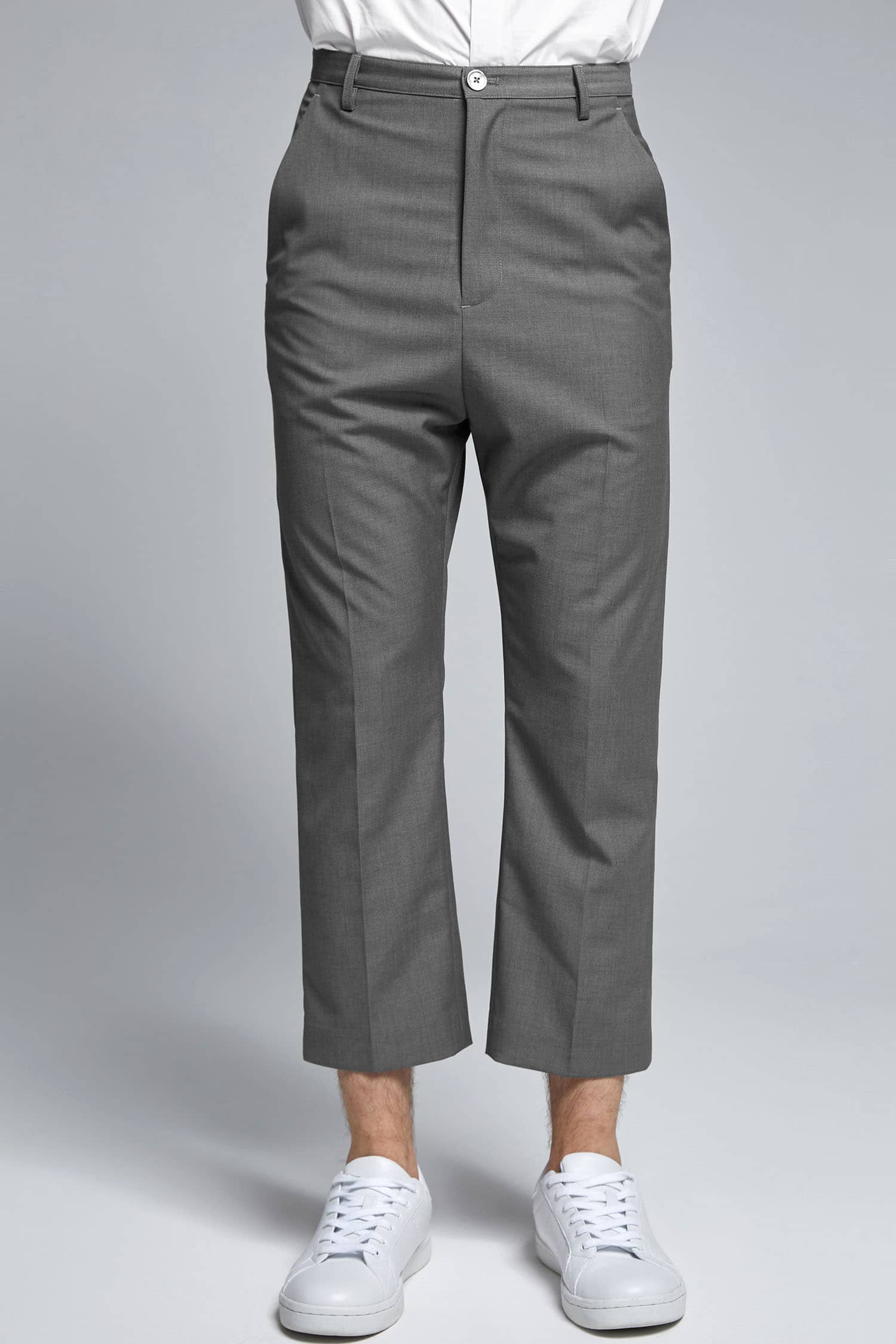 混纺凹凸纹理面料,前中门襟开拉链钉纽扣,前幅两侧对称式斜插袋,后片单唇袋加纽扣固定,合体无省八分裤剪裁,裤腿中缝烫挺缝线,挺括更有型。
