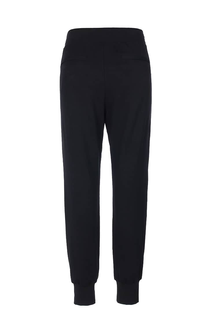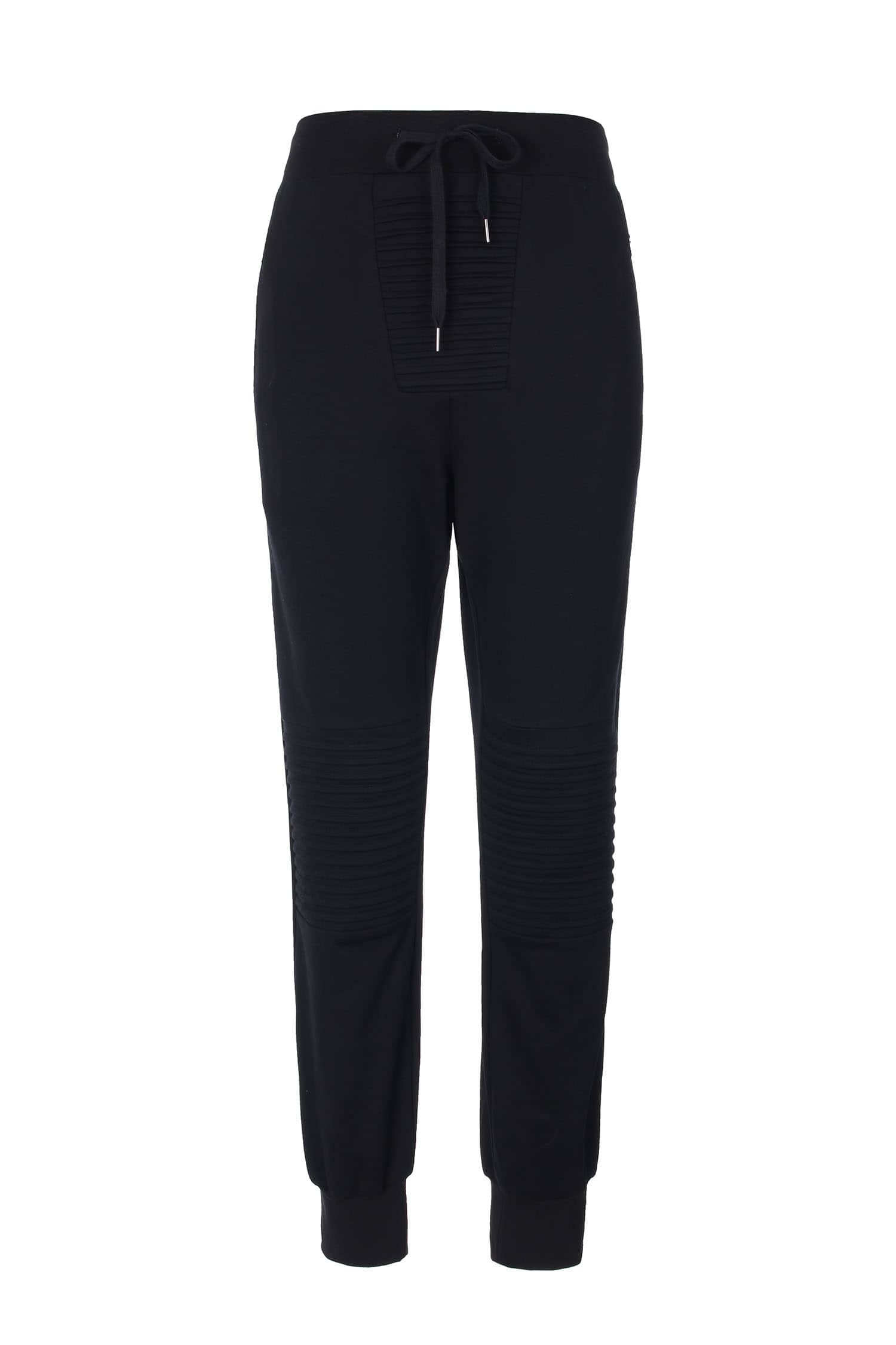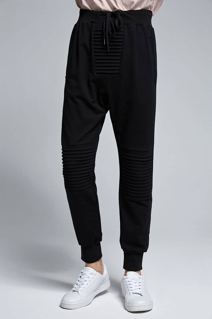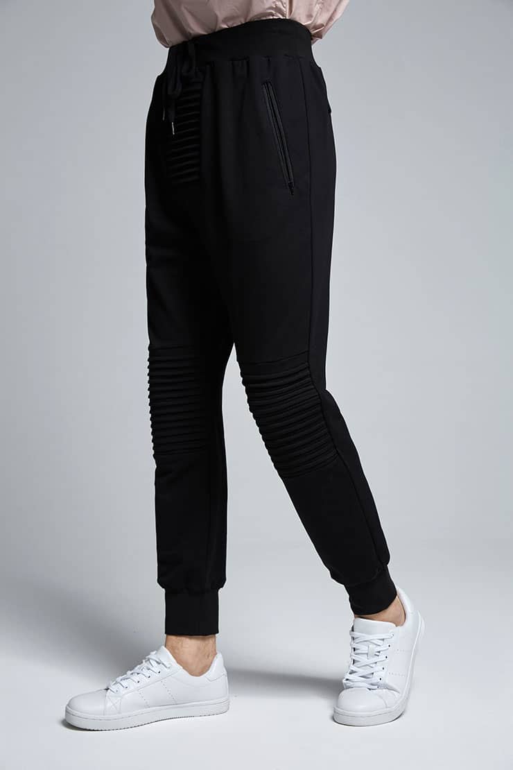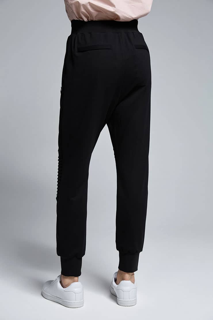 腰带松紧抽绳设计,侧边拉链口袋,裤身前中及膝盖位打条设计,后幅对称单唇袋,落裆束脚,贴合脚踝,宽松萝卜裤型,穿着轻松休闲。