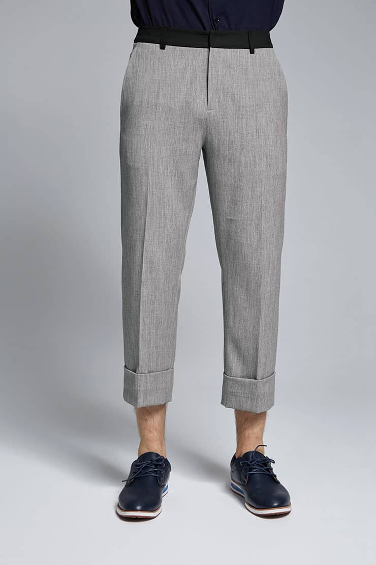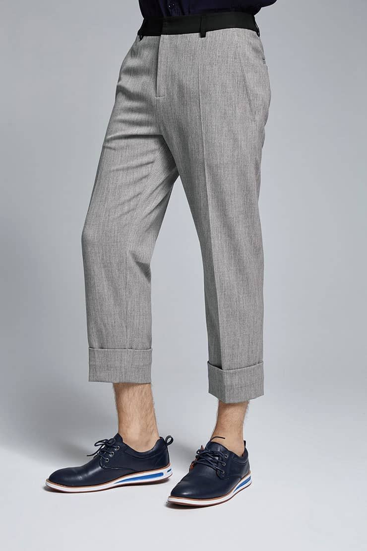 棉质混纺面料,撞色腰头,腰部服帖,两侧斜插袋,袋口上下打枣,后幅单唇袋加纽扣固定,卷裤脚裤剪裁,烫挺缝线,挺阔有型。