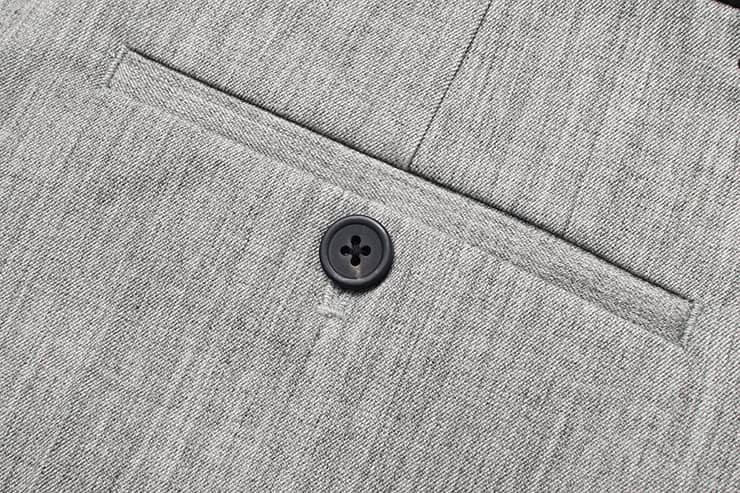 翻驳领,单排两粒扣,圆摆,左胸面贴手巾袋,下边两侧圆角大贴袋,开袖衩无装饰扣,后中下摆开衩,单层不套里布,内缝止口包边,做工精细。