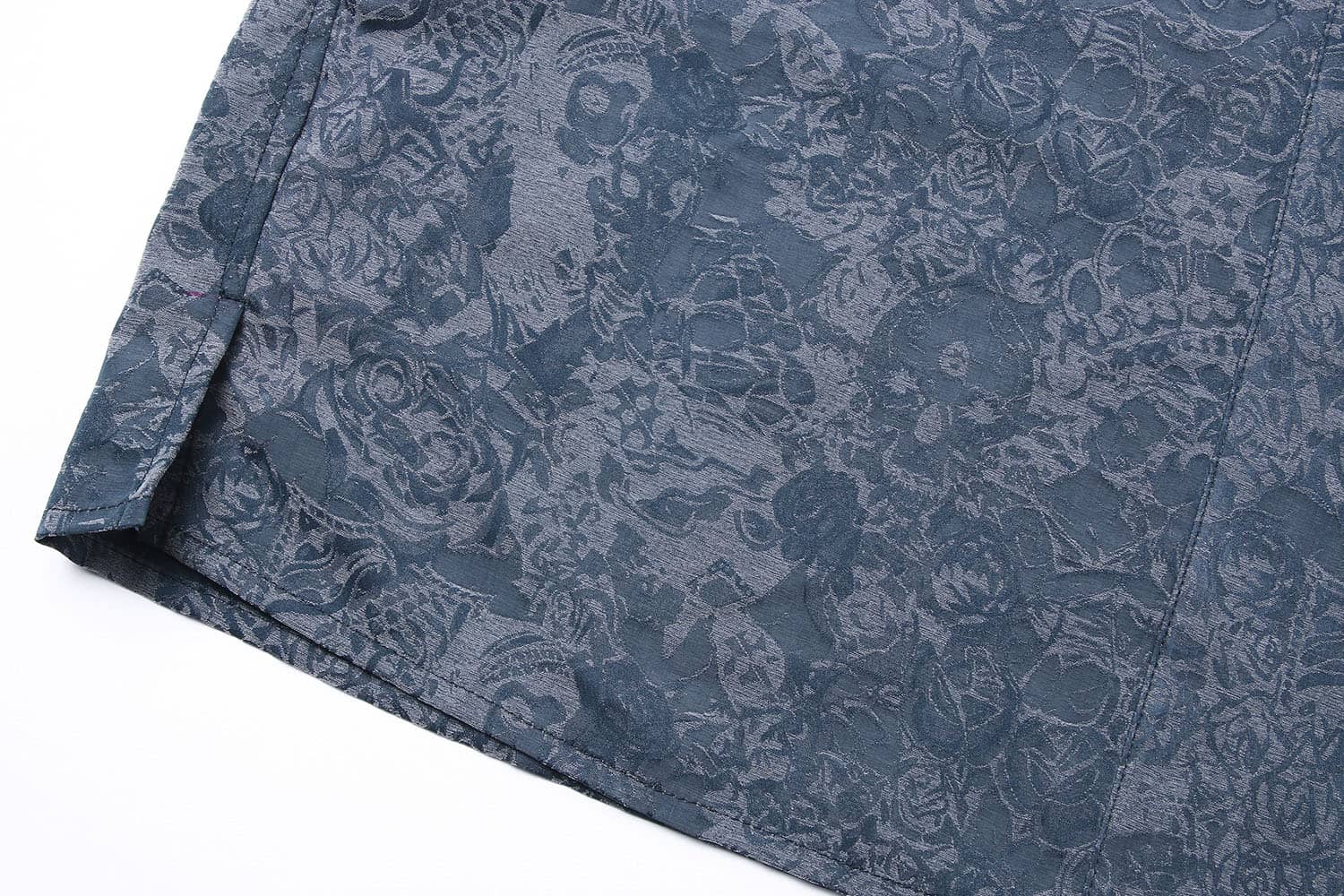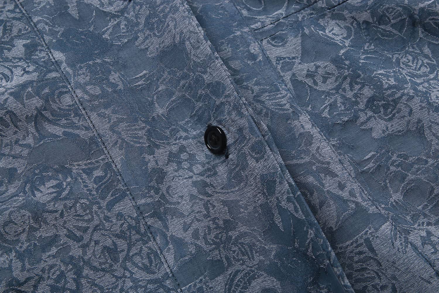 铜氨丝印花长袖衬衣,中式立领,宽暗门襟,左胸前破缝,内藏缝袋,平直下摆,微松版型,自然随性。