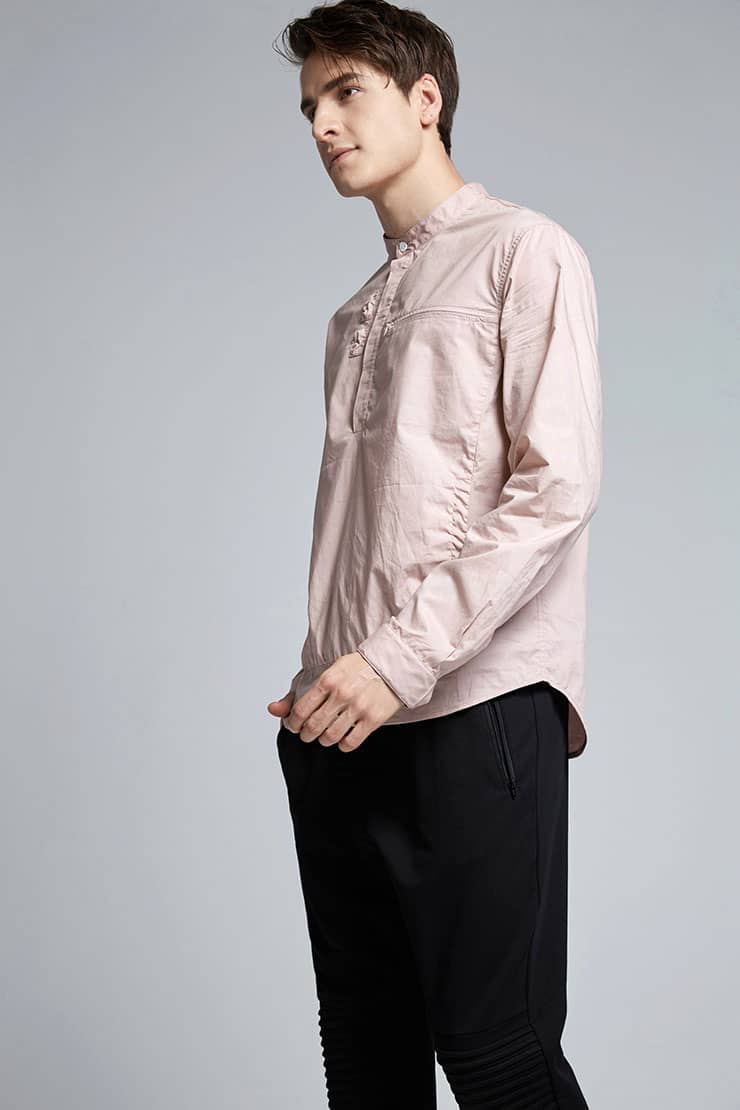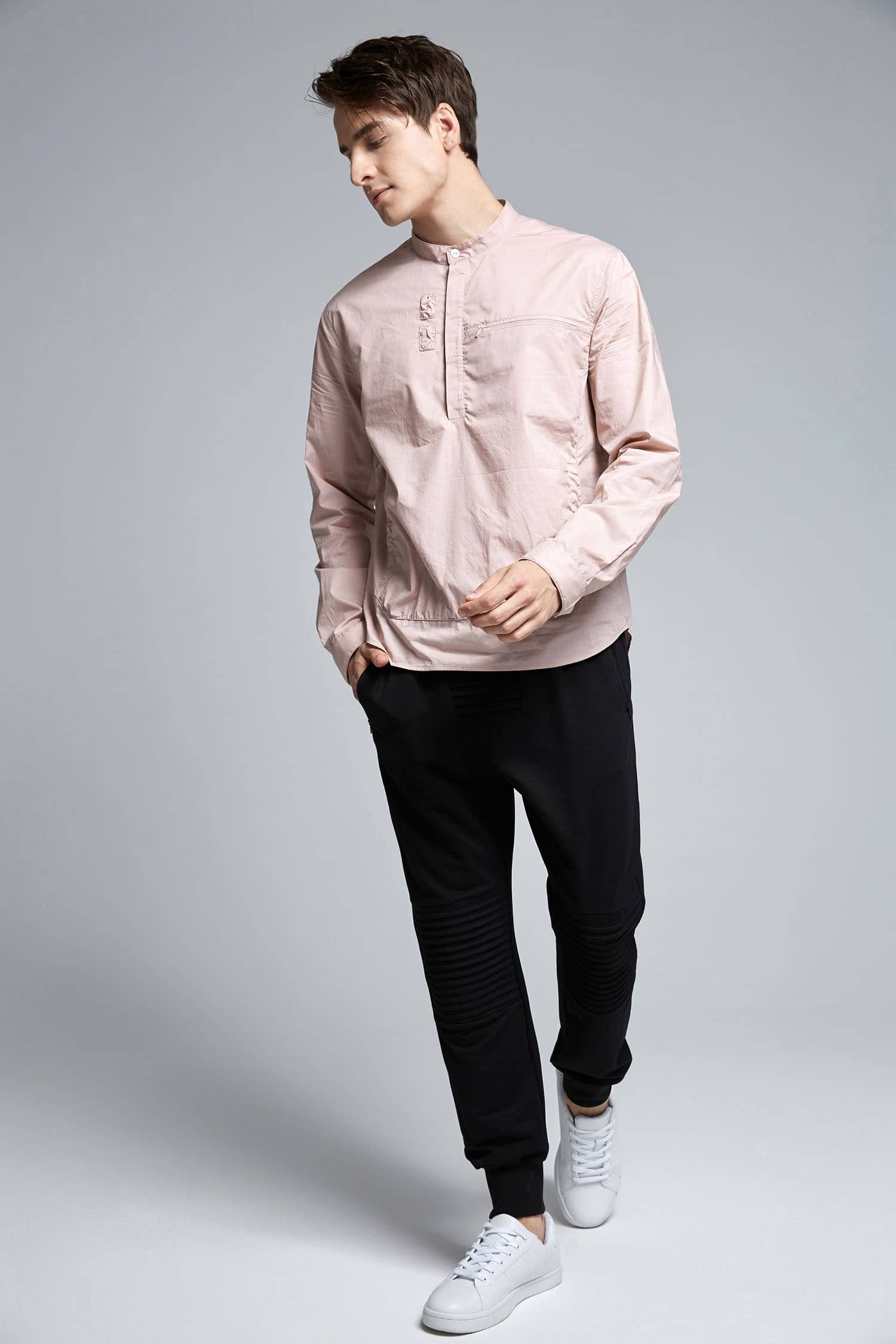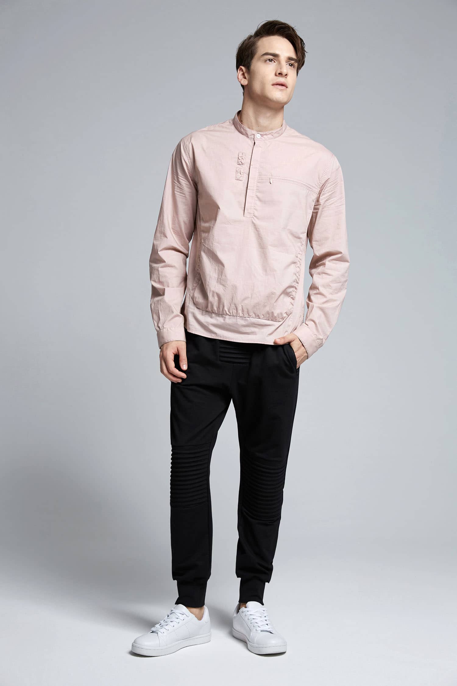纯棉套头长袖衬衫,颜色温润低调,小立领结合半开暗襟设计,左胸前拉链口袋,右胸前打补丁装饰,下边两侧插袋,弧形下摆,简约大方,使轮廓充满设计感。