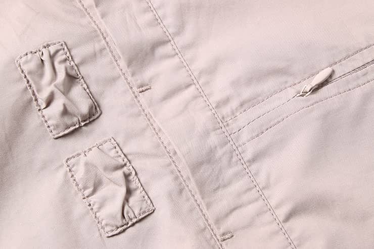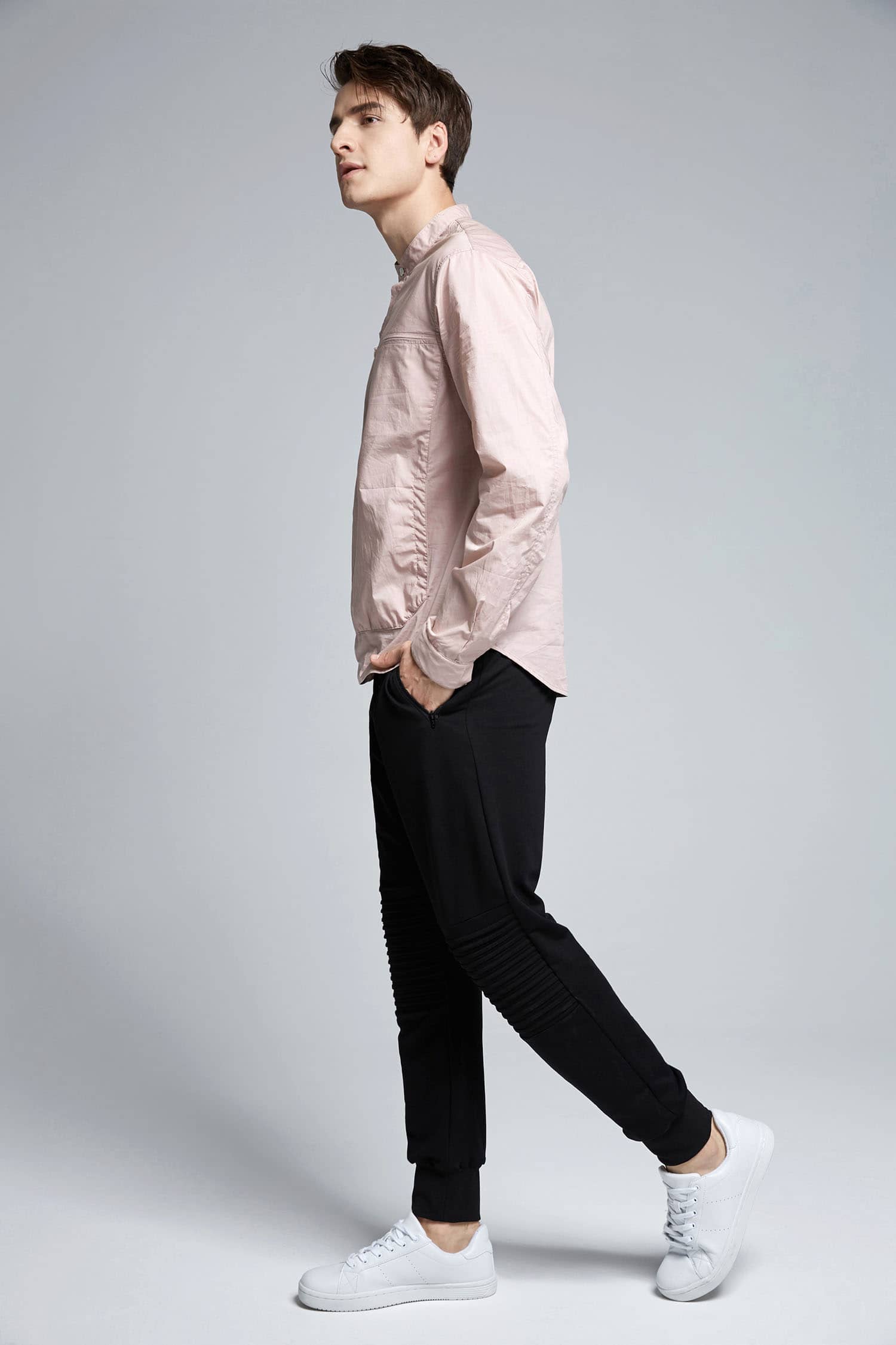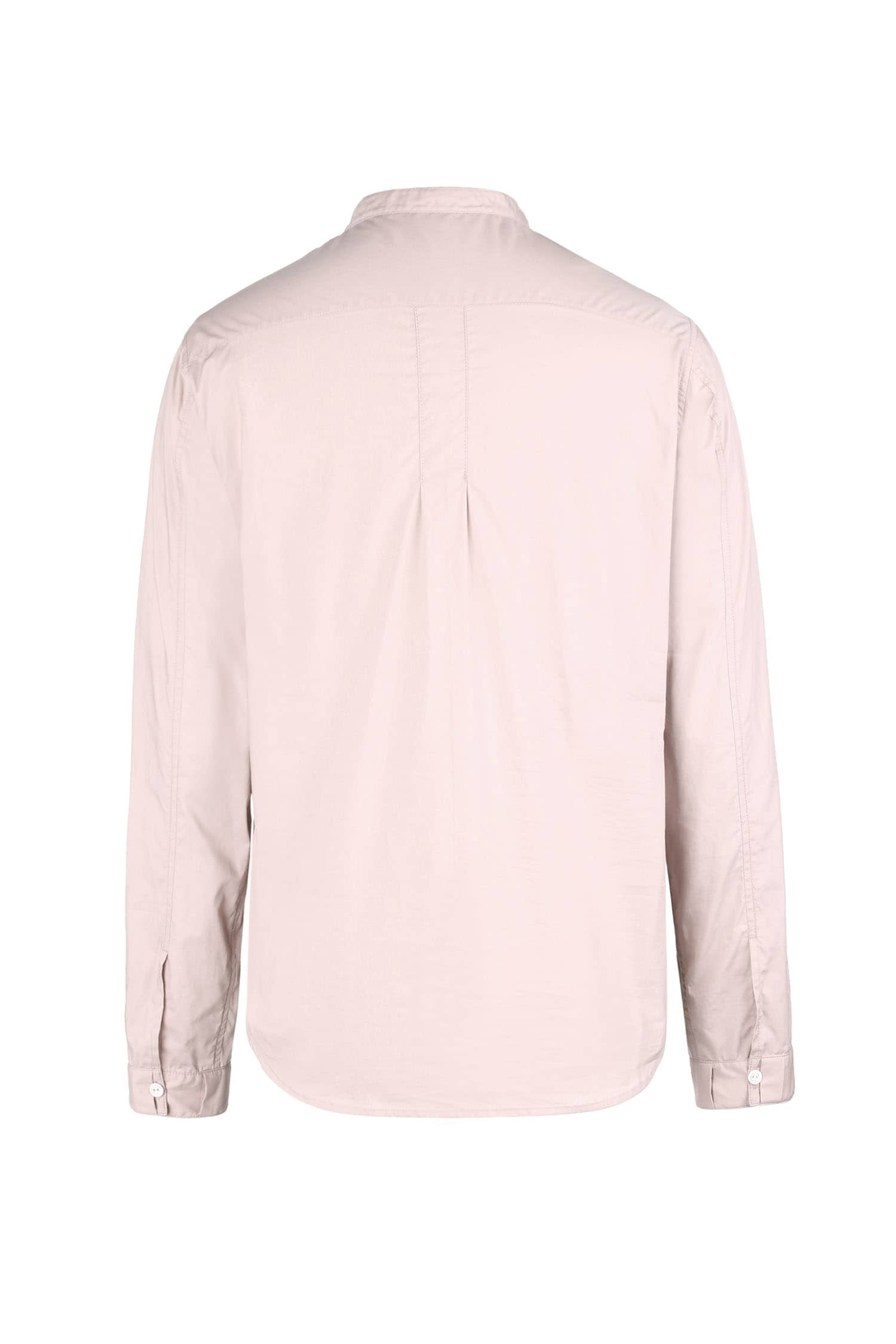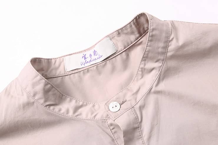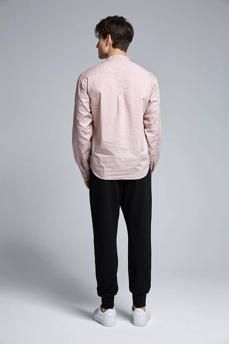 纯棉套头长袖衬衫,颜色温润低调,小立领结合半开暗襟设计,左胸前拉链口袋,右胸前打补丁装饰,下边两侧插袋,弧形下摆,简约大方,使轮廓充满设计感。