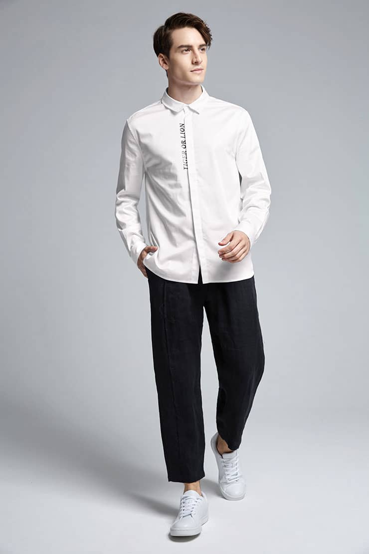 采用亚麻色织的面料,腰带松紧抽绳,前中开门襟钉纽扣,两侧斜插袋,不对称的面料拼接,拼缝毛边,后袋简约一字袋,宽松萝卜裤型,九分裤长,个性随性。
