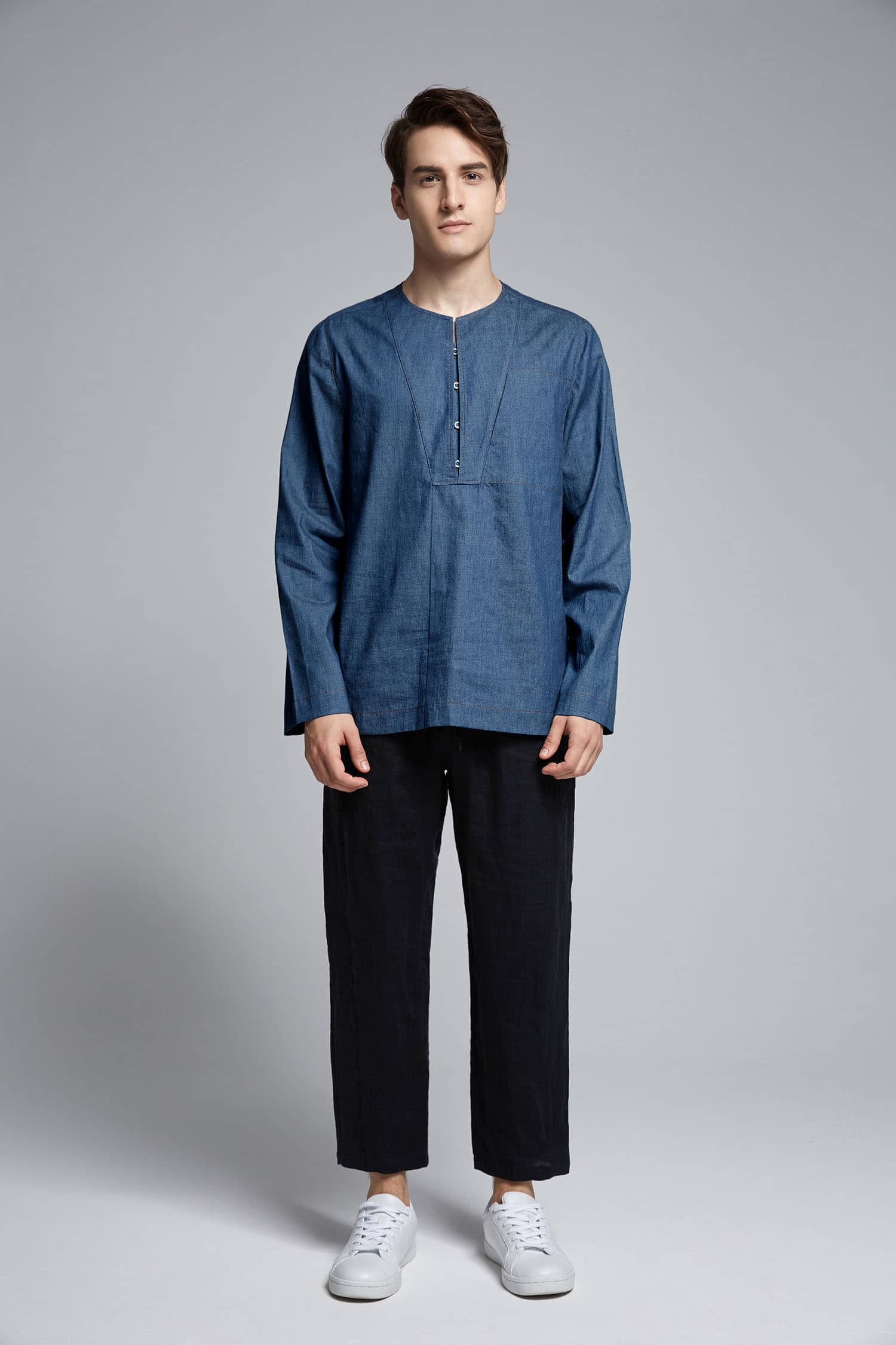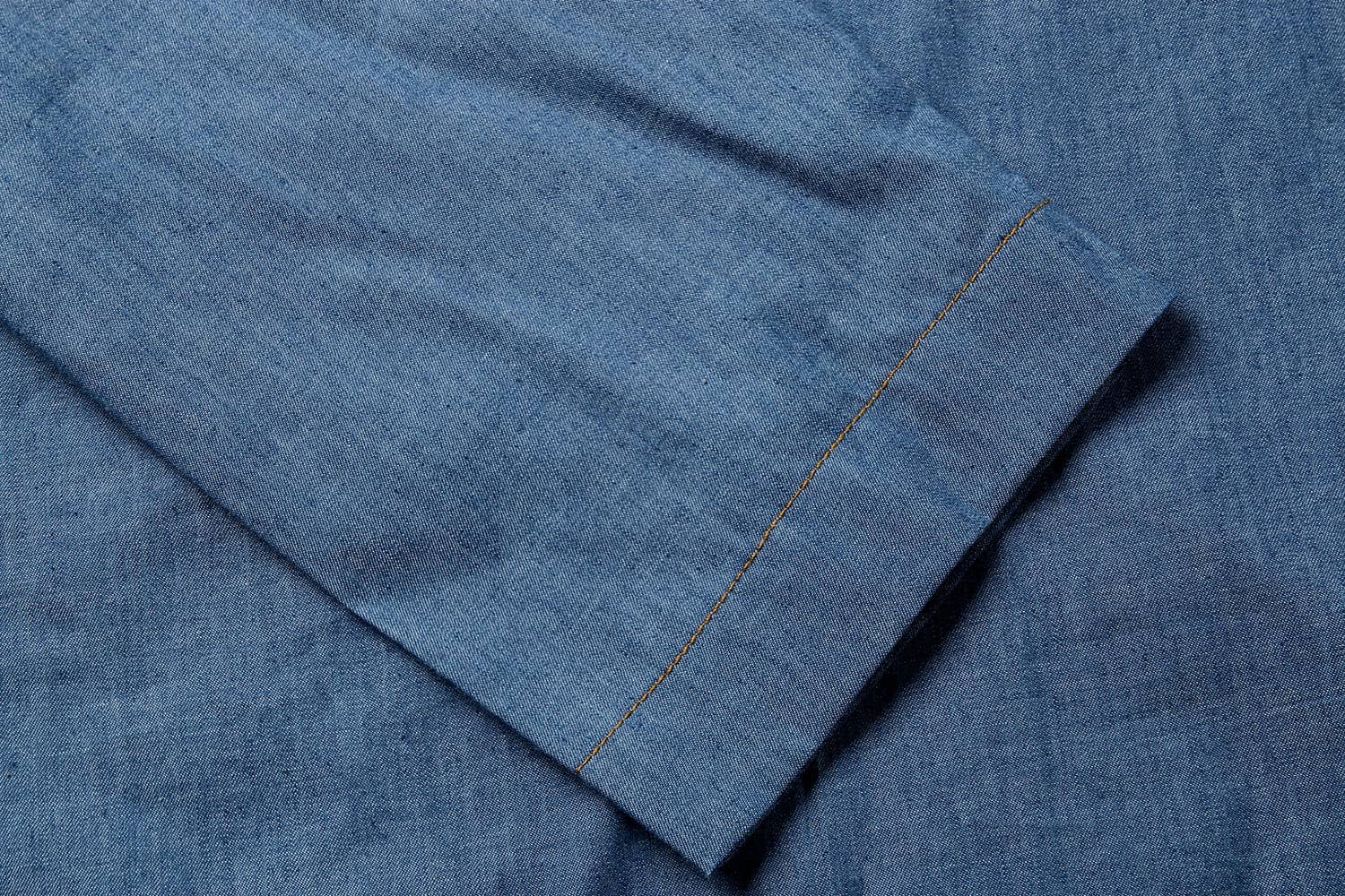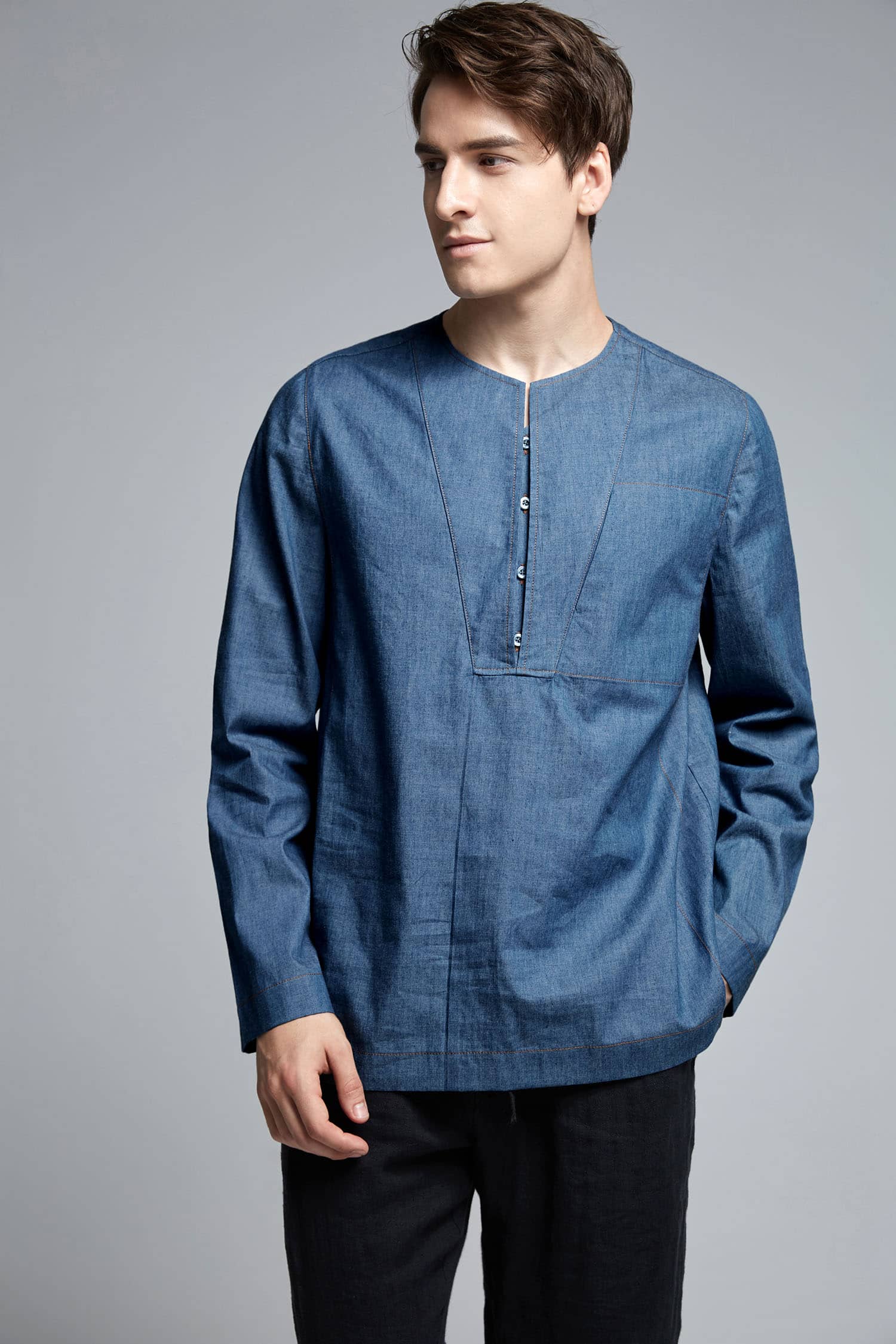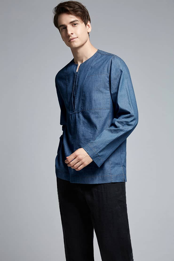 纯棉牛仔长袖衬衫,圆领半开襟双层设计,搭配胸前挖袋,衣服撞色辑明线,勾勒简约时尚轮廓,微松的版型剪裁,直线下摆,侧开衩,穿着舒适。
