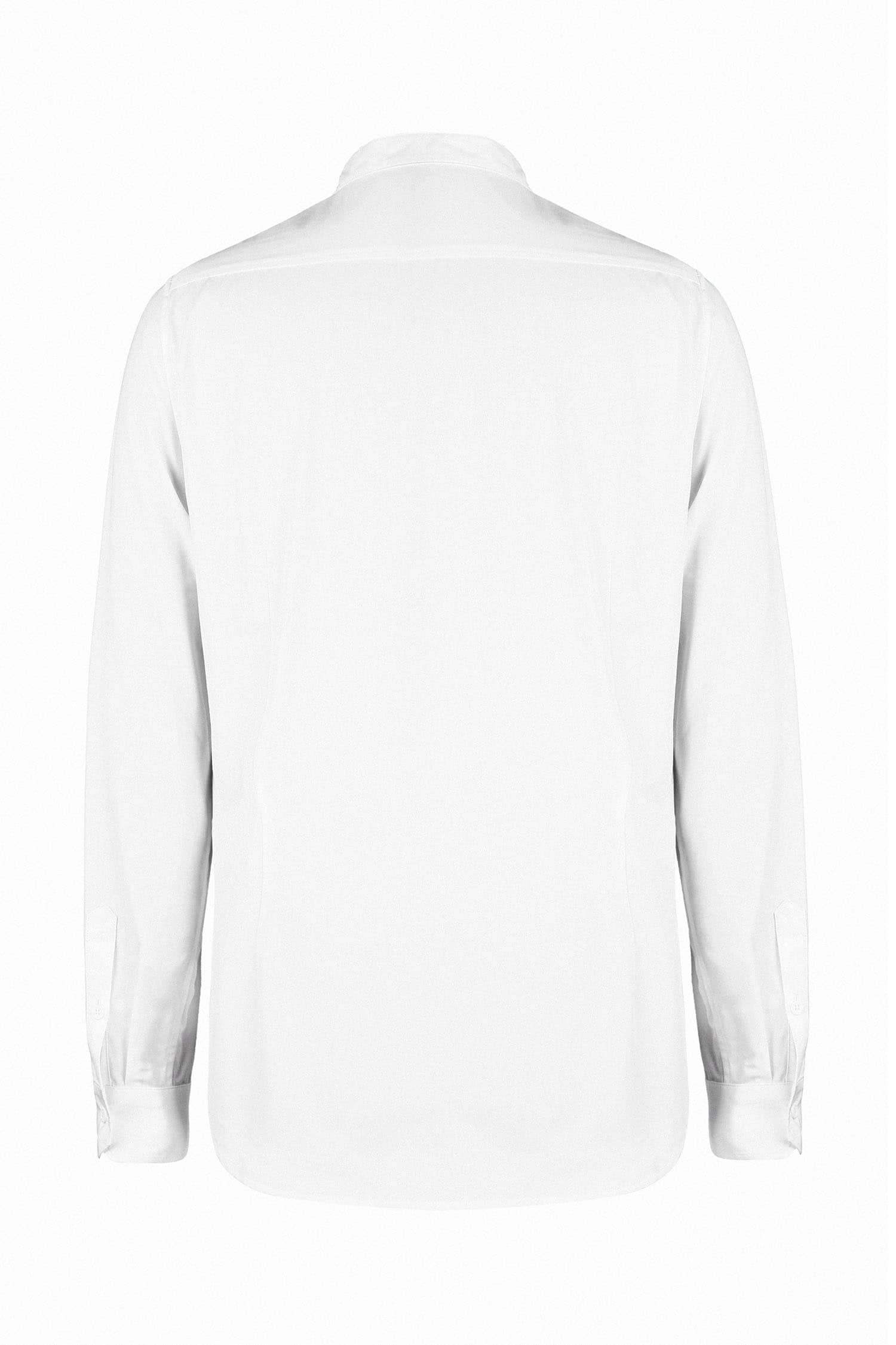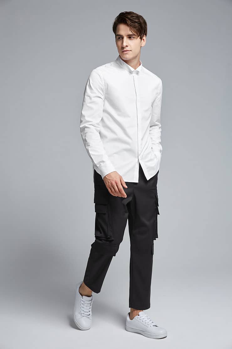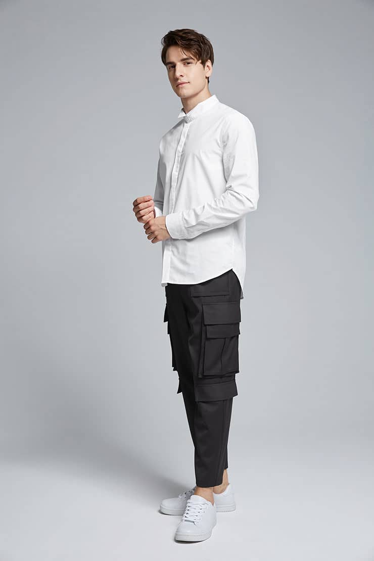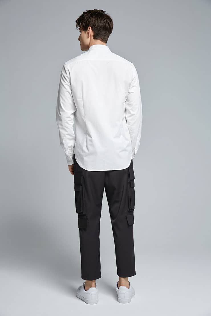 棉质长袖衬衣,小双翼领,前襟暗门襟,后背担干分割,弧形下摆,袖口方角角叠门,合体版型,后腰、侧缝收省,打造舒适合体廓形。