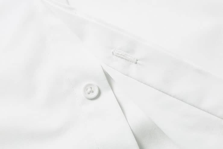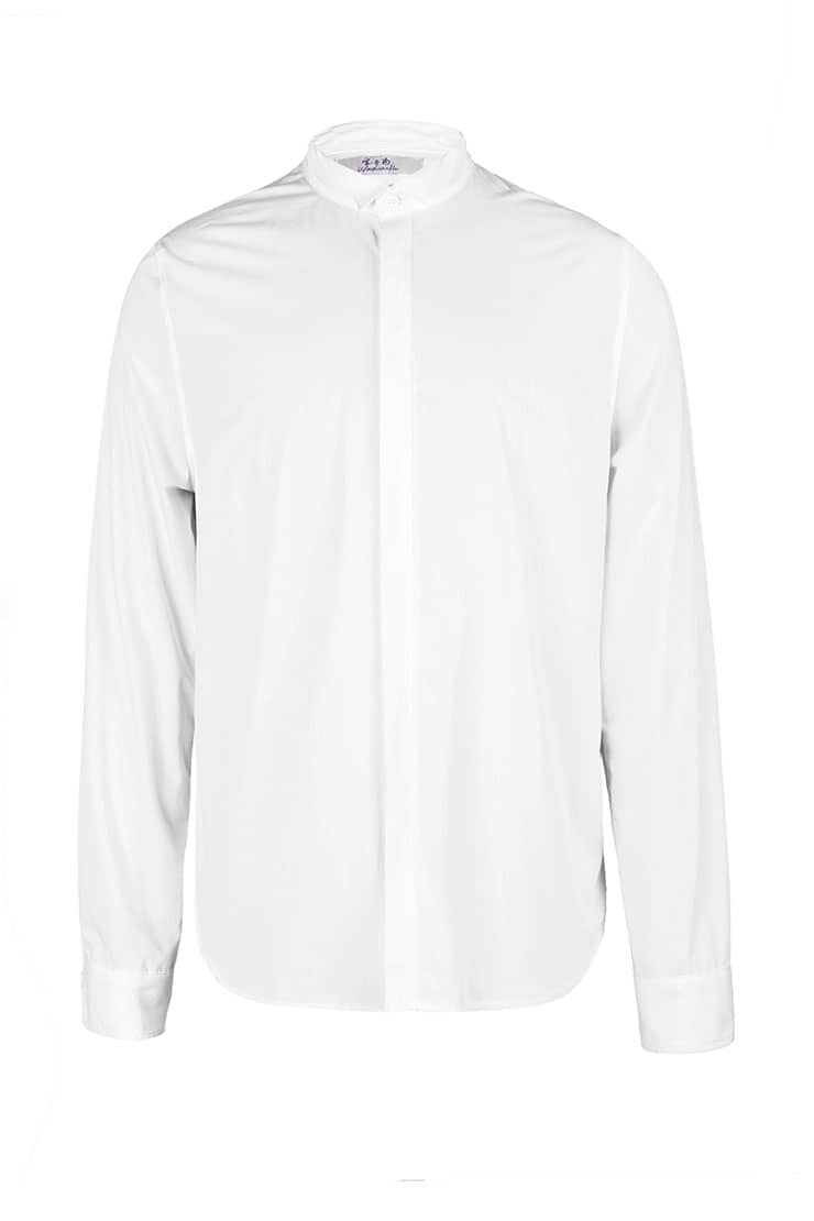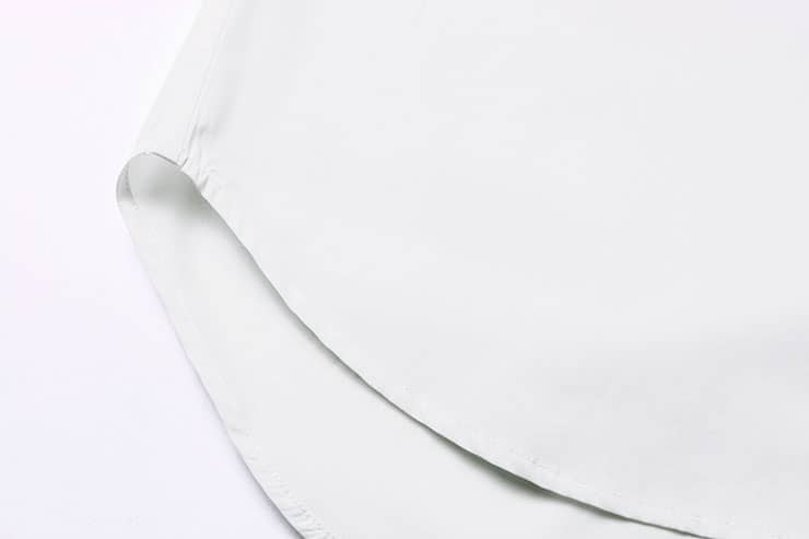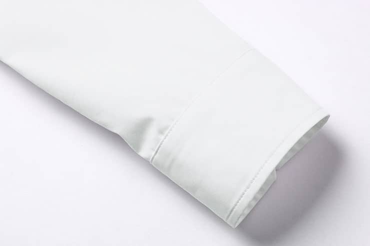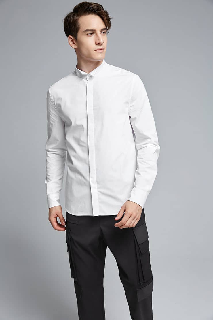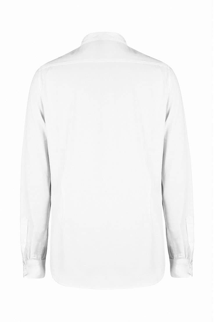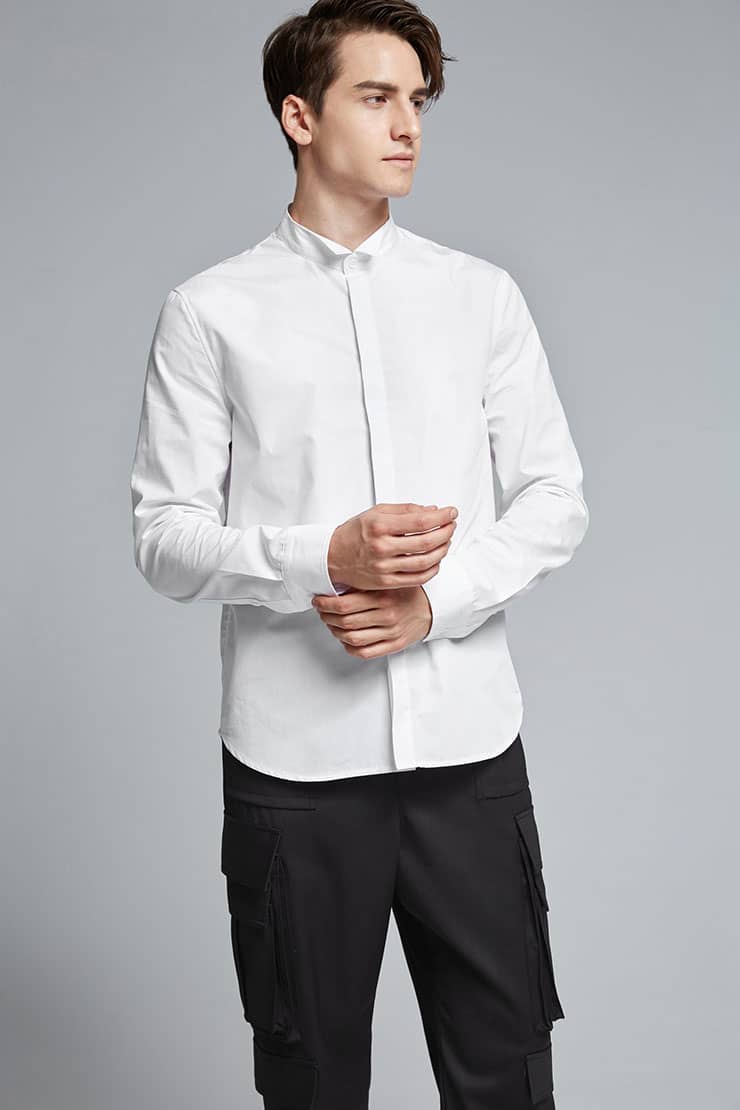 棉质长袖衬衣,小双翼领,前襟暗门襟,后背担干分割,弧形下摆,袖口方角角叠门,合体版型,后腰、侧缝收省,打造舒适合体廓形。
