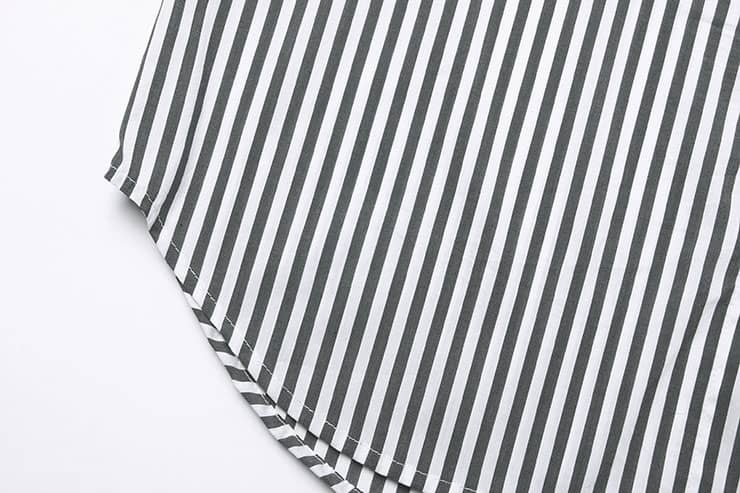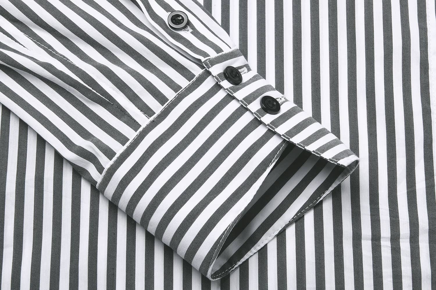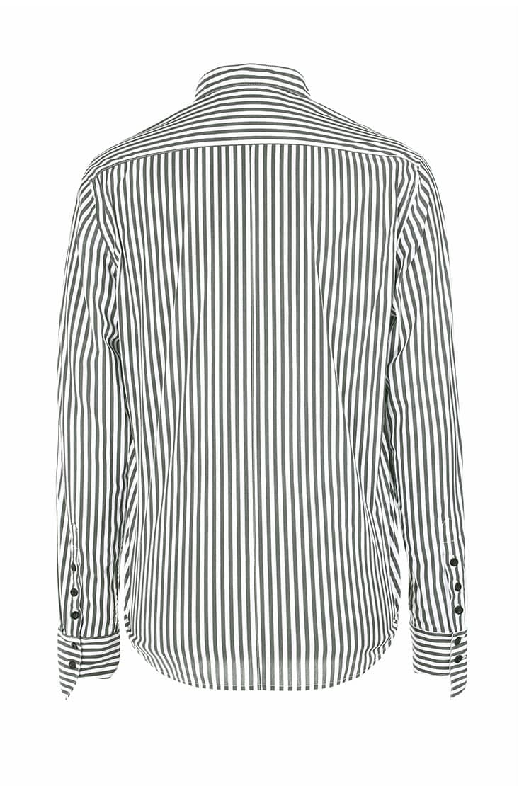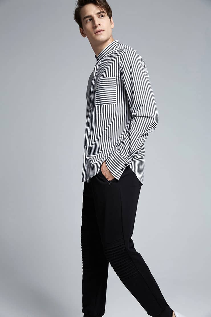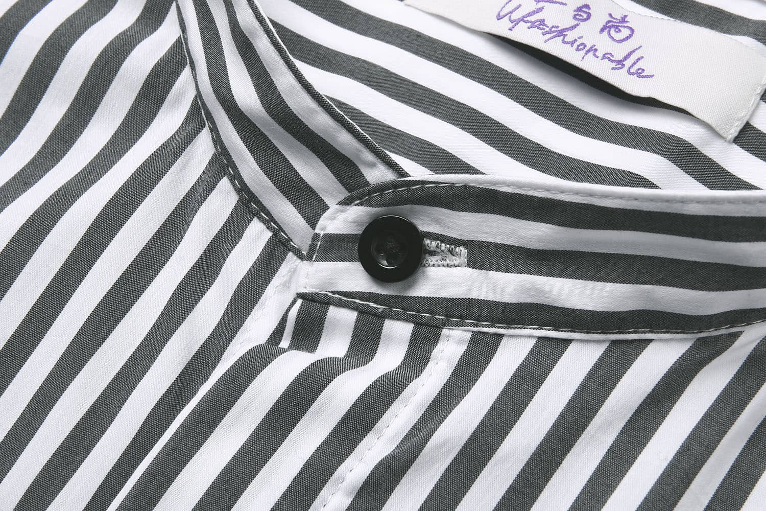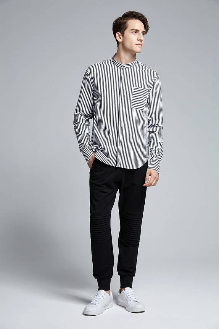 纯棉长袖衬衣,平直小立领,经典暗门襟,左前胸拼条直角贴袋,后背担干分割,后中牙签褶,弧形下摆,袖口冒尖角叠门,合体版型,打造舒适合体廓形。