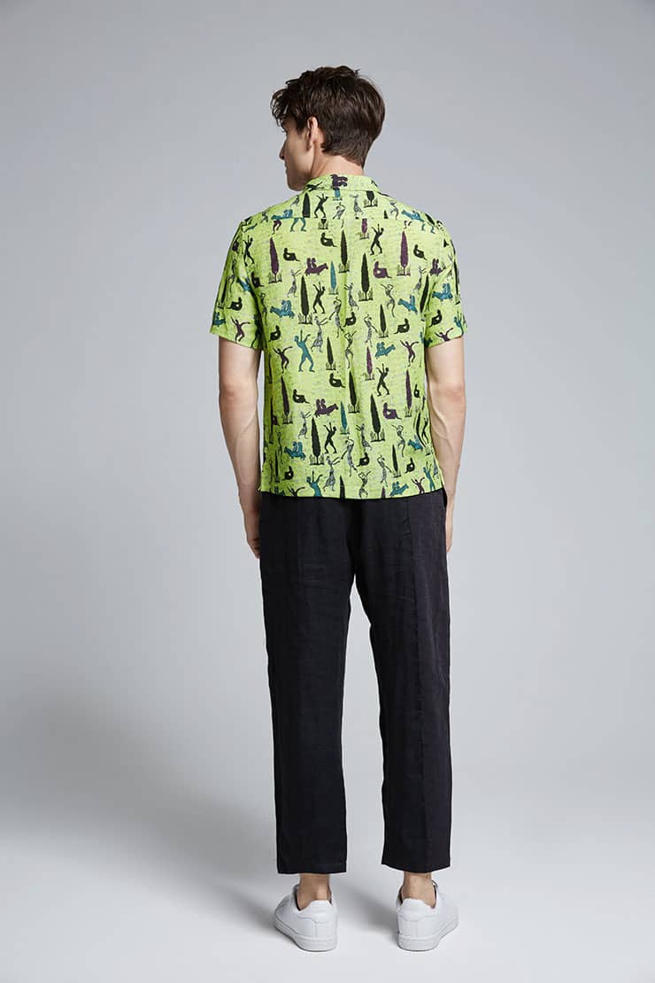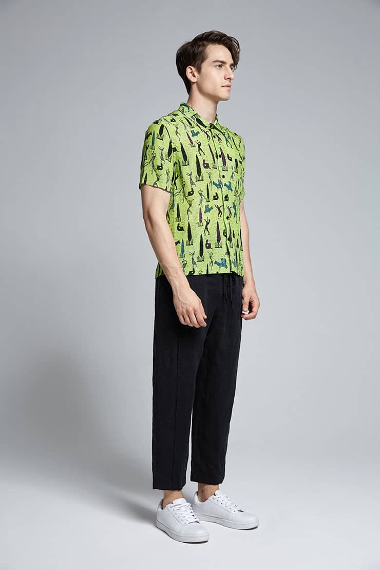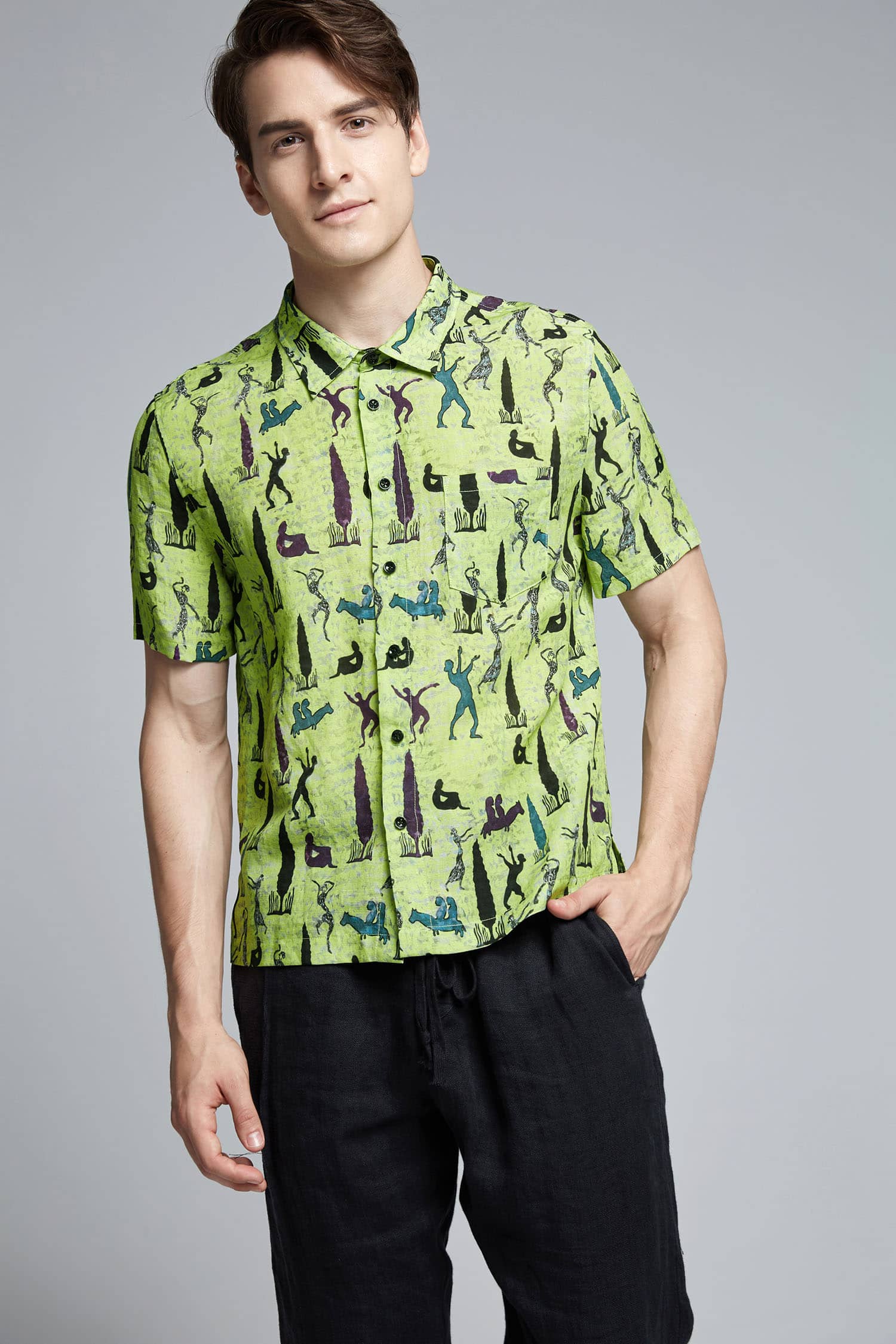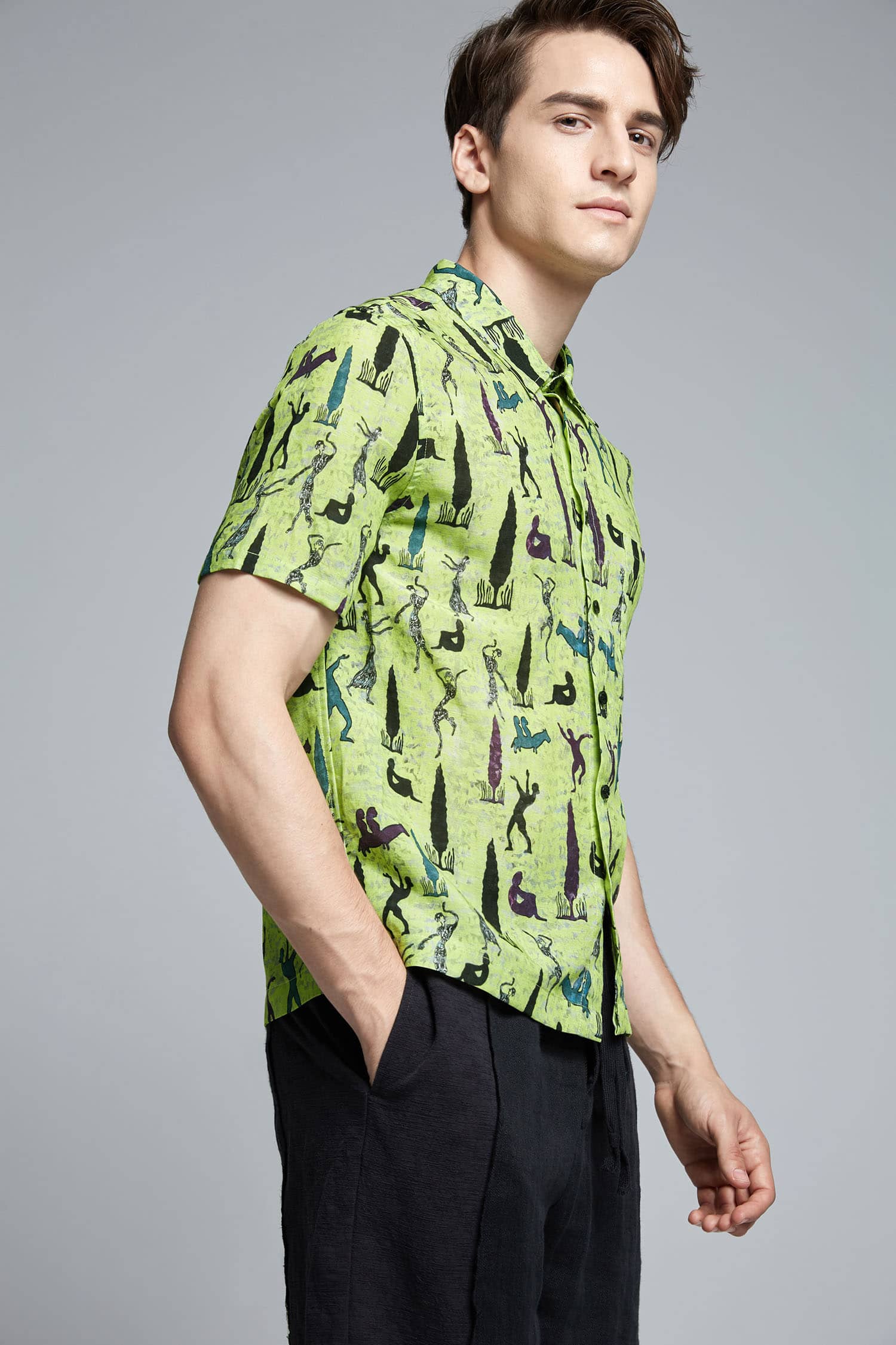 亚麻印花短袖衬衣,尖角企领,经典前襟,左前胸贴袋,后背担干分割,平直下摆,侧下摆开衩,打造舒适合体版型。