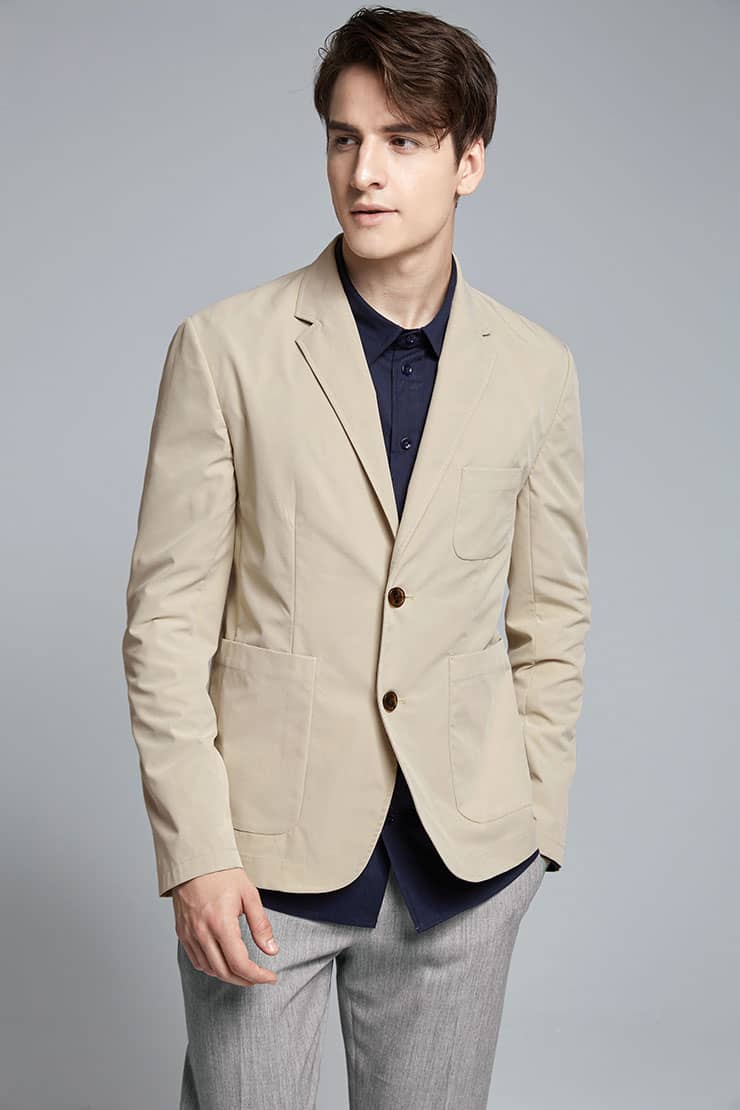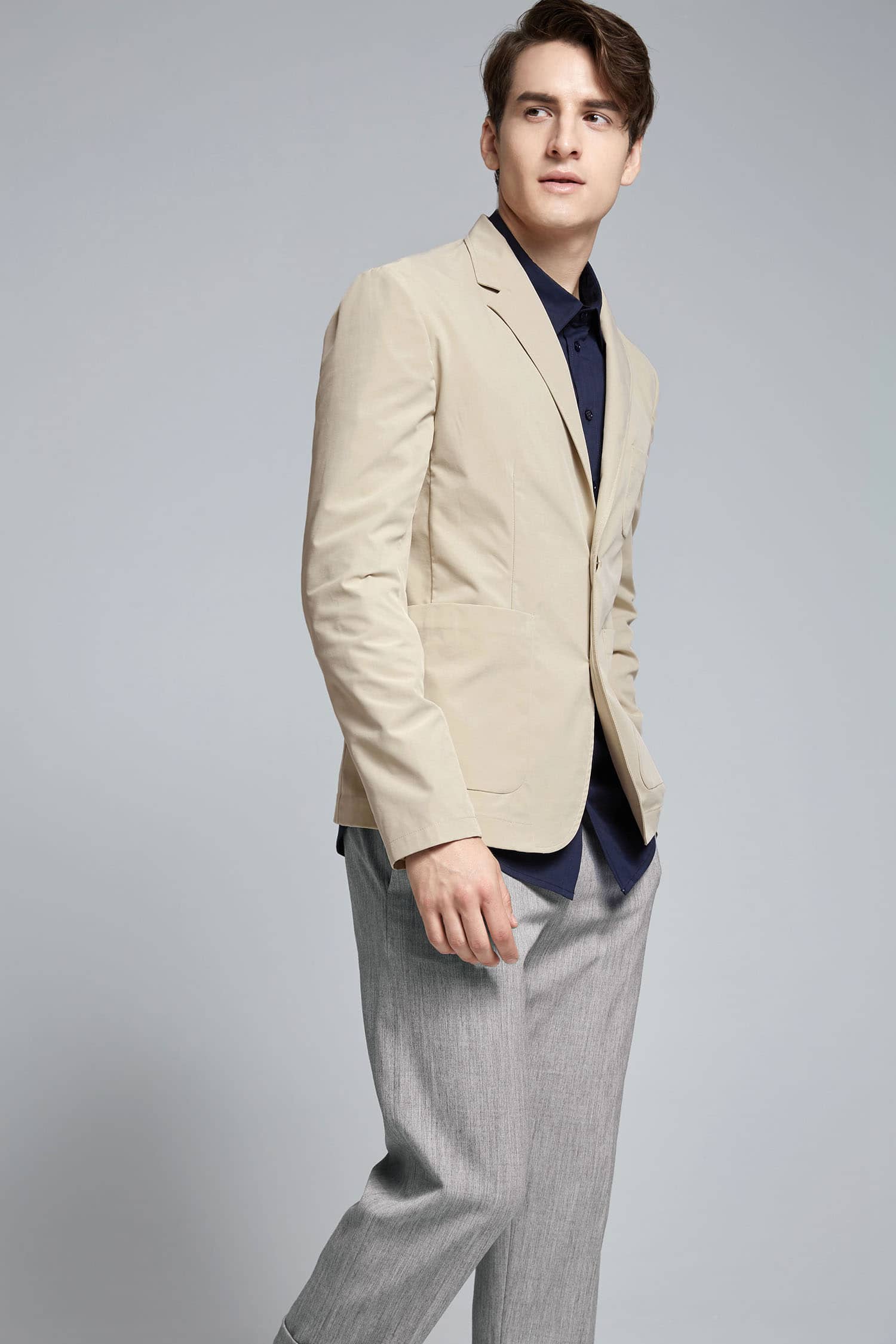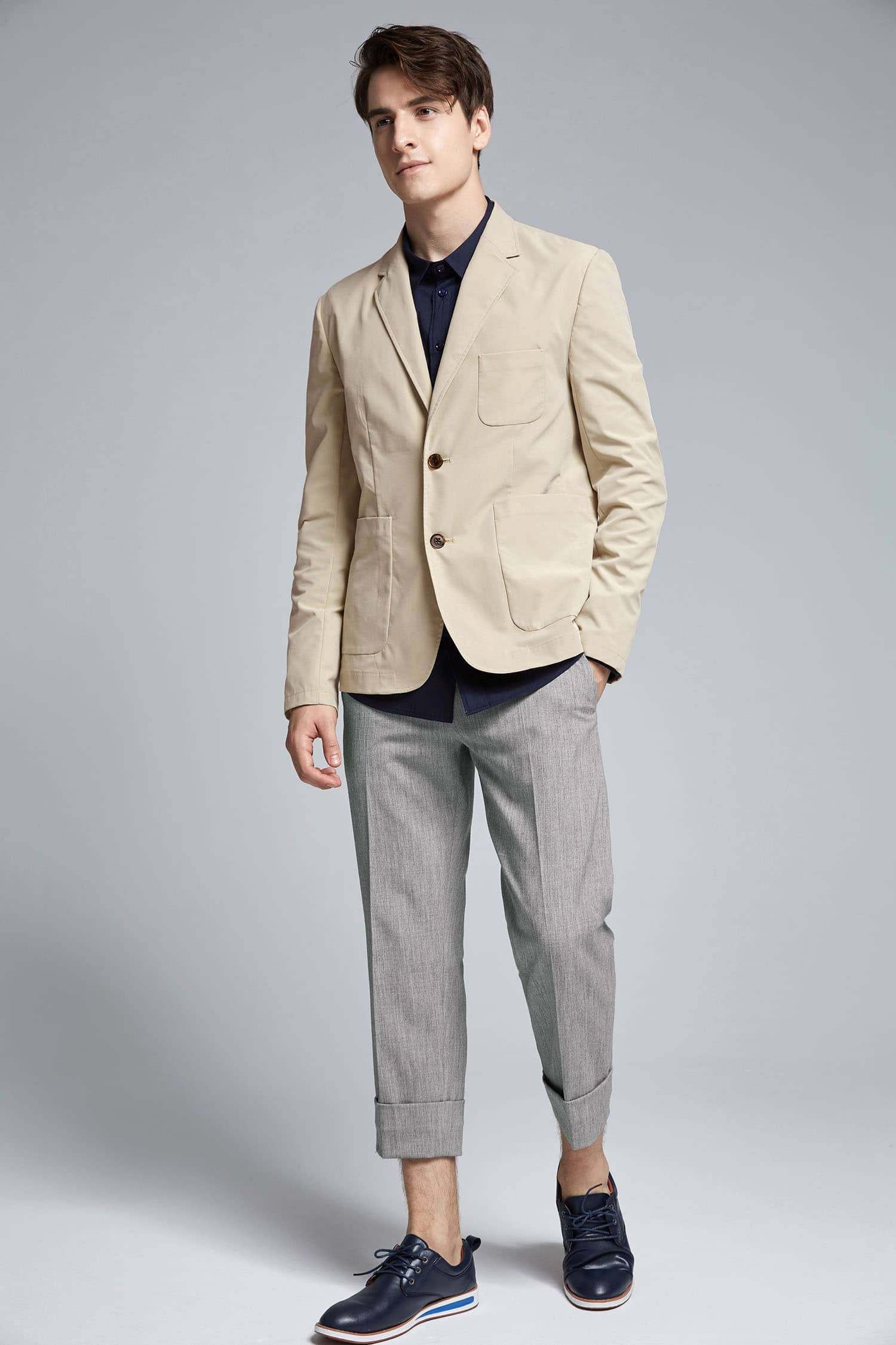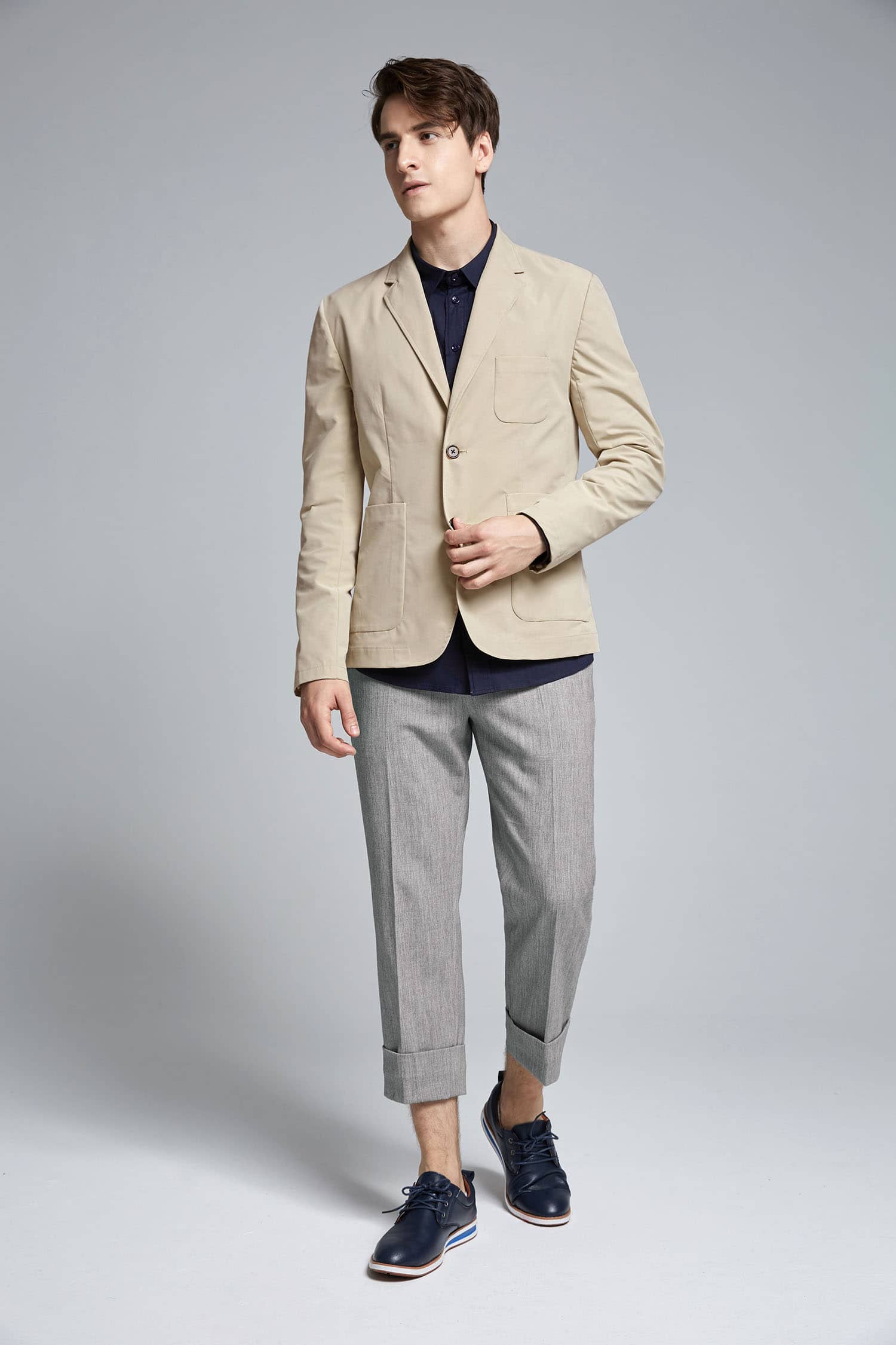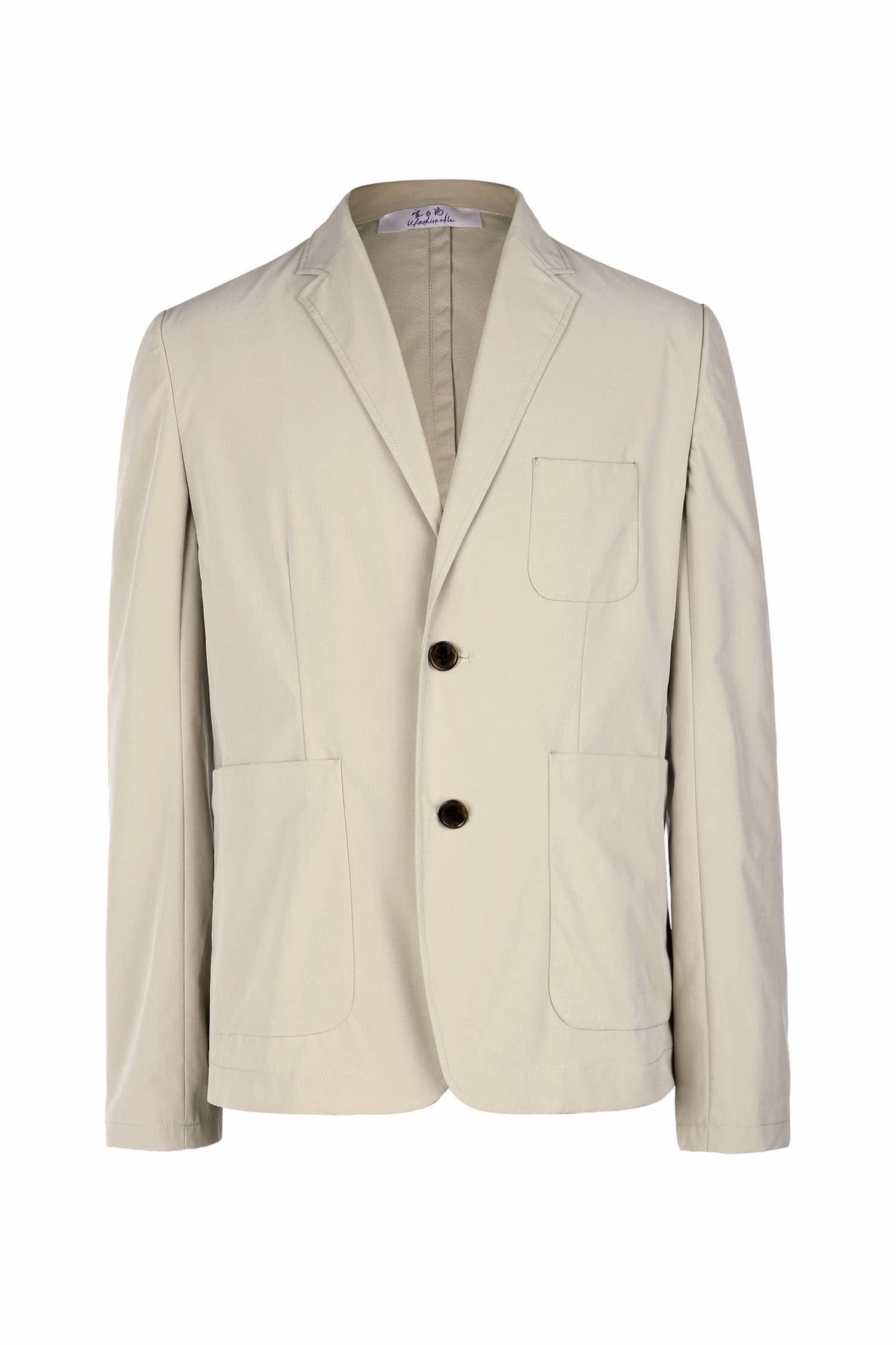 翻驳领,单排两粒扣,圆摆,左胸面贴手巾袋,下边两侧圆角大贴袋,开袖衩无装饰扣,后中下摆开衩,单层不套里布,内缝止口包边,做工精细。