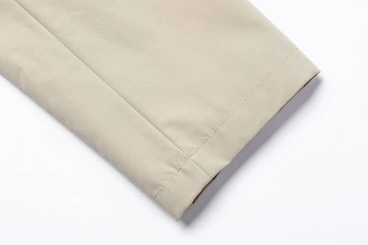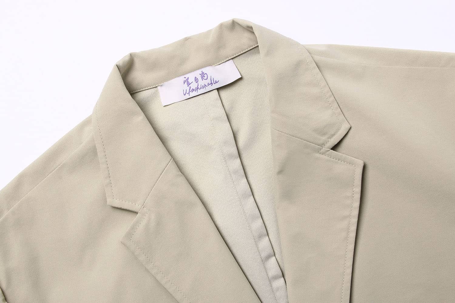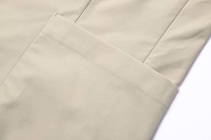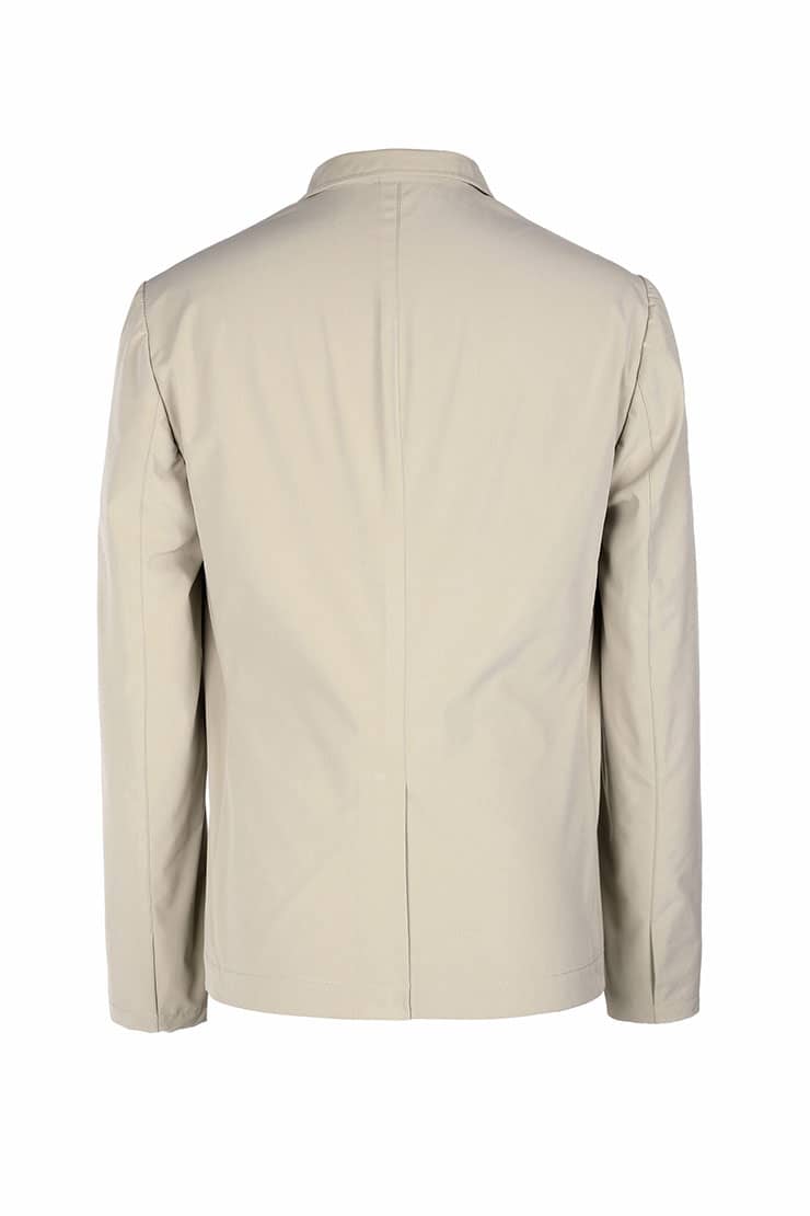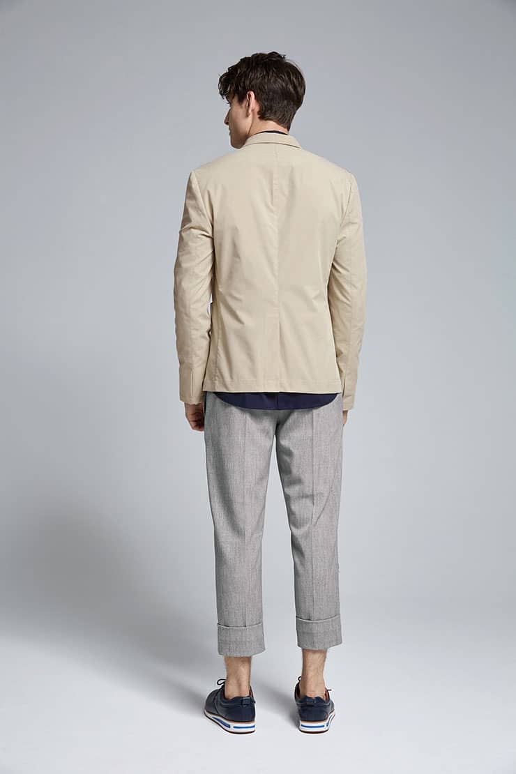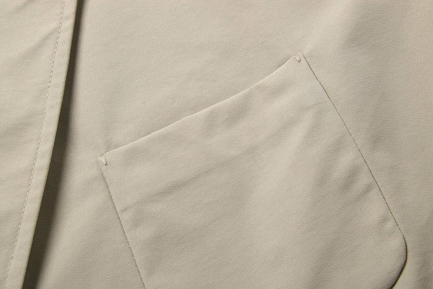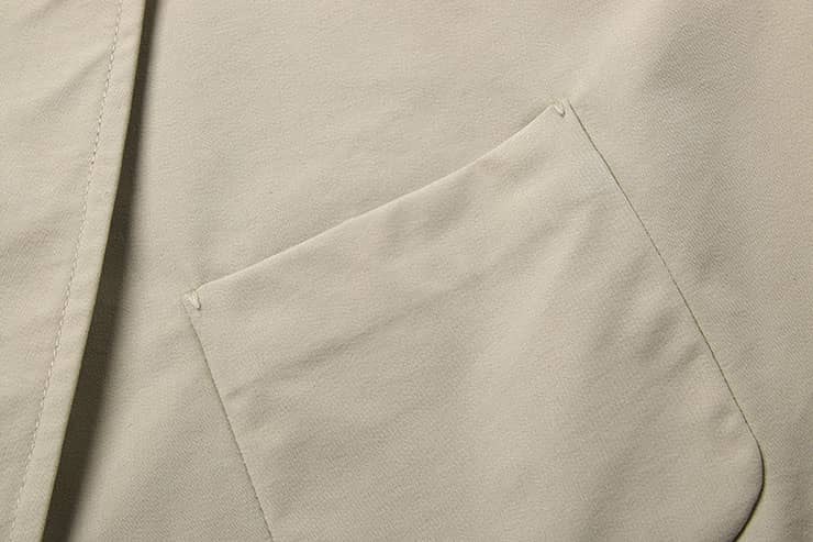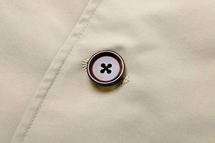 翻驳领,单排两粒扣,圆摆,左胸面贴手巾袋,下边两侧圆角大贴袋,开袖衩无装饰扣,后中下摆开衩,单层不套里布,内缝止口包边,做工精细。