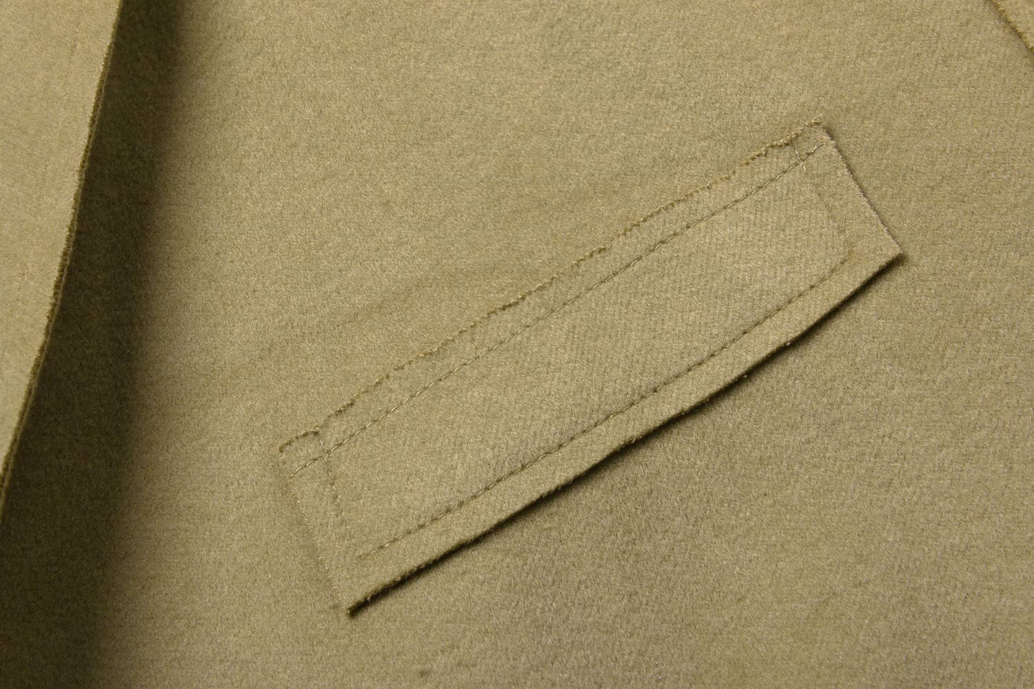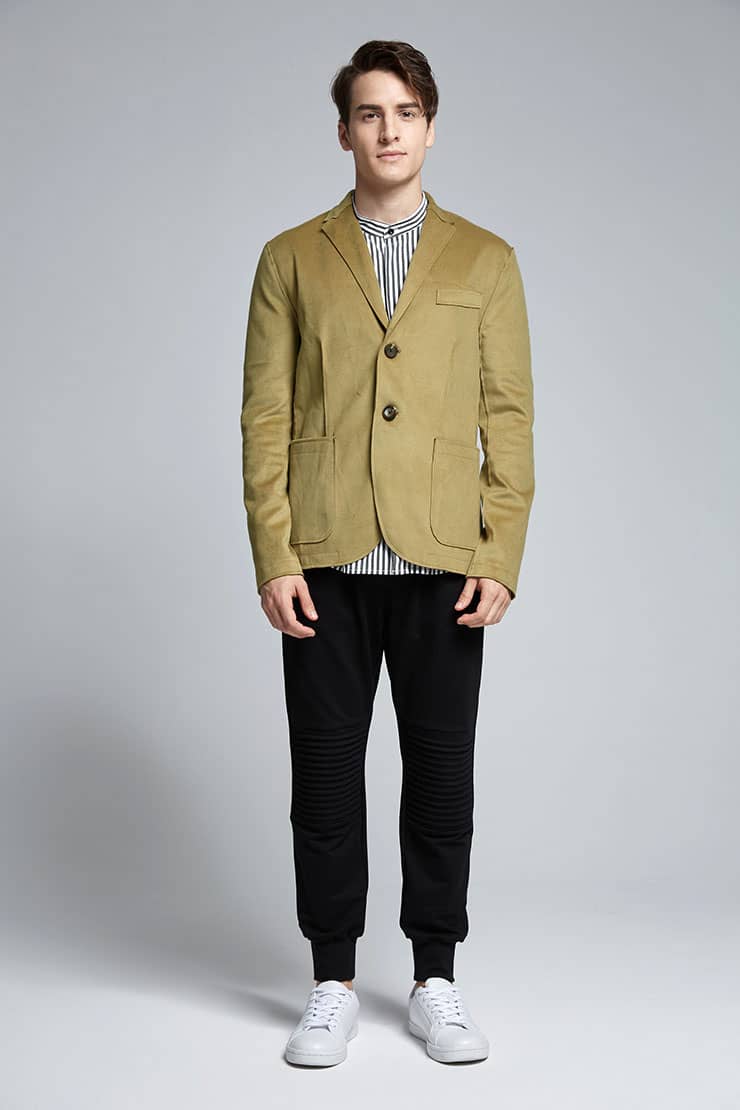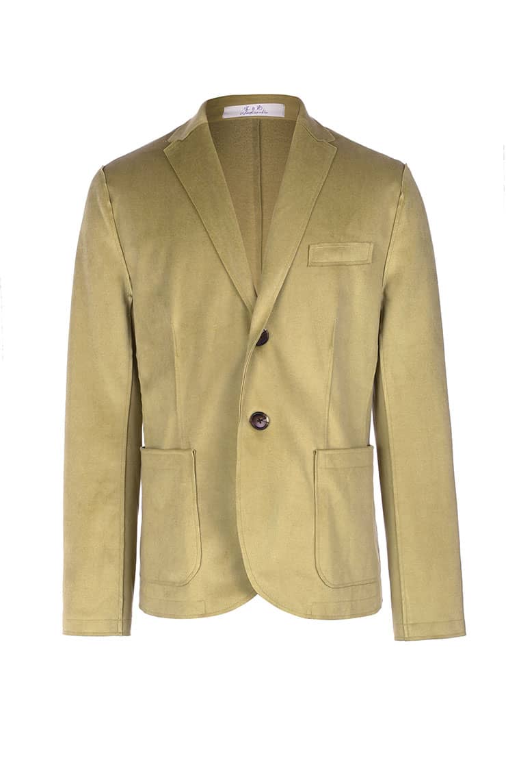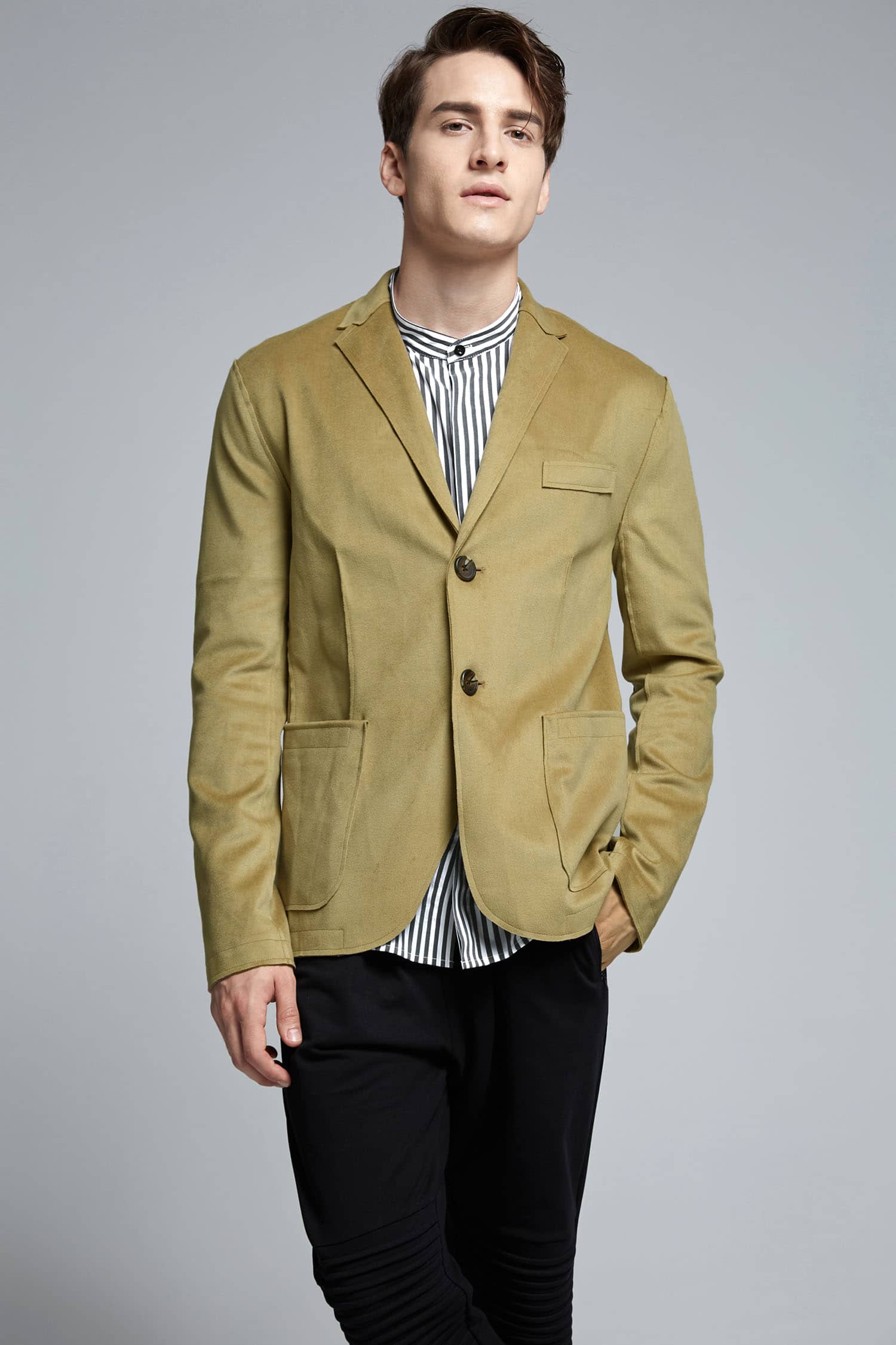 针织呢休闲西装外套,两粒扣翻驳领设计,圆摆,左胸手巾袋,下边两侧圆角大贴袋,袖肘贴补丁,整件搭缝毛边处理,赋予衣身层次感。