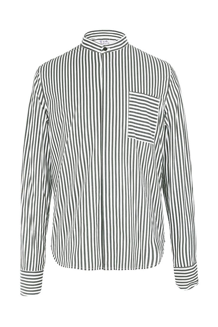 纯棉长袖衬衣,平直小立领,经典暗门襟,左前胸拼条直角贴袋,后背担干分割,后中牙签褶,弧形下摆,袖口冒尖角叠门,合体版型,打造舒适合体廓形。