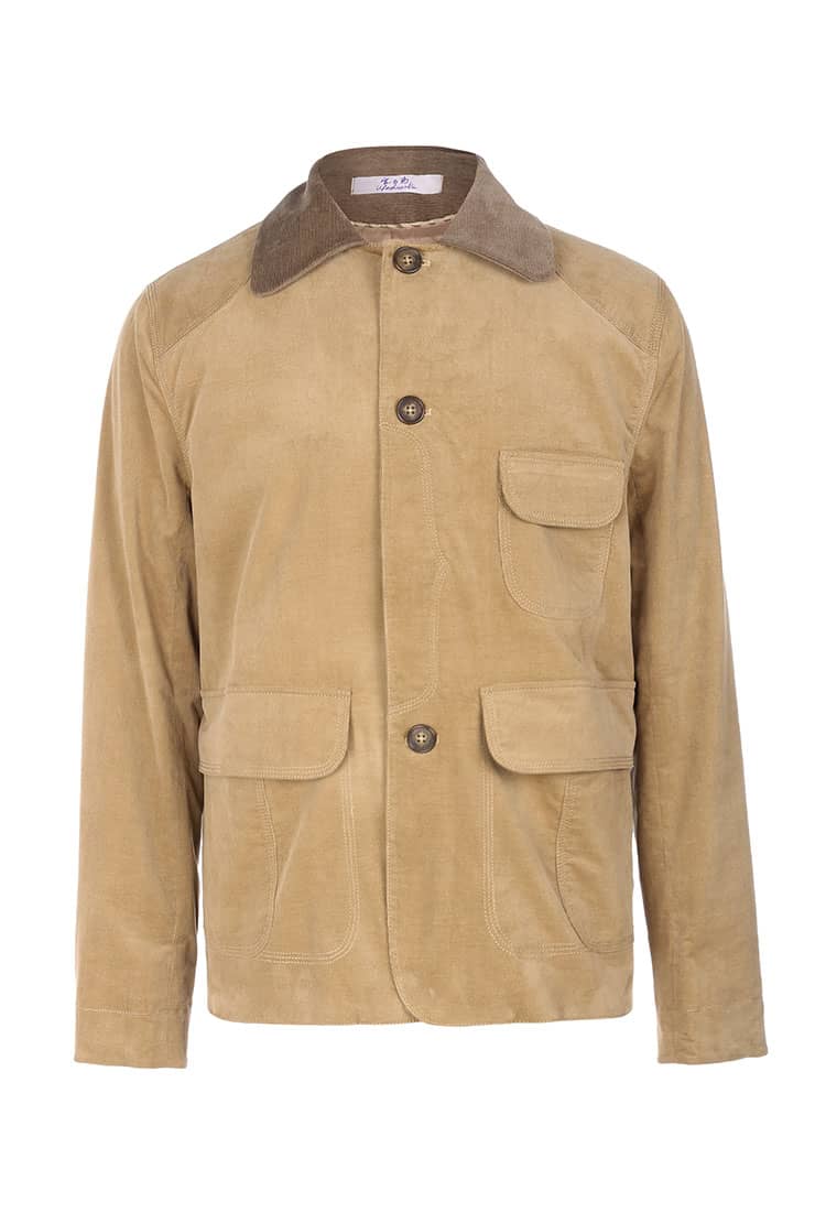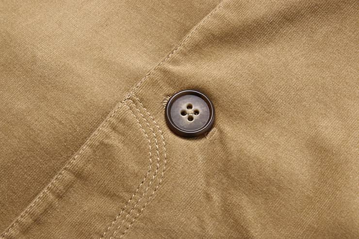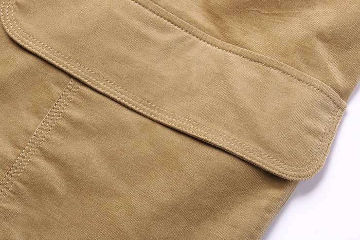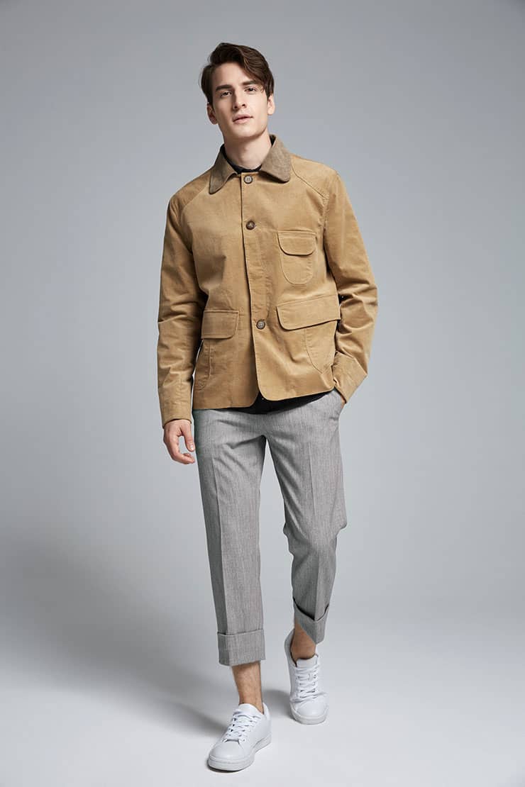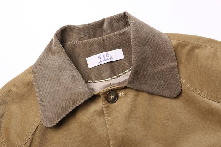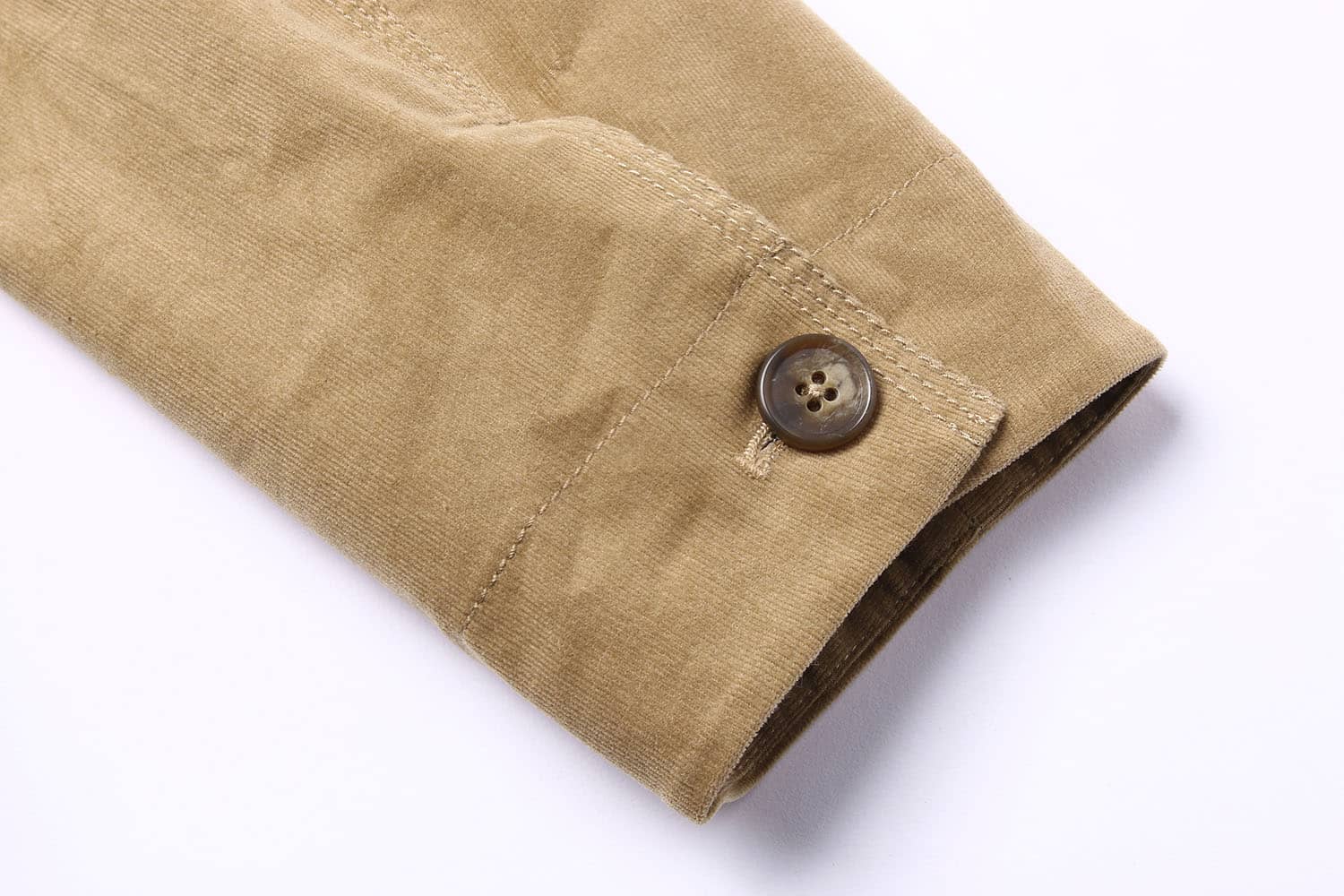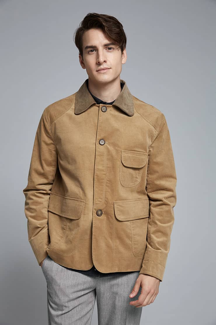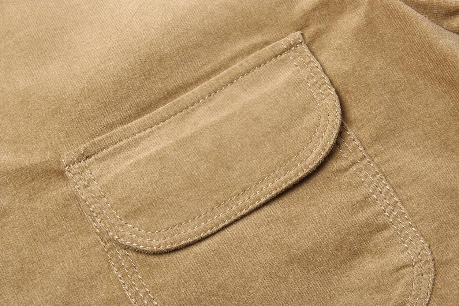 灯芯绒休闲外套,圆角撞色翻领,别致门襟设计,圆摆,前幅拼贴多个圆角口袋配袋盖,后身两侧腰袋盖装饰,整件衣身辅以三线走针,做工精细,款式时尚。