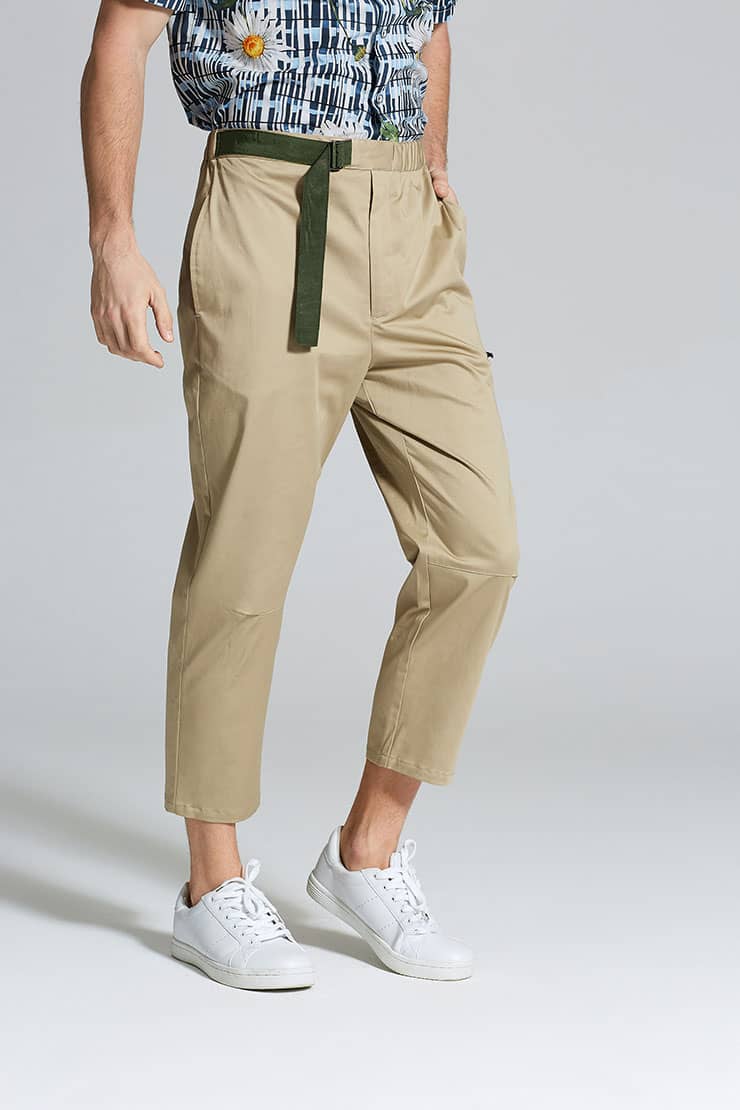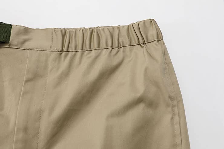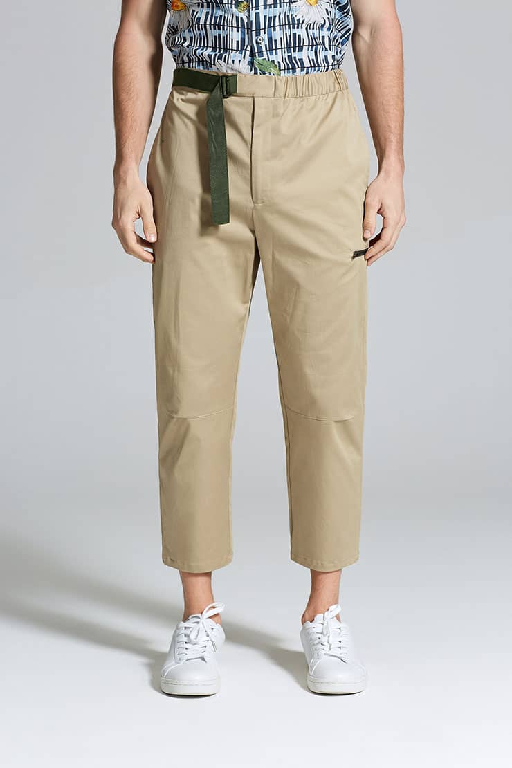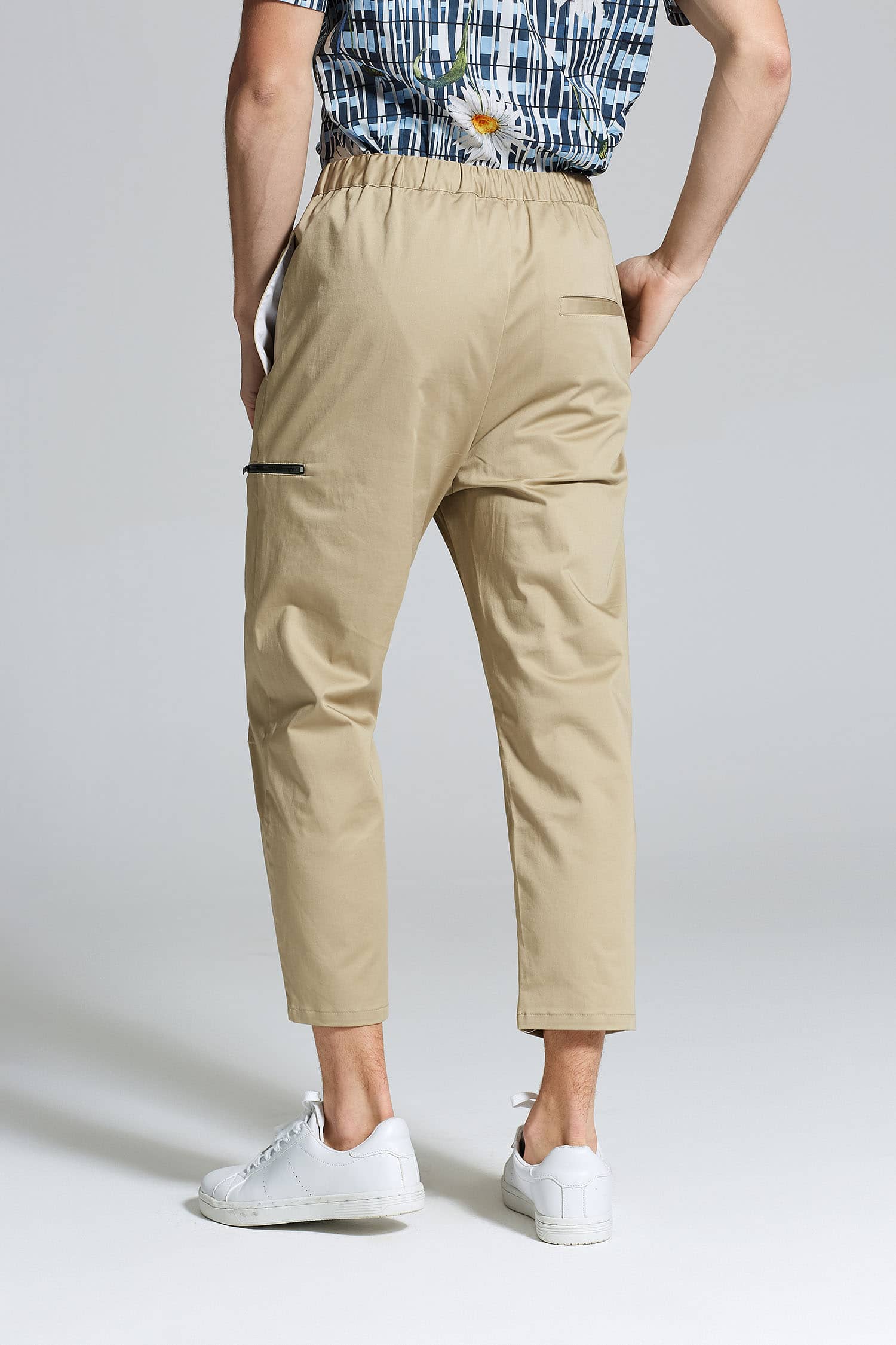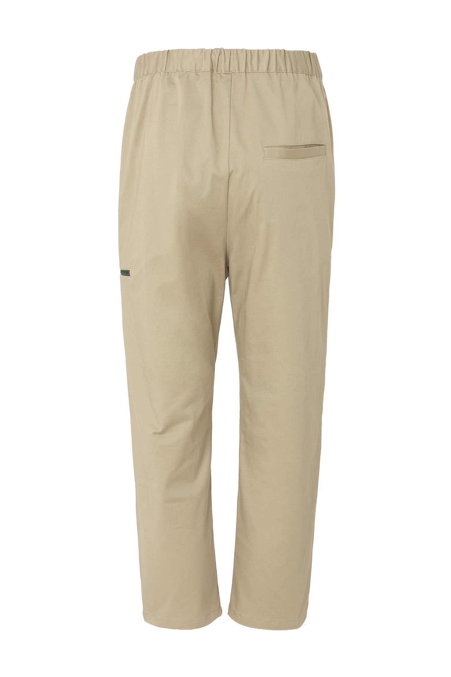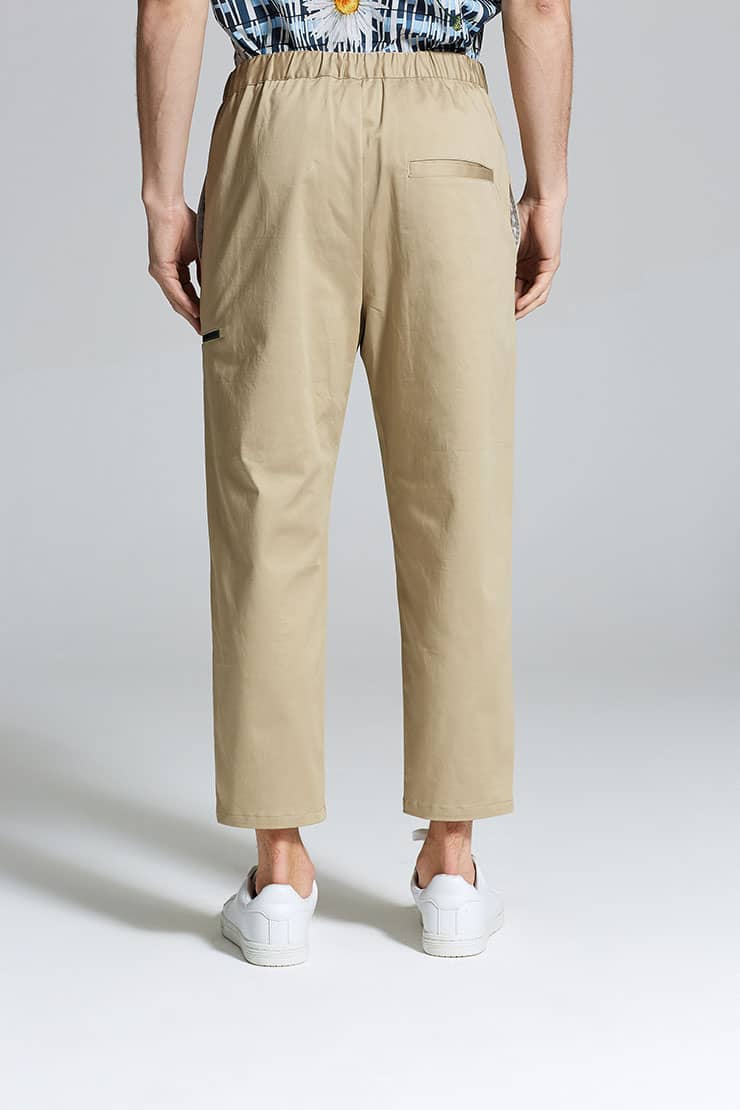 微弹棉质八分裤,腰头橡筋及织带做腰带装饰调节,侧口袋设计,前中真门襟装拉链,膝盖位褶裥,大腿围拉链装饰及后片开袋的不对称设计,与腰部呼应。
