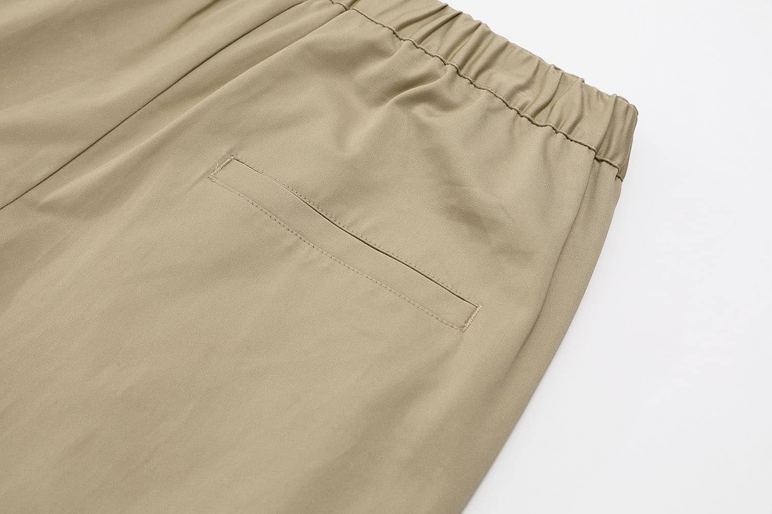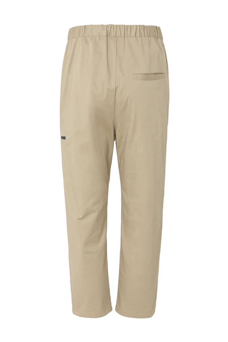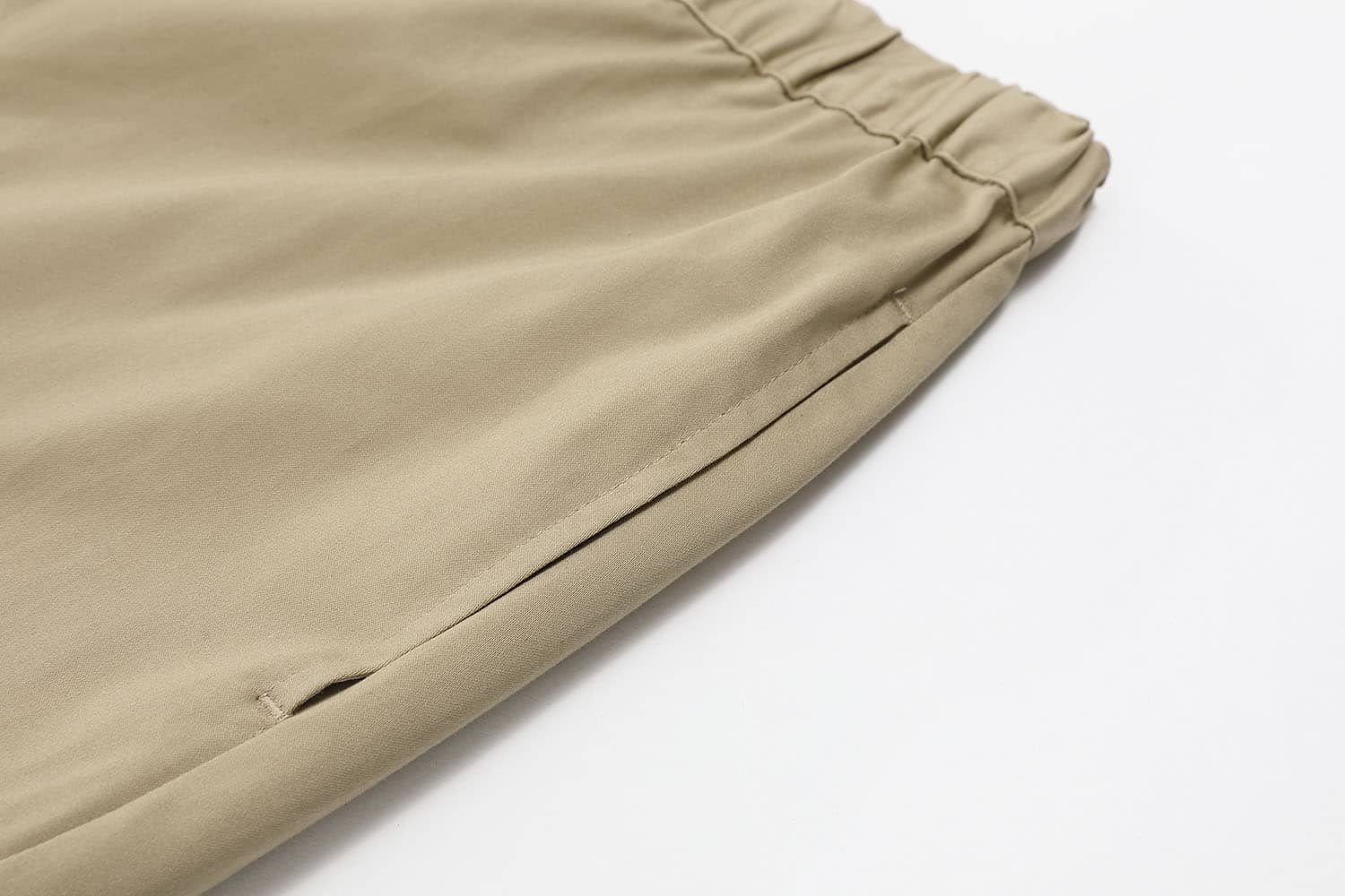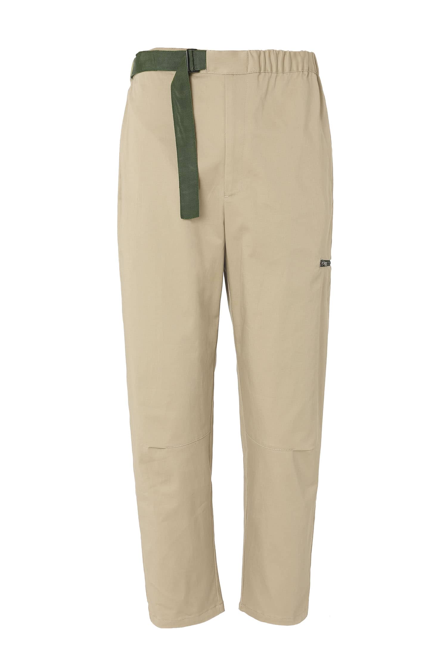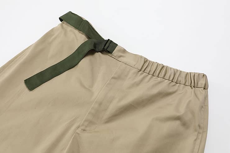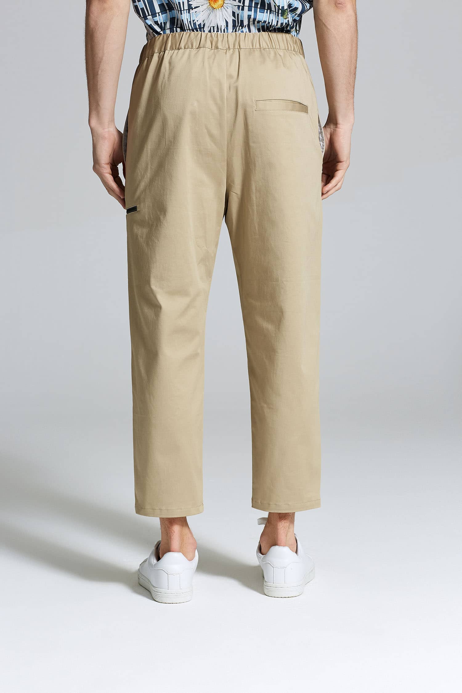 微弹棉质八分裤,腰头橡筋及织带做腰带装饰调节,侧口袋设计,前中真门襟装拉链,膝盖位褶裥,大腿围拉链装饰及后片开袋的不对称设计,与腰部呼应。