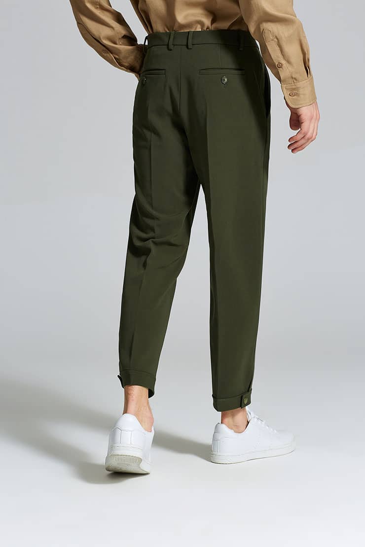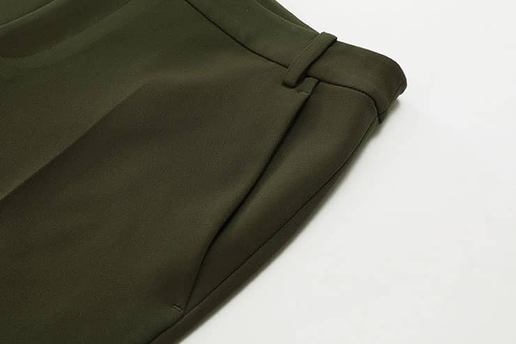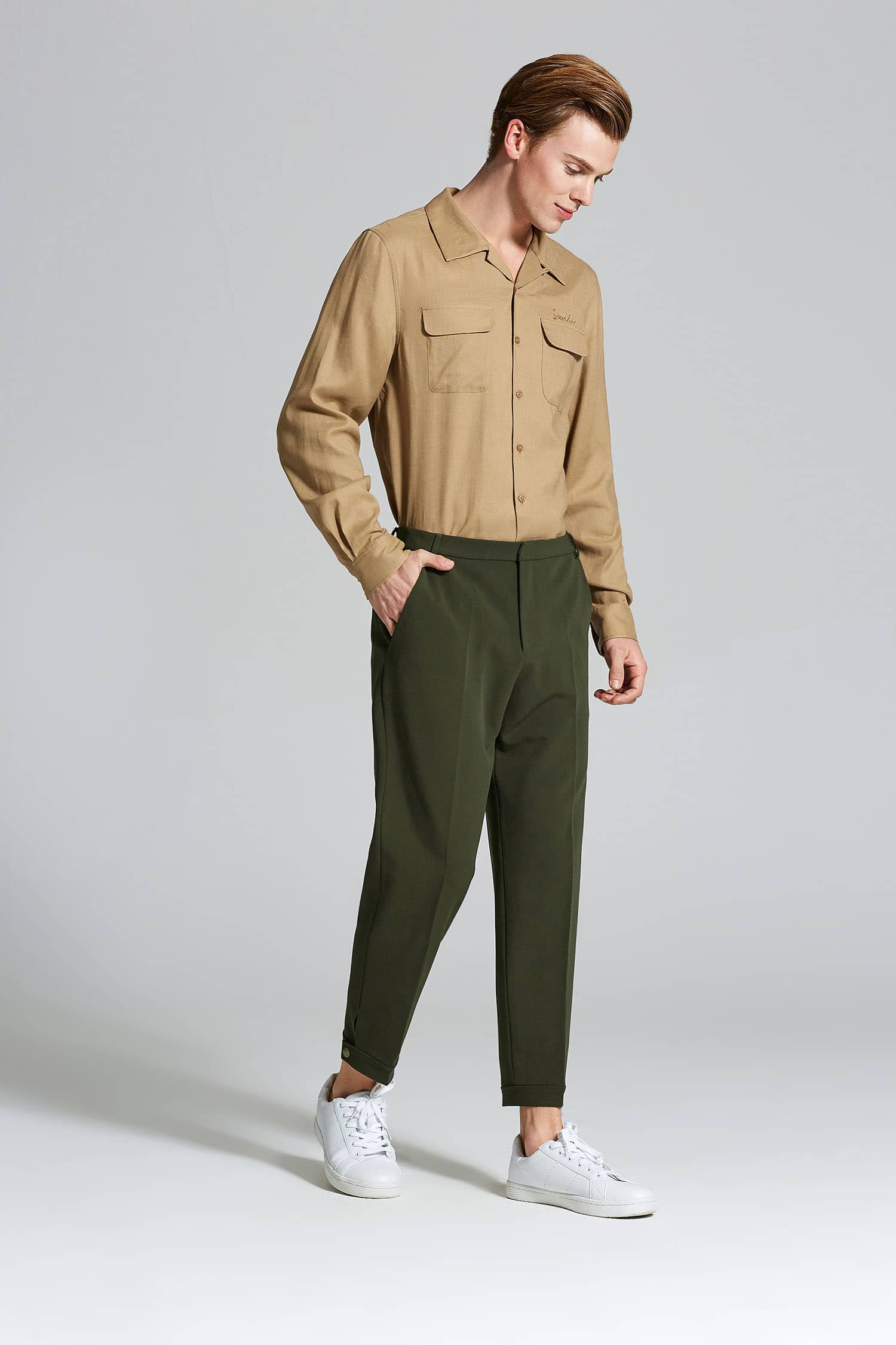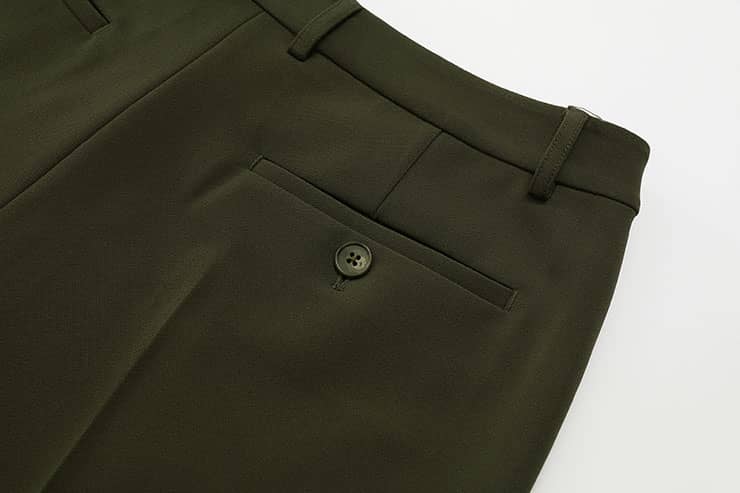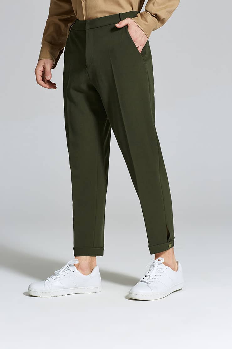 优质的聚酯纤维收脚口九分裤,前中腰头隐藏钩扣与底扣二次加固,裤子两侧对称斜插袋,两端打枣,脚口开衩收口,打破刻板印象,令穿着更加有型。