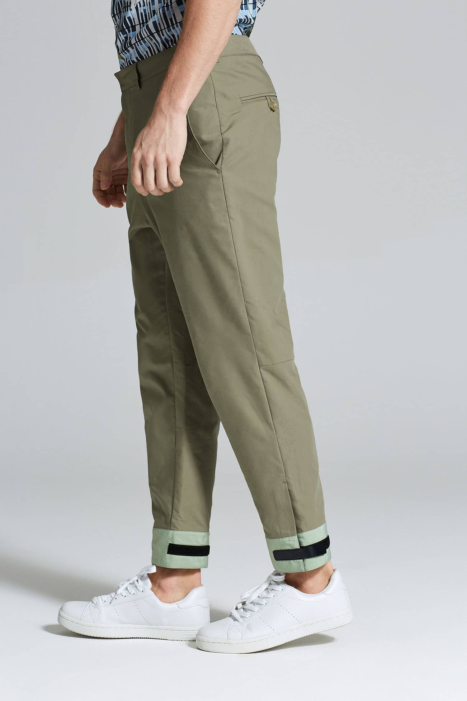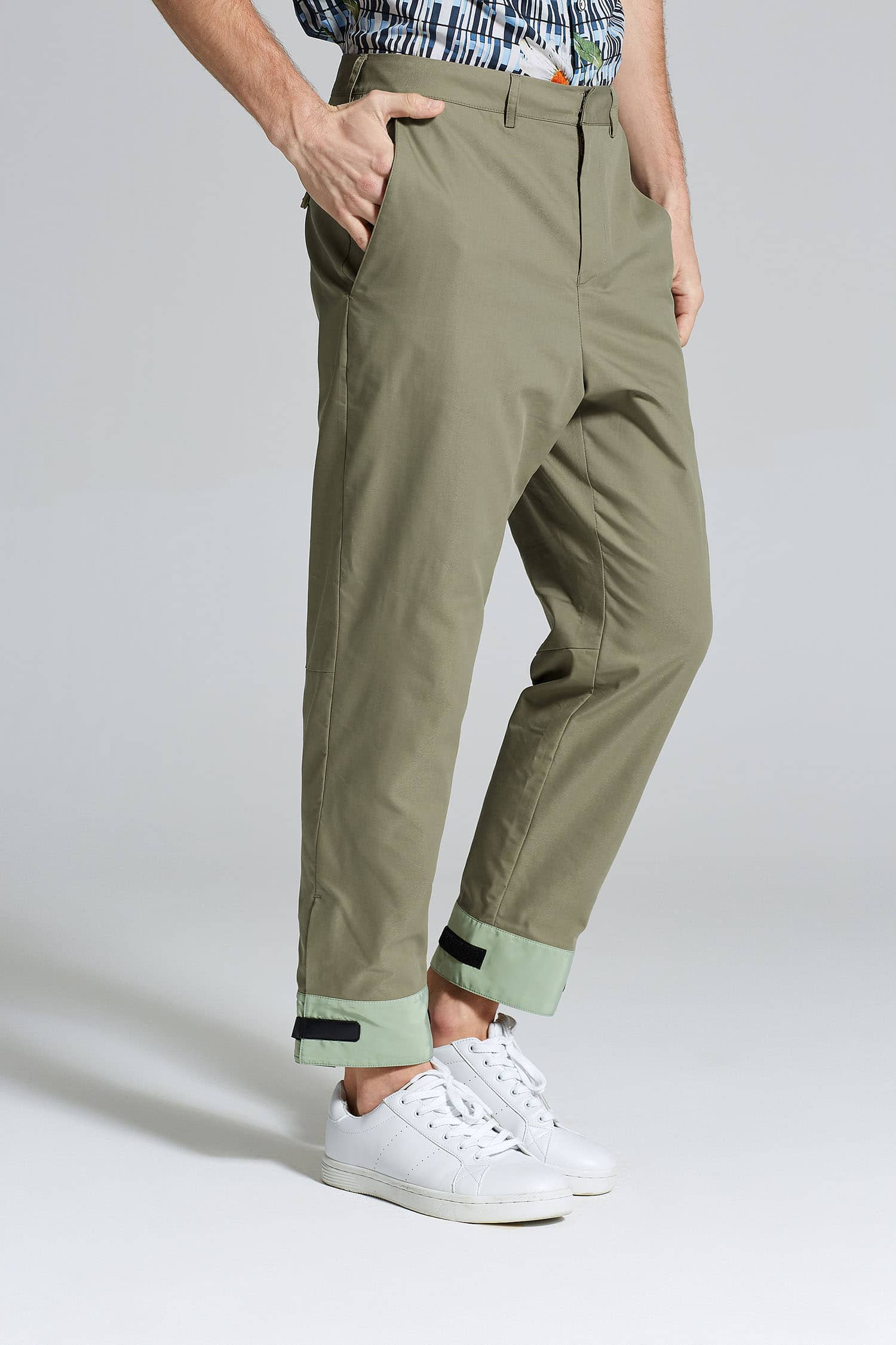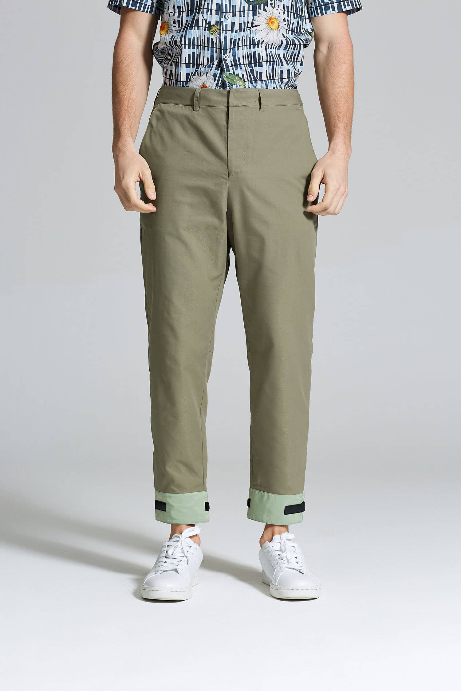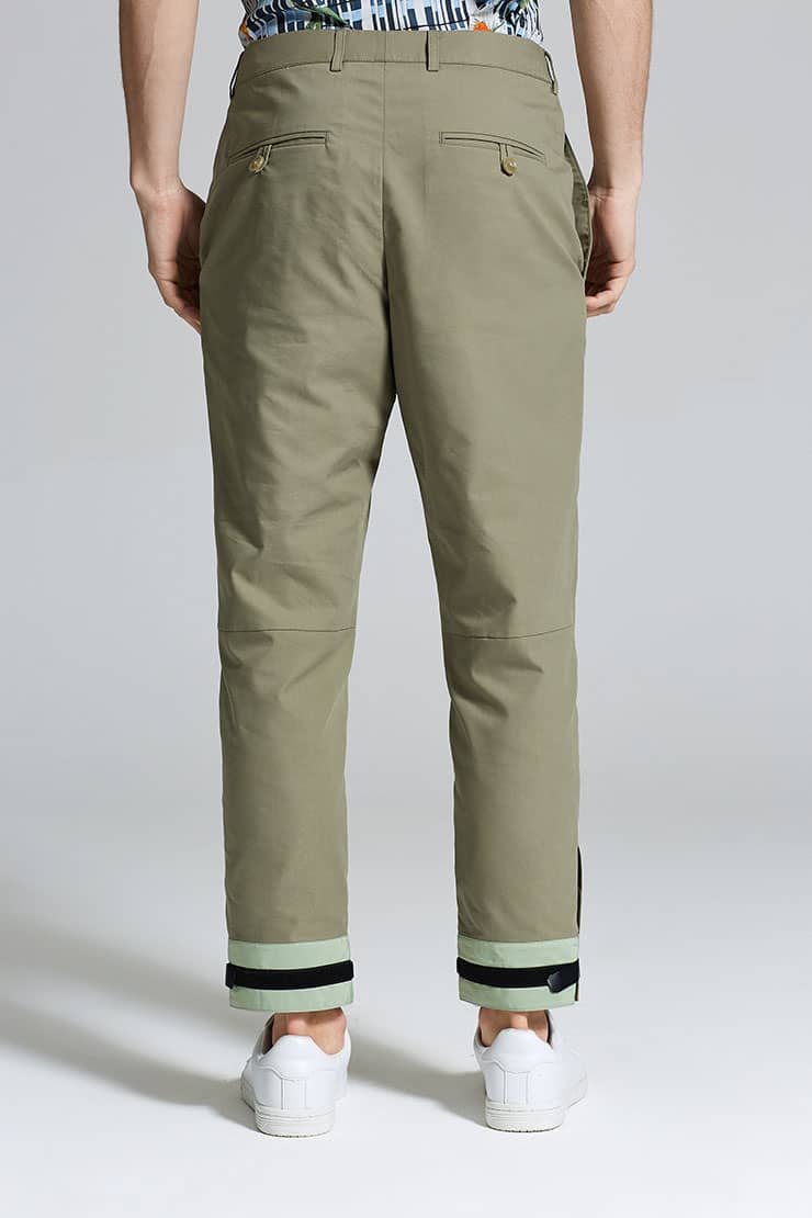 棉质休闲九分裤,门襟装拉链,左右两侧对称斜插袋,后膝围做破骨结构,脚口拼接撞色面料,开衩,配合新型魔术贴点缀,英伦风格中添加了运动气息。