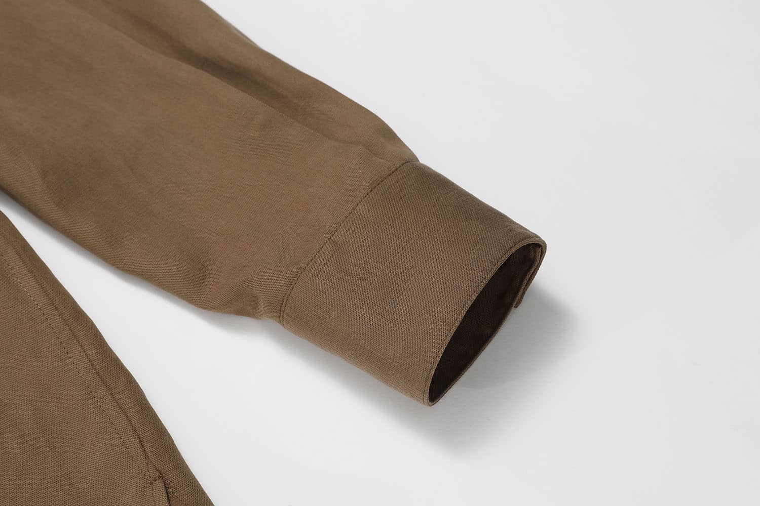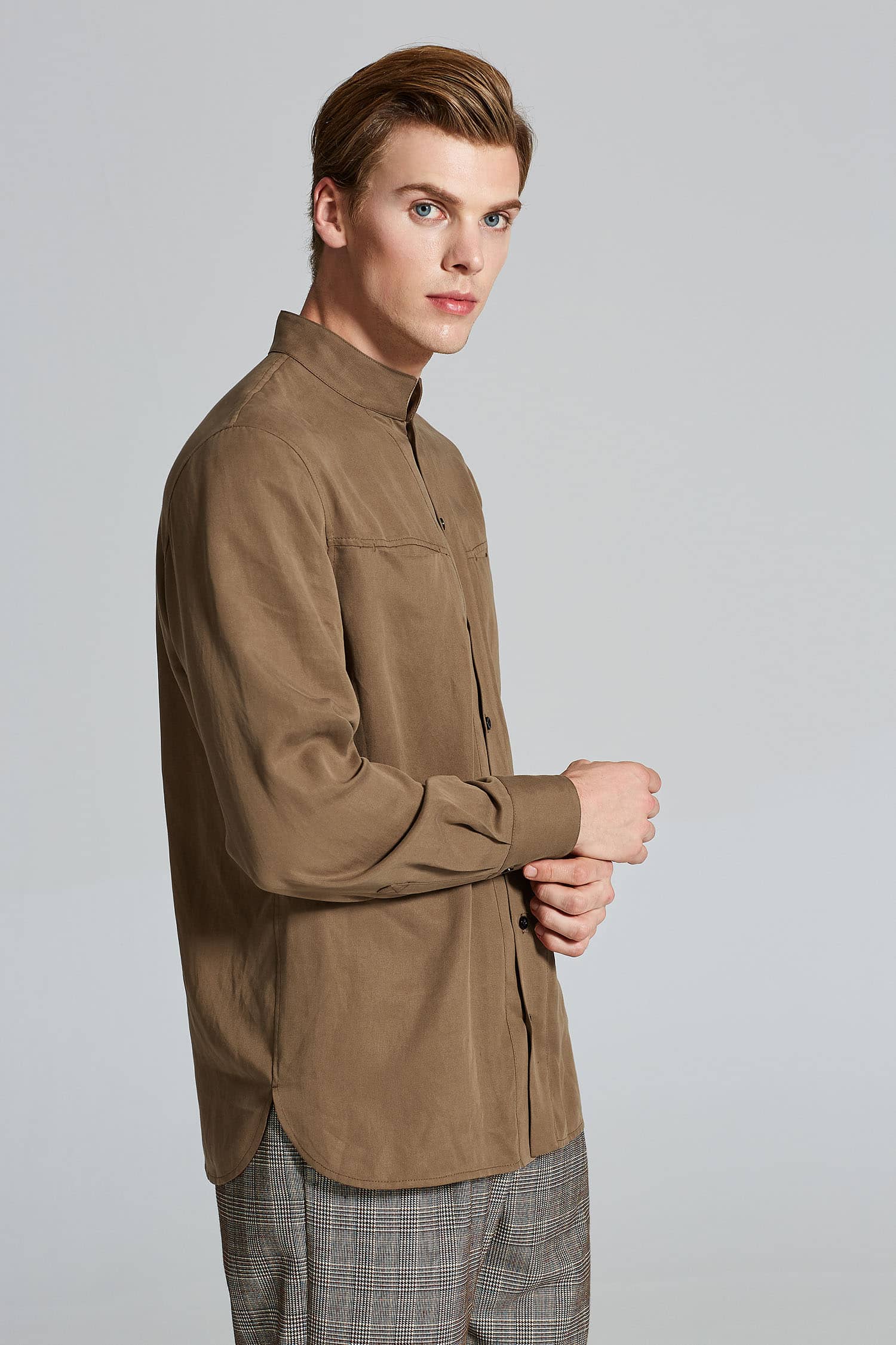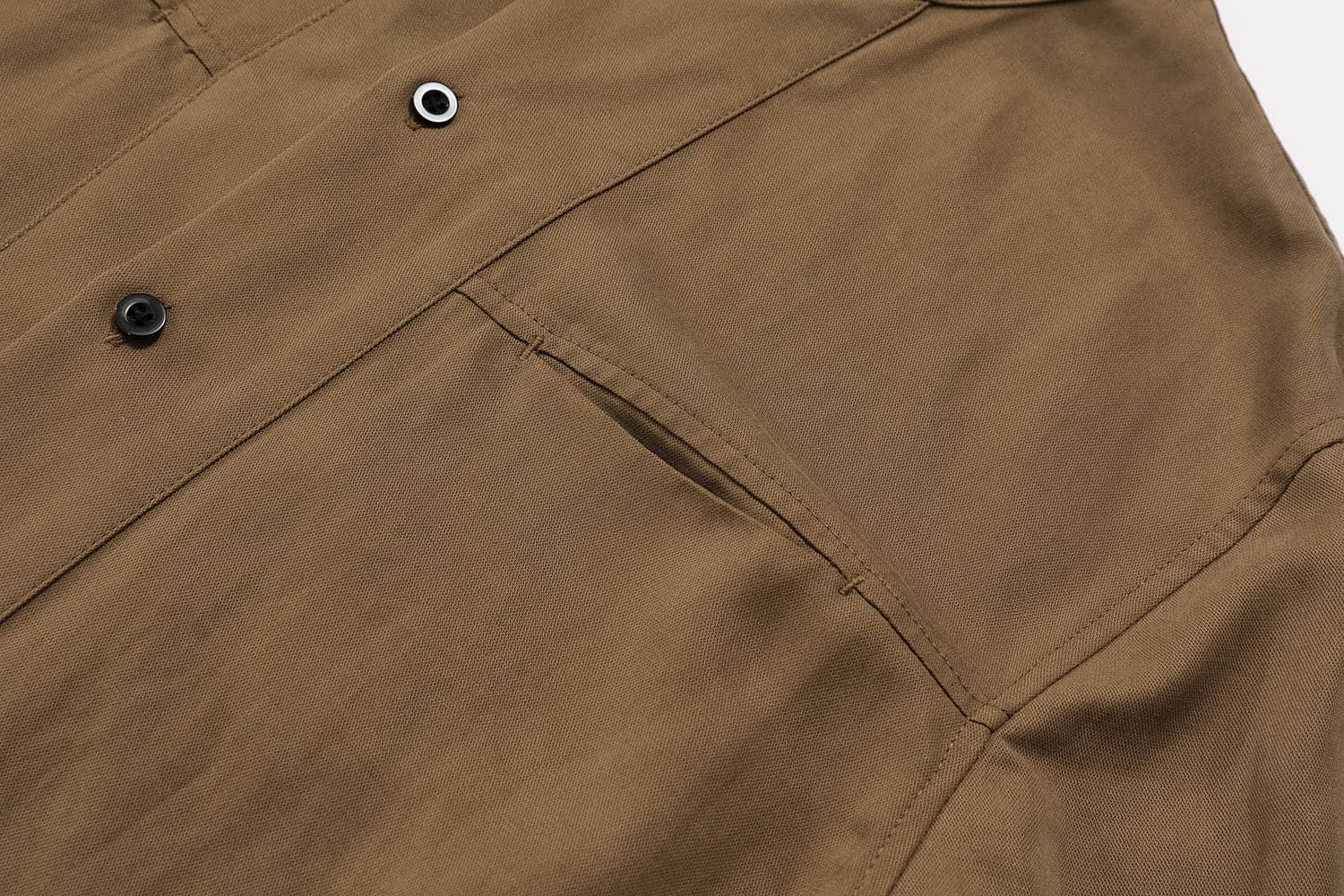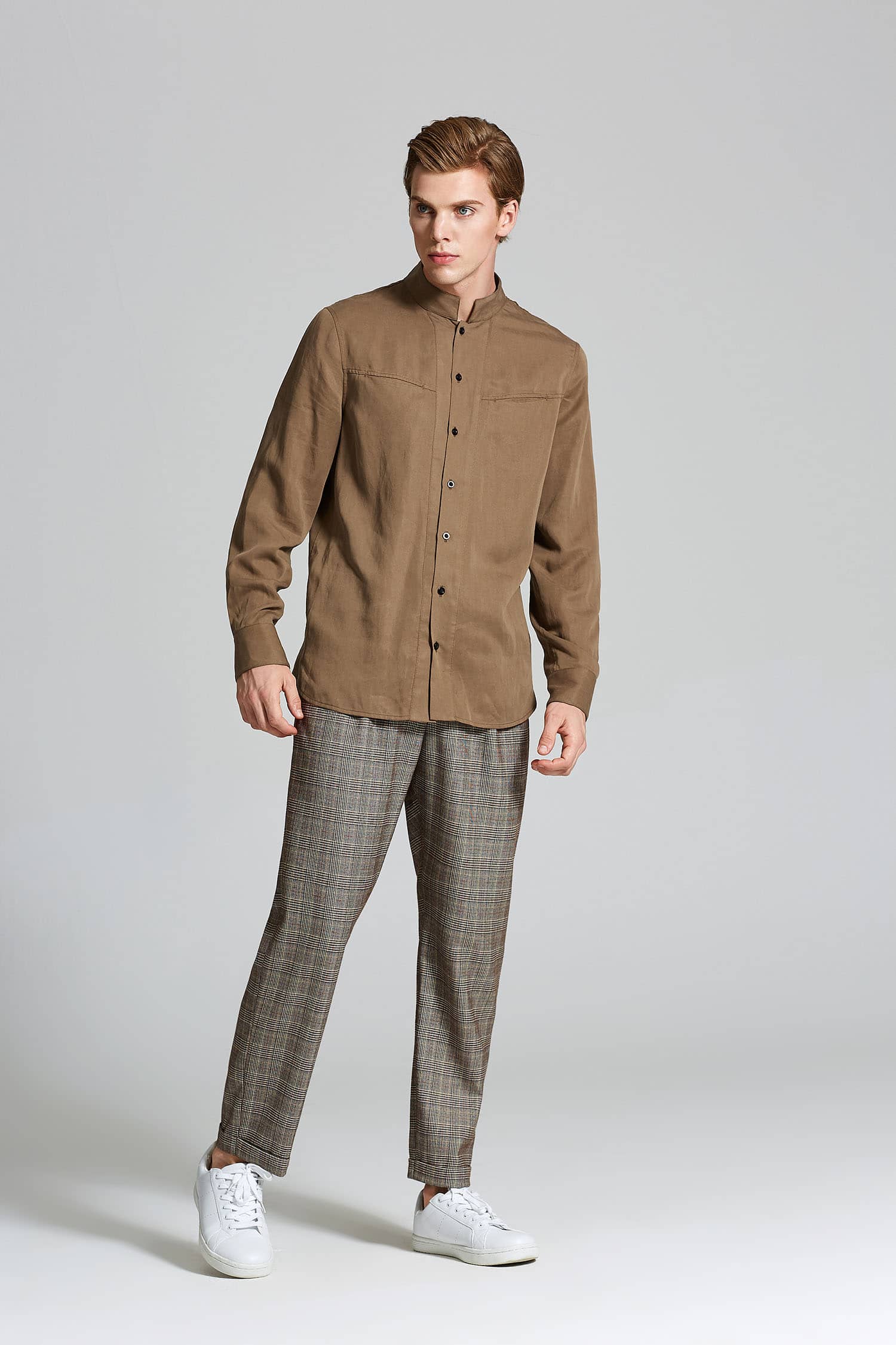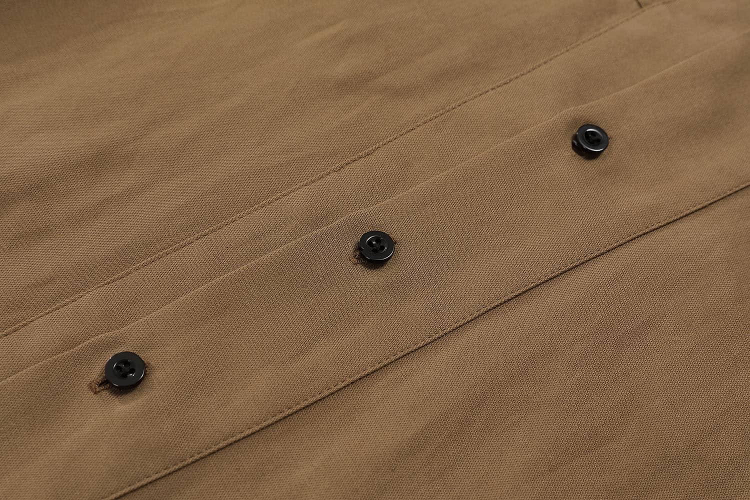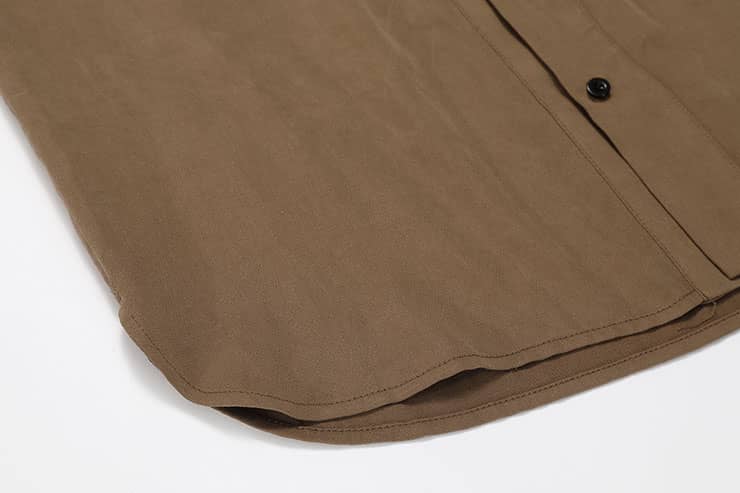 棉麻混纺长袖衬衣,前胸对称破缝内藏口袋,宽松版型设计,弧形下摆,两侧开衩,线条处理恰到好处,呼应轻松随性基调。